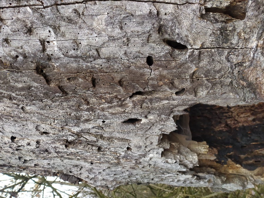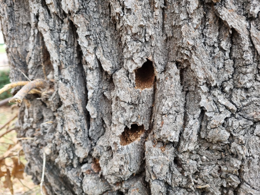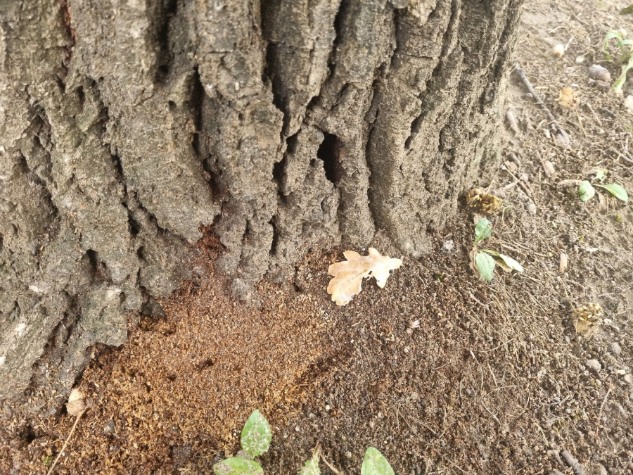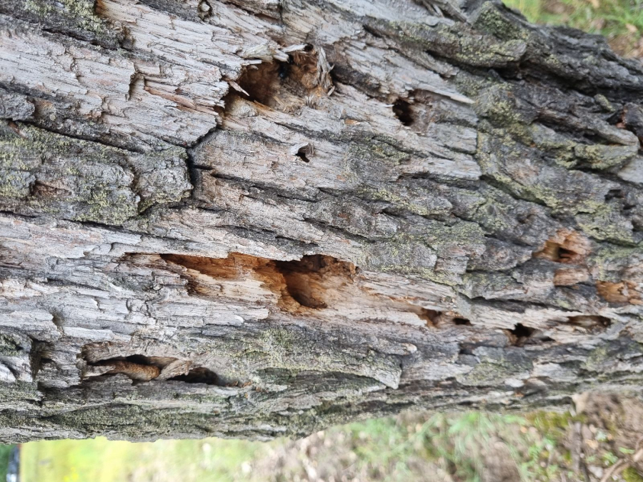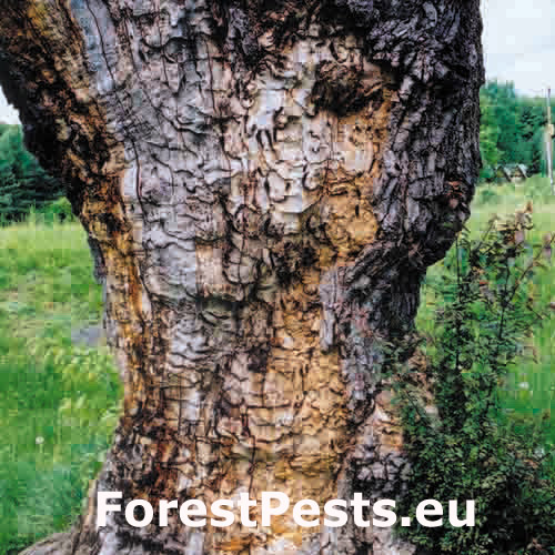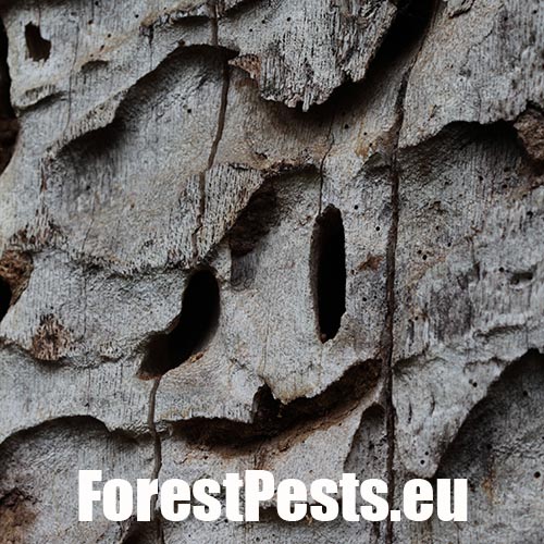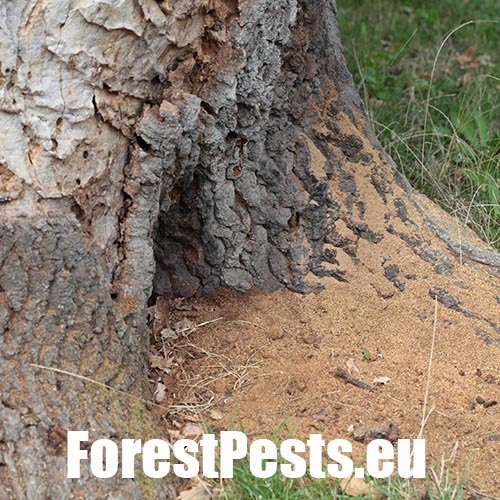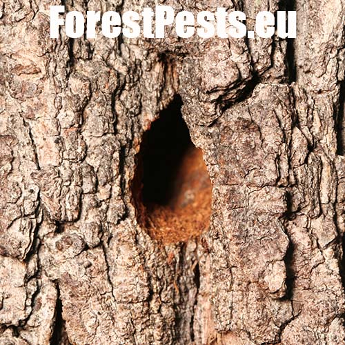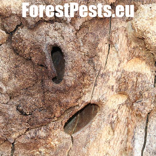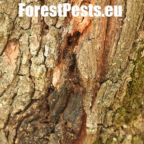 Veľký čierny chrobák. Na kmeni sú viditeľné veľké výletové otvory. V jednom strome sa vyvíja aj niekoľko generrácií a tak strom môže byť doslova prevŕtaný larvami. Na báze kmeňa jemná hnedá drvinka.