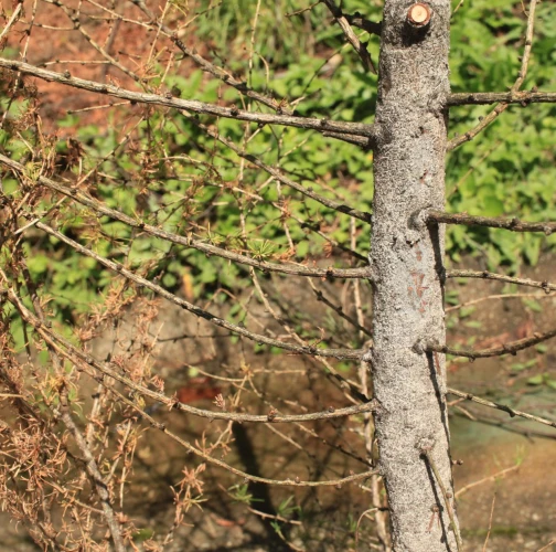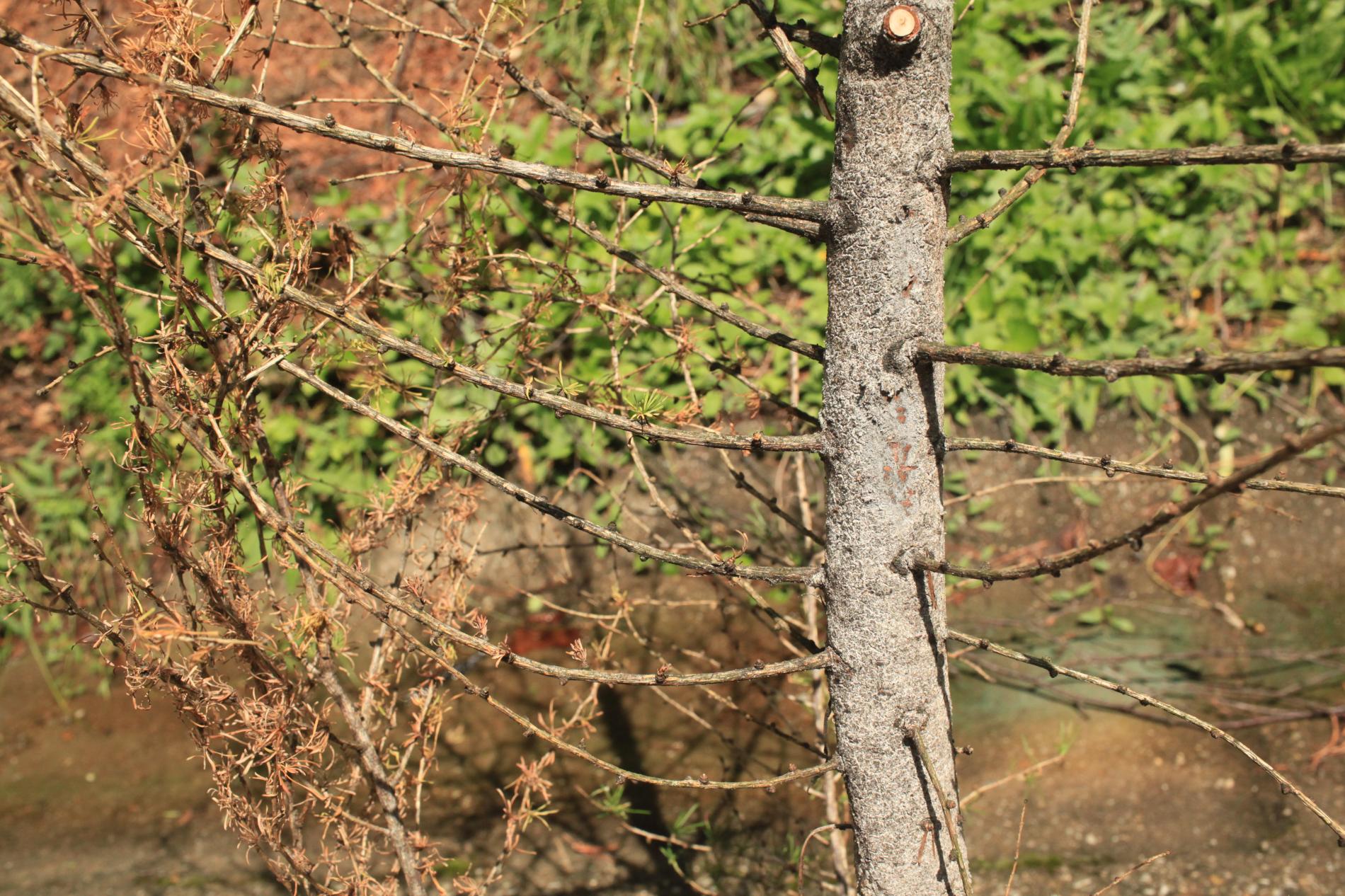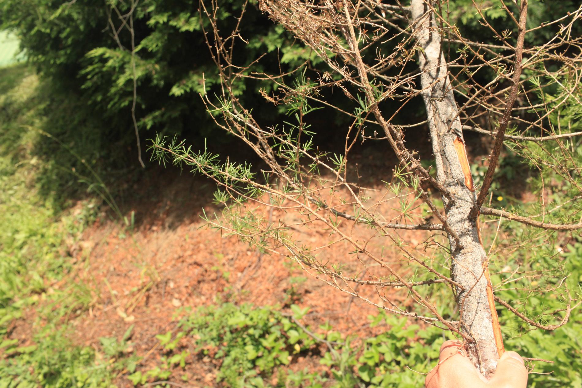 Odumieranie vetiev a celých korún mladých smrekovcov do 15 rokov.