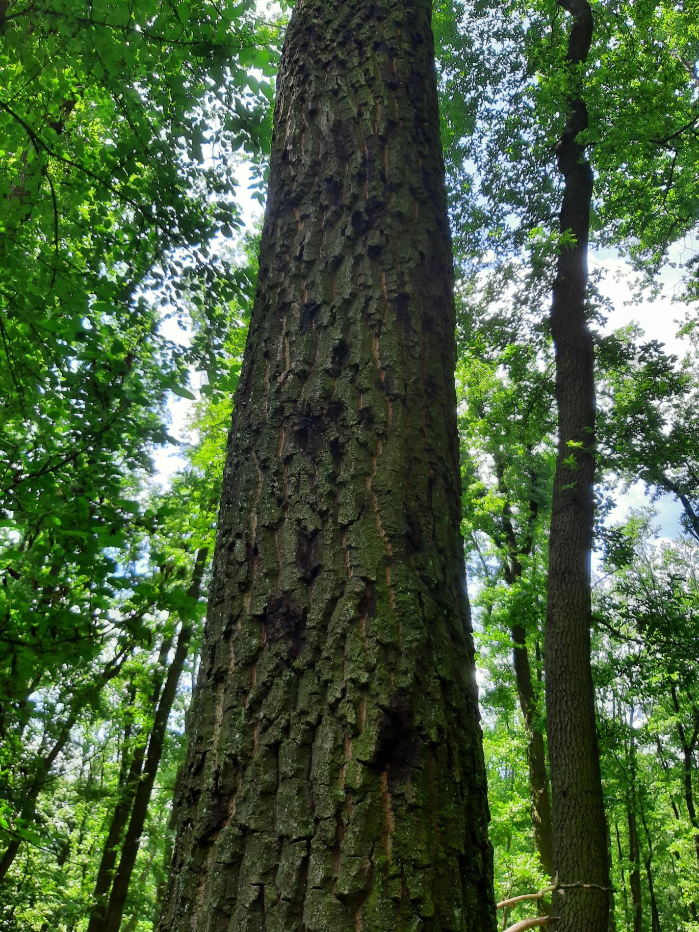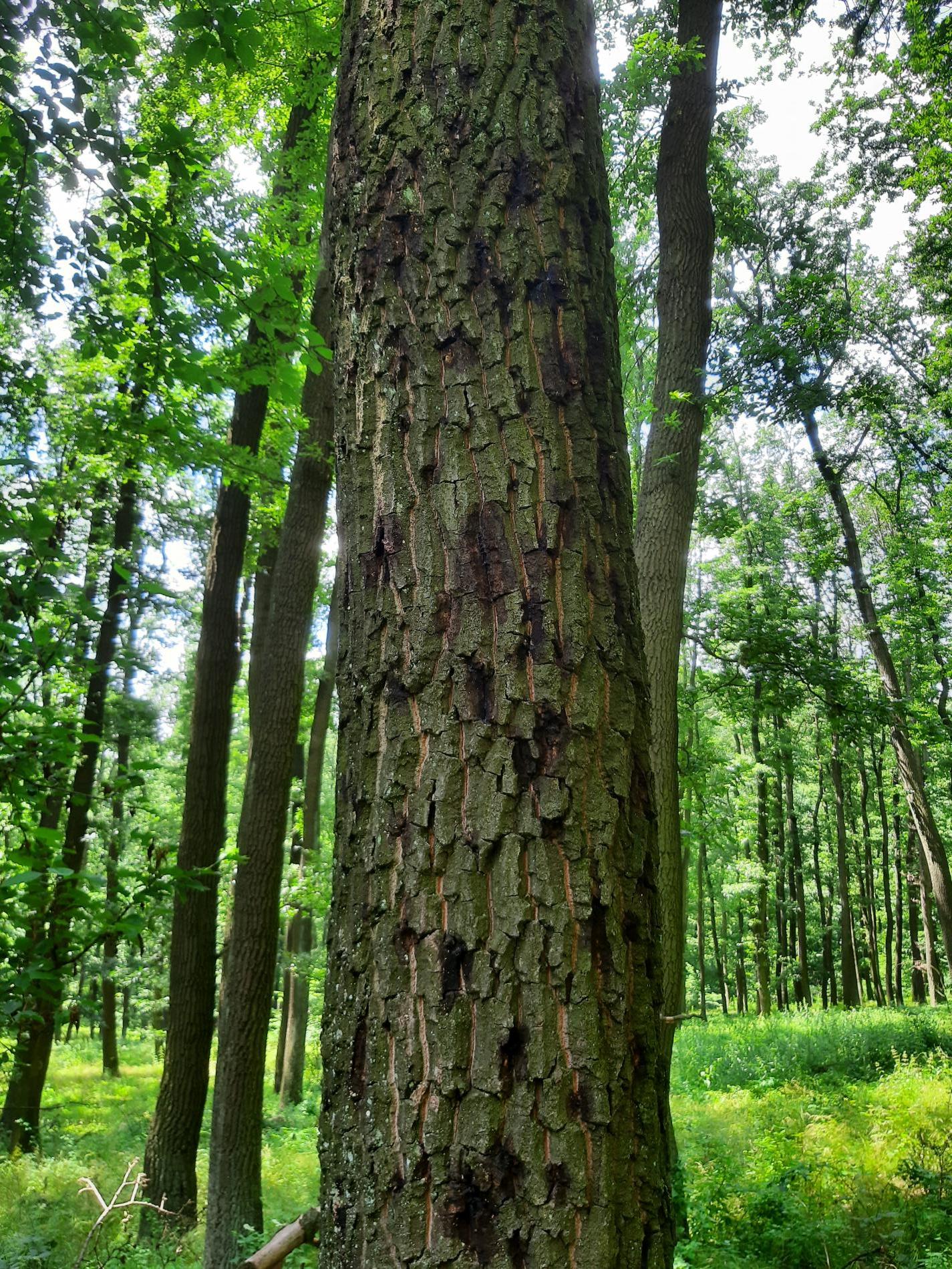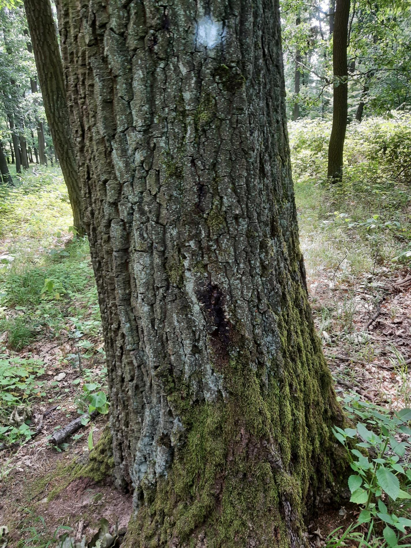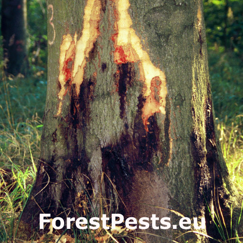 Mokvajúce škvrny na kmeni.