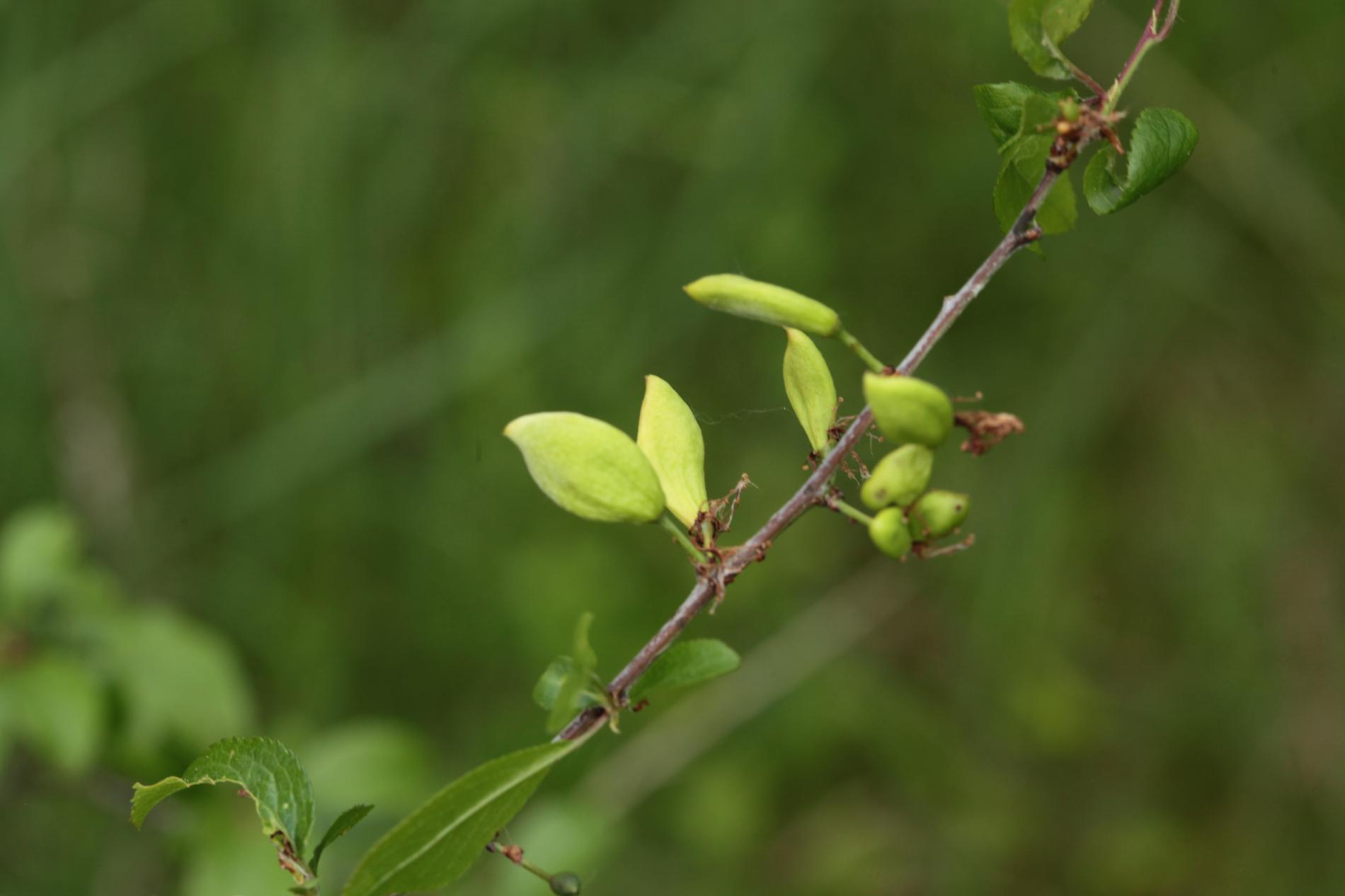 Pretiahnuté, deformované plody, svetlo zelenej až zeleno červenej farby. Na povrchu môže rásť mycélium. Deformácia vetiev.