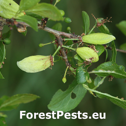 Taphrina pruni je hubový patogén, ktorý primárne infikuje dreviny rodu Prunus spp., medzi ktoré patria rôzne druhy sliviek, čerešní a iné druhy rodu Prunus. Z infikovaných kvetov vznikajú zdeformované plody, ktoré sa vyvíjajú rýchlejšie než zdravé plody. Majú pretiahnutý tvar, sú ploché a pokryté bielou vrstvou húb. V týchto plodoch sa nevytvára kôstka. Počnúc júlom, choré plody postupne odpadávajú. Keď Taphrina pruni infikuje strom Prunus, vyvoláva aj vývoj abnormálnych výrastkov a zdurenín na konároch a výhonkoch. Závažnosť deformácií spôsobených hubou Taphrina pruni sa líši v závislosti od konkrétneho druhu Prunus. Aj tvar deformovaných plodov sa výrazne lýši v závislosti na druhu rodu Prunus. V niektorých prípadoch môže infekcia viesť k výrazným deformáciám v štruktúre konárov, čo má za následok zakrpatený alebo skrútený rast. Taphrina pruni zvyčajne infikuje stromy na začiatku jari, keď sú spóry húb rozptýlené vetrom alebo dažďom. Spóry prenikajú do tkanív hostiteľskej rastliny. Neskôr huba prerastá do kvetov a vyvíjajúcich sa plodov. Hube sa darí vo vlhkých podmienkach a infekcia sa môže šíriť postriekaním vetrom, vodou alebo hmyzími vektormi.