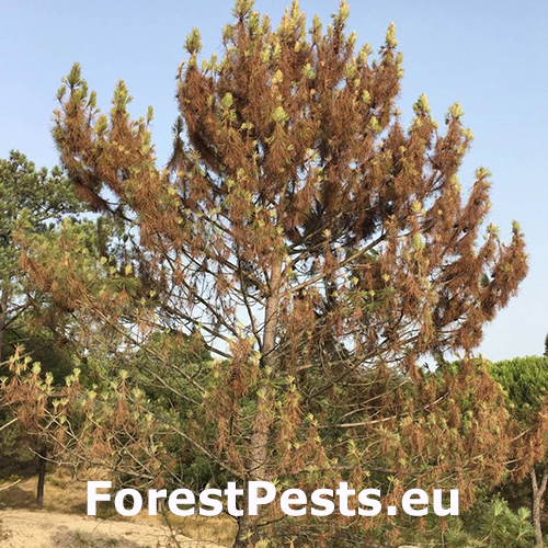 Na postihnutých boroviciach sa objavuje postupné žltnutie a hnednutie ihličia, ktoré vedie k jeho úplnému vysychaniu a predčasnému opadu.