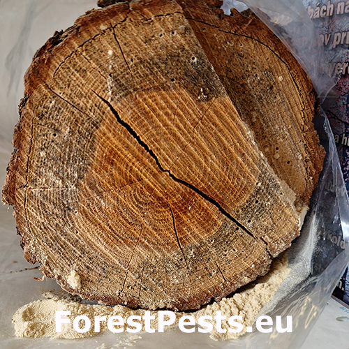 Kruhové výletové otvory, biela veľmi jemná drvina.