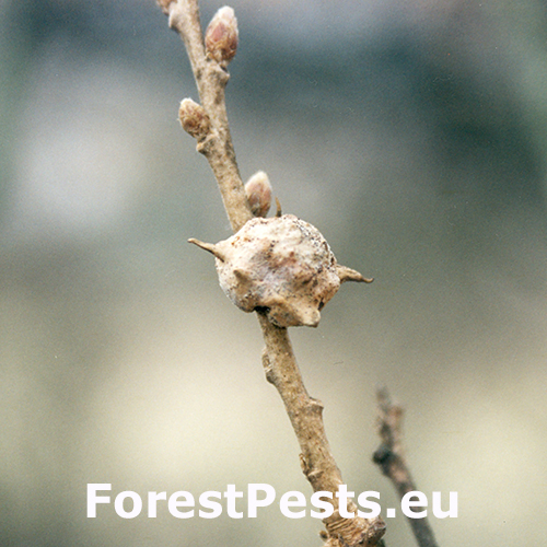 Nepravidelná hálka je veľká 8 – 15 mm. Súdkovitá hálka má „korunu“ tvorenú 4 – 7 výbežkami. Tvorí sa na vetvičke. Je sivohnedá a má lepkavý povrch. Po vyschnutí je hnedá a už nelepí. Je známa len asexuálna generácia.
