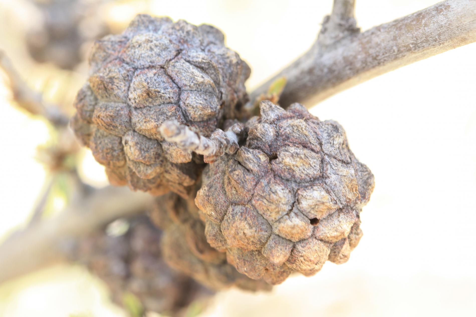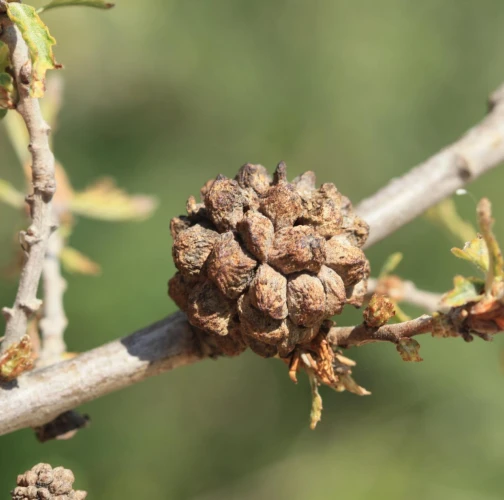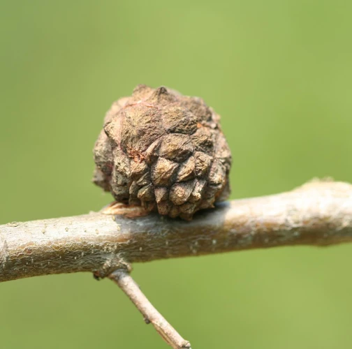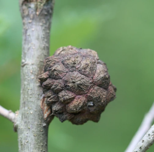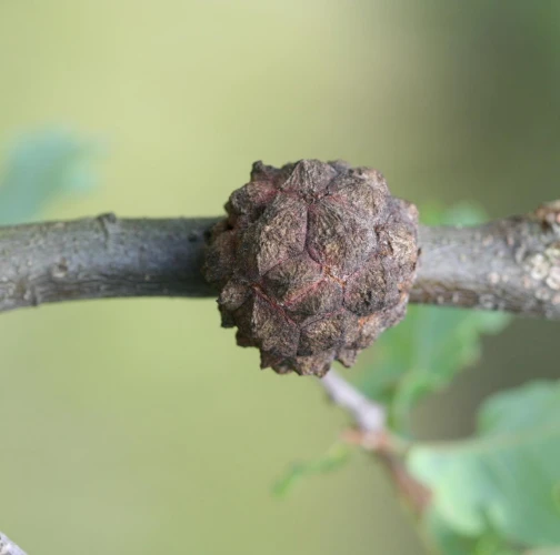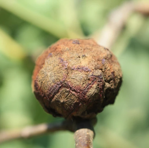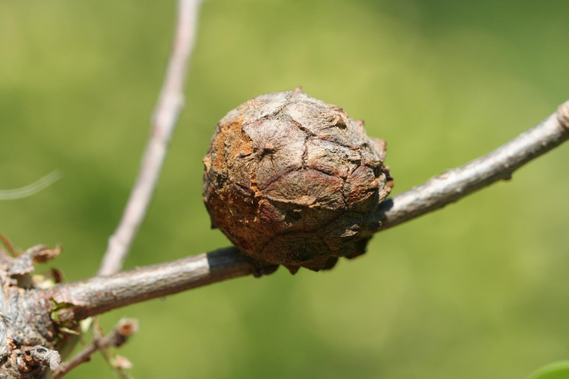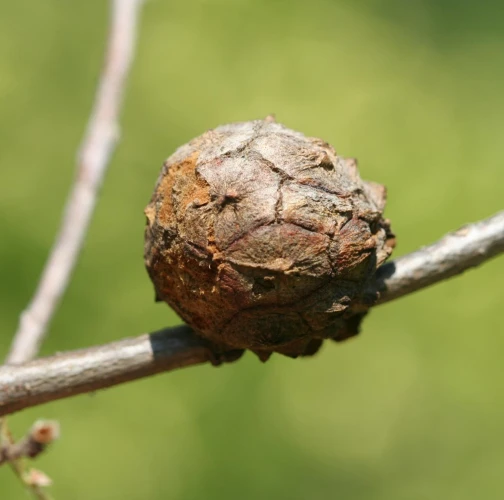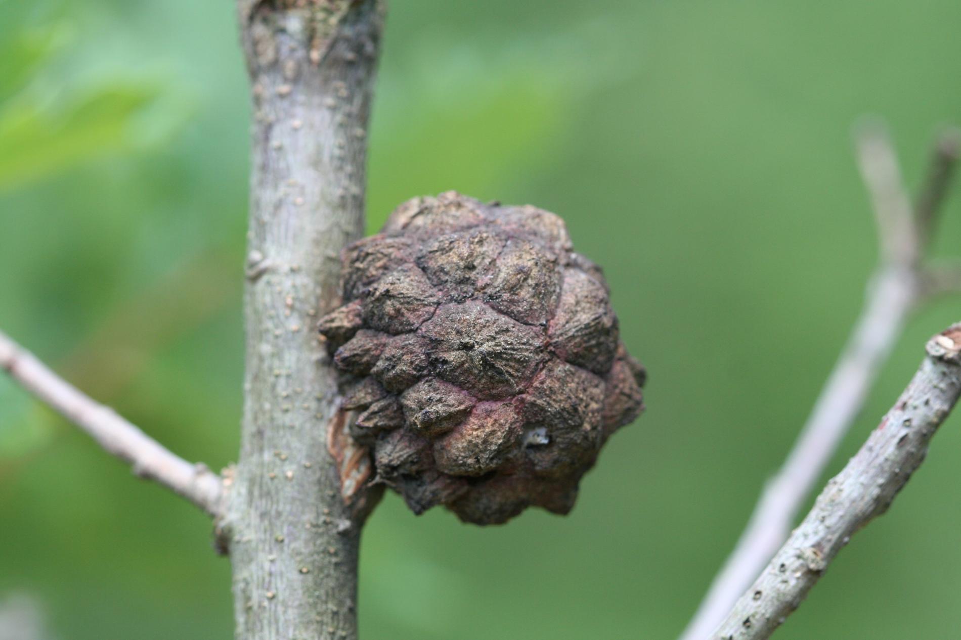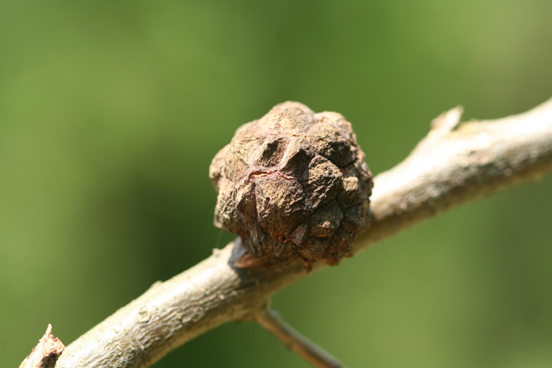 Hálky veľkosťou asi 2 cm na vetvičke. Hálkaje tvorená viacerými 5-6 uholníkovými výrastkami.