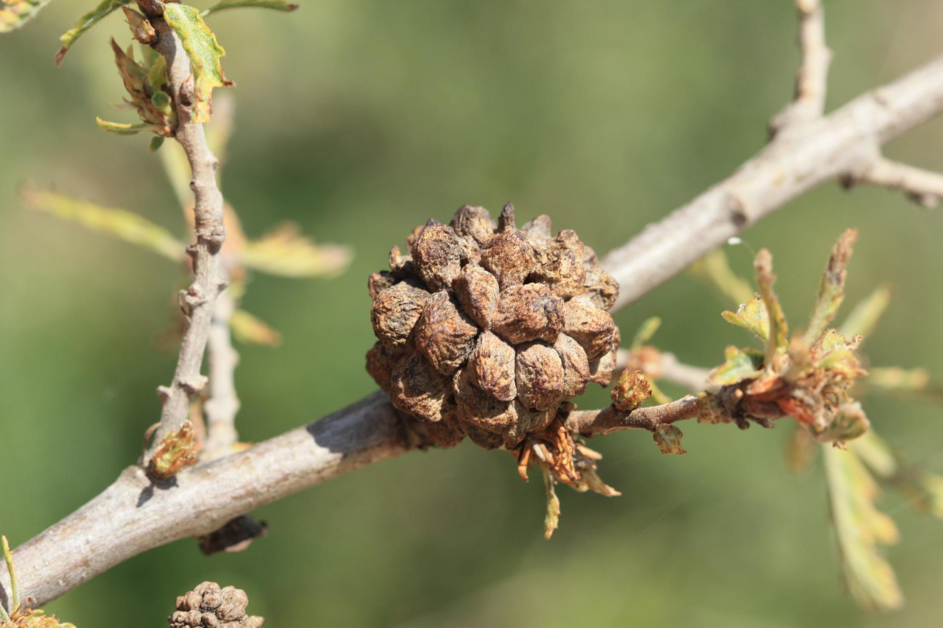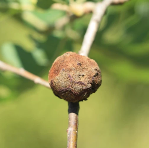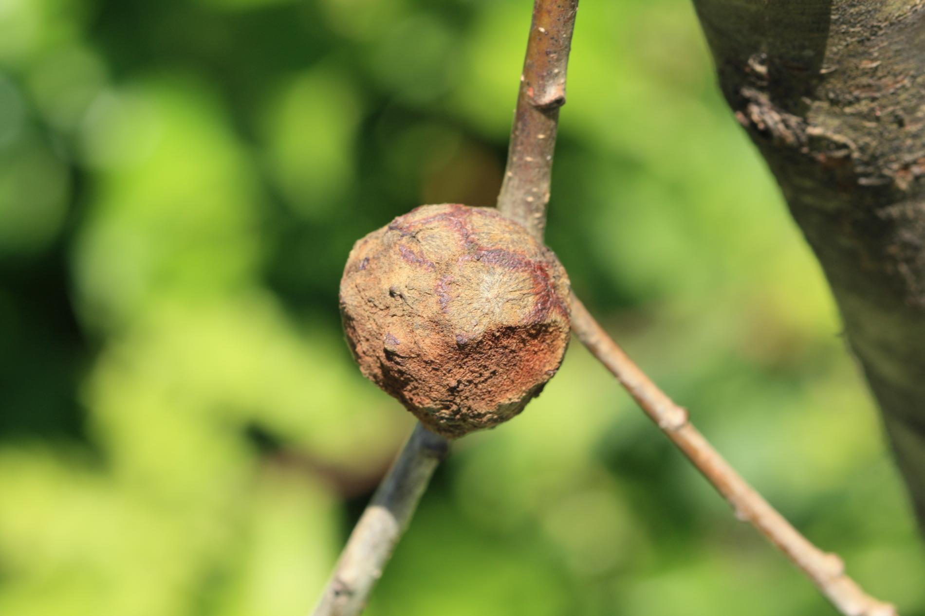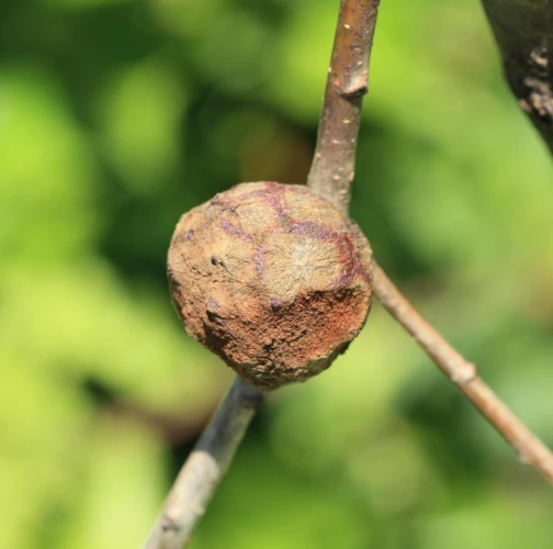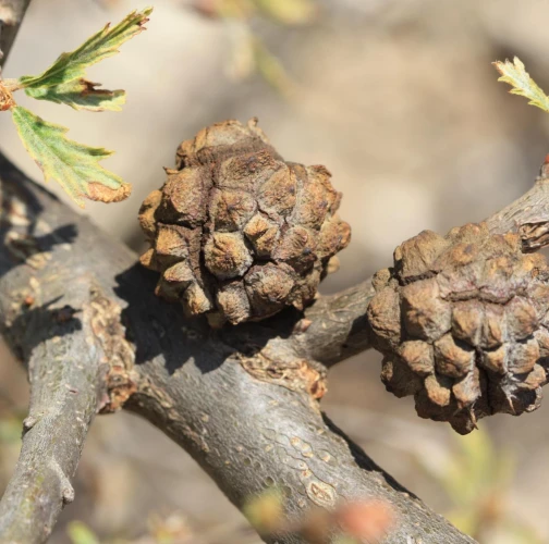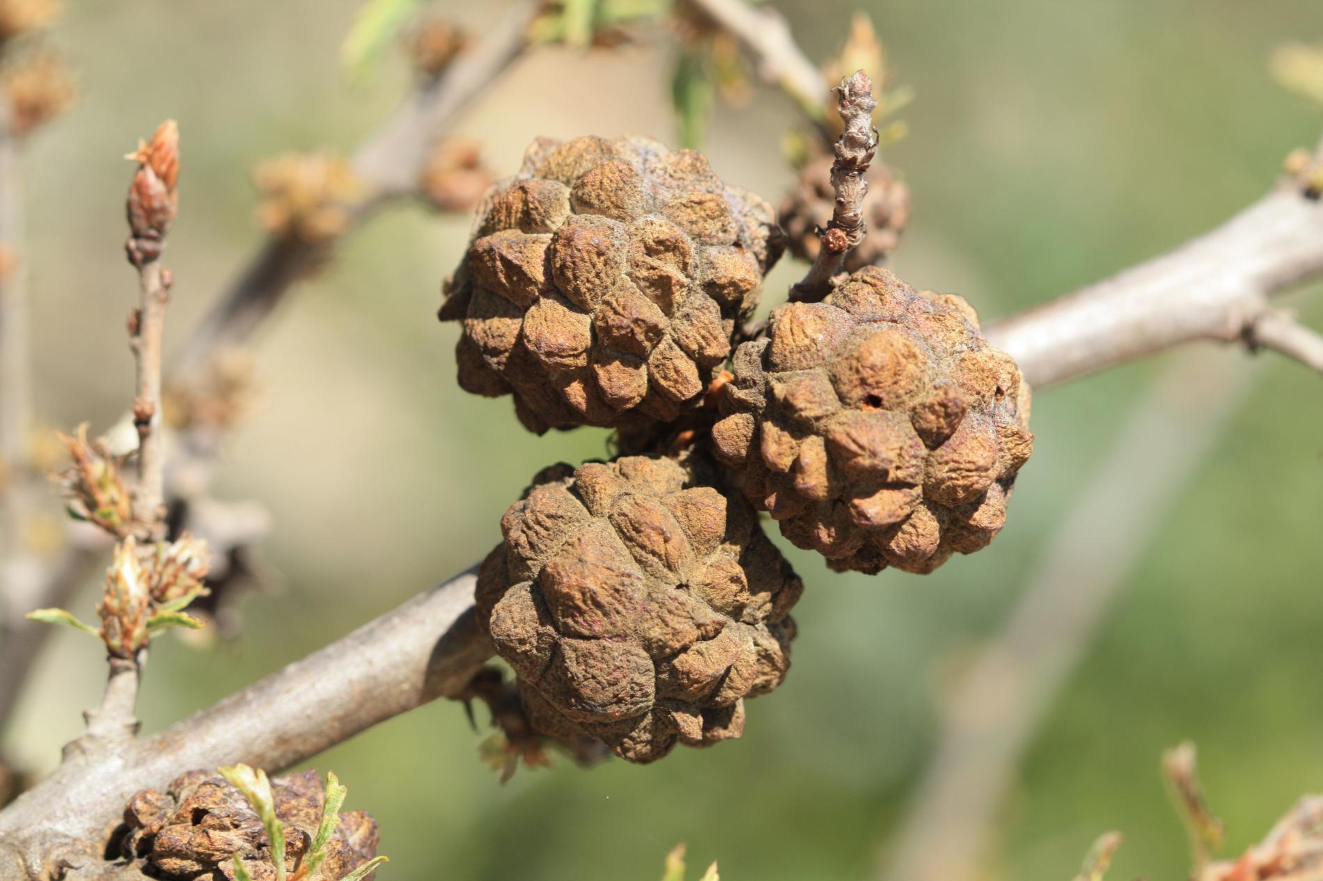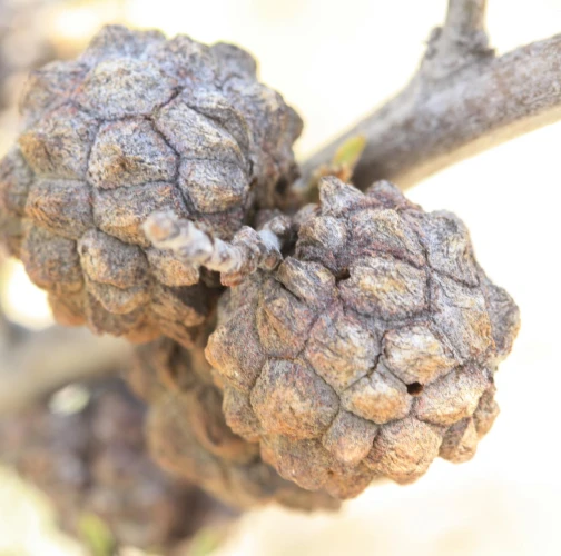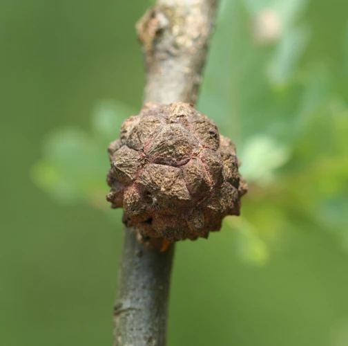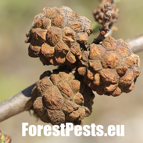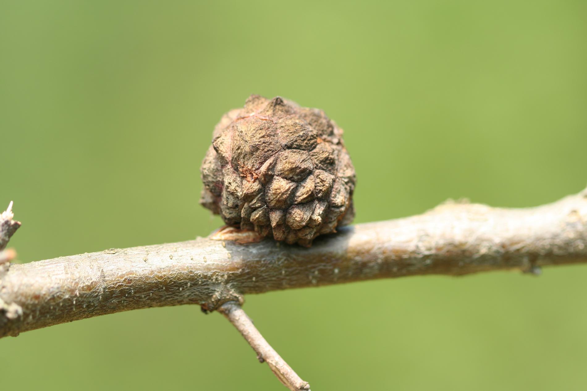 Hálky veľkosťou asi 2 cm na vetvičke. Hálkaje tvorená viacerými 5-6 uholníkovými výrastkami.