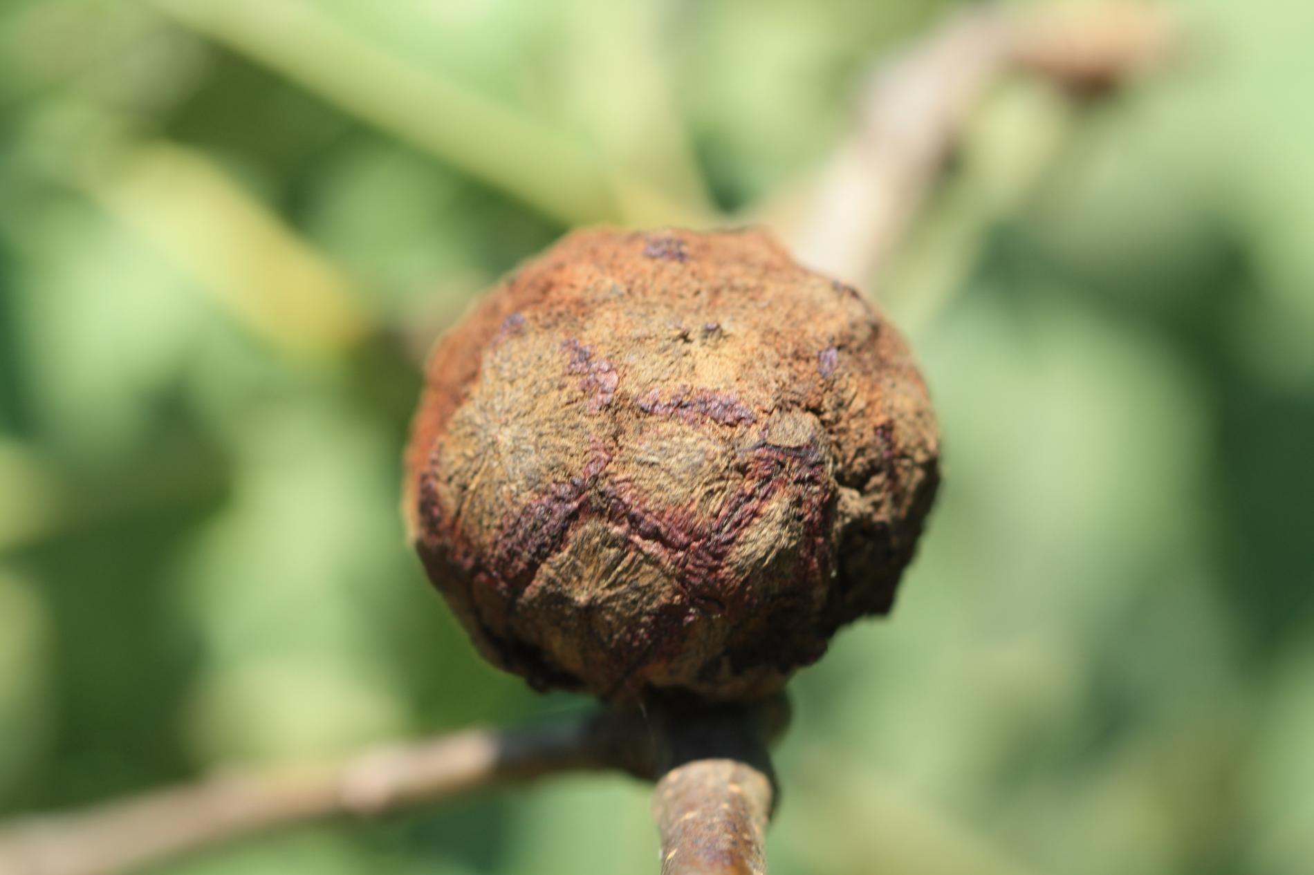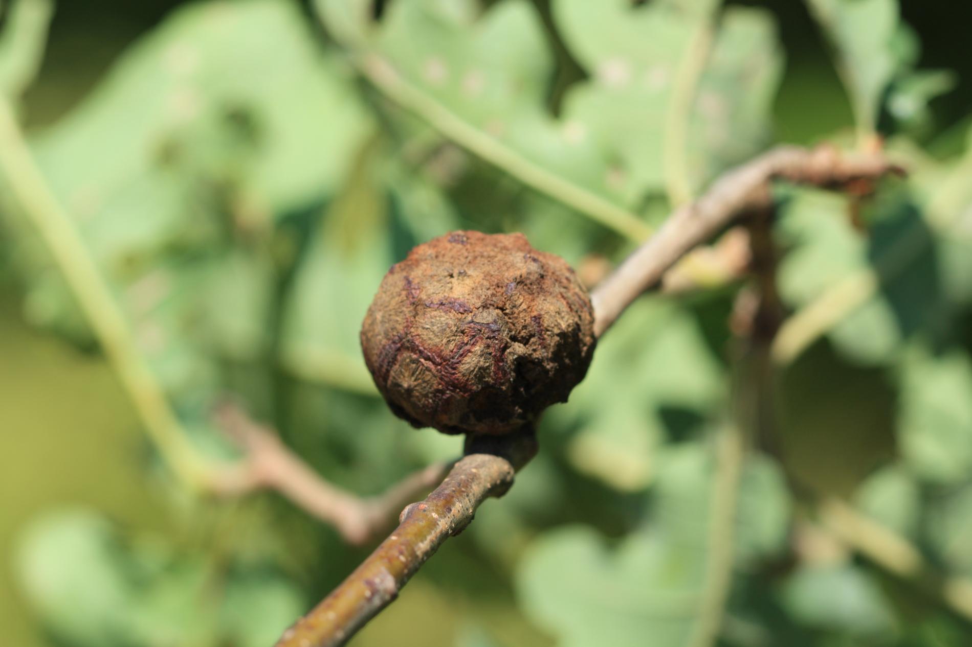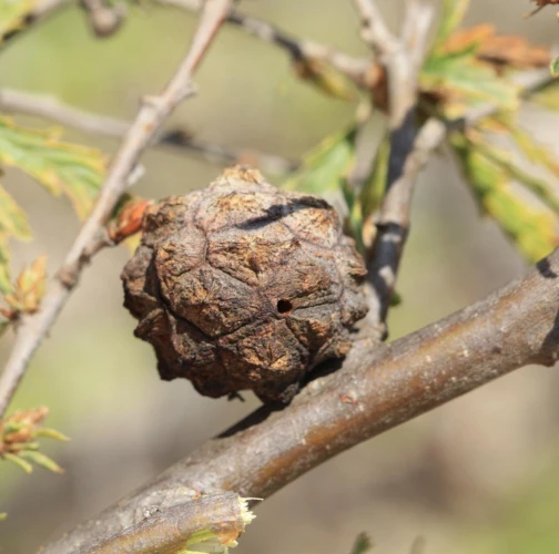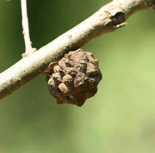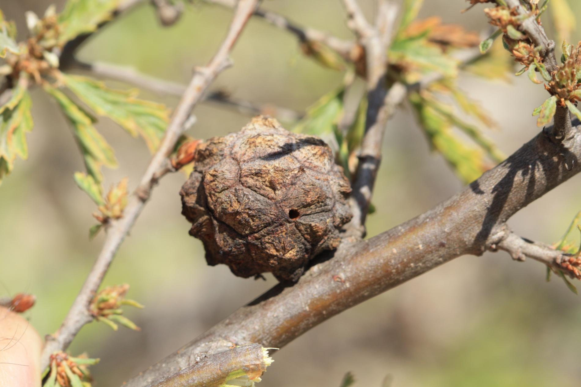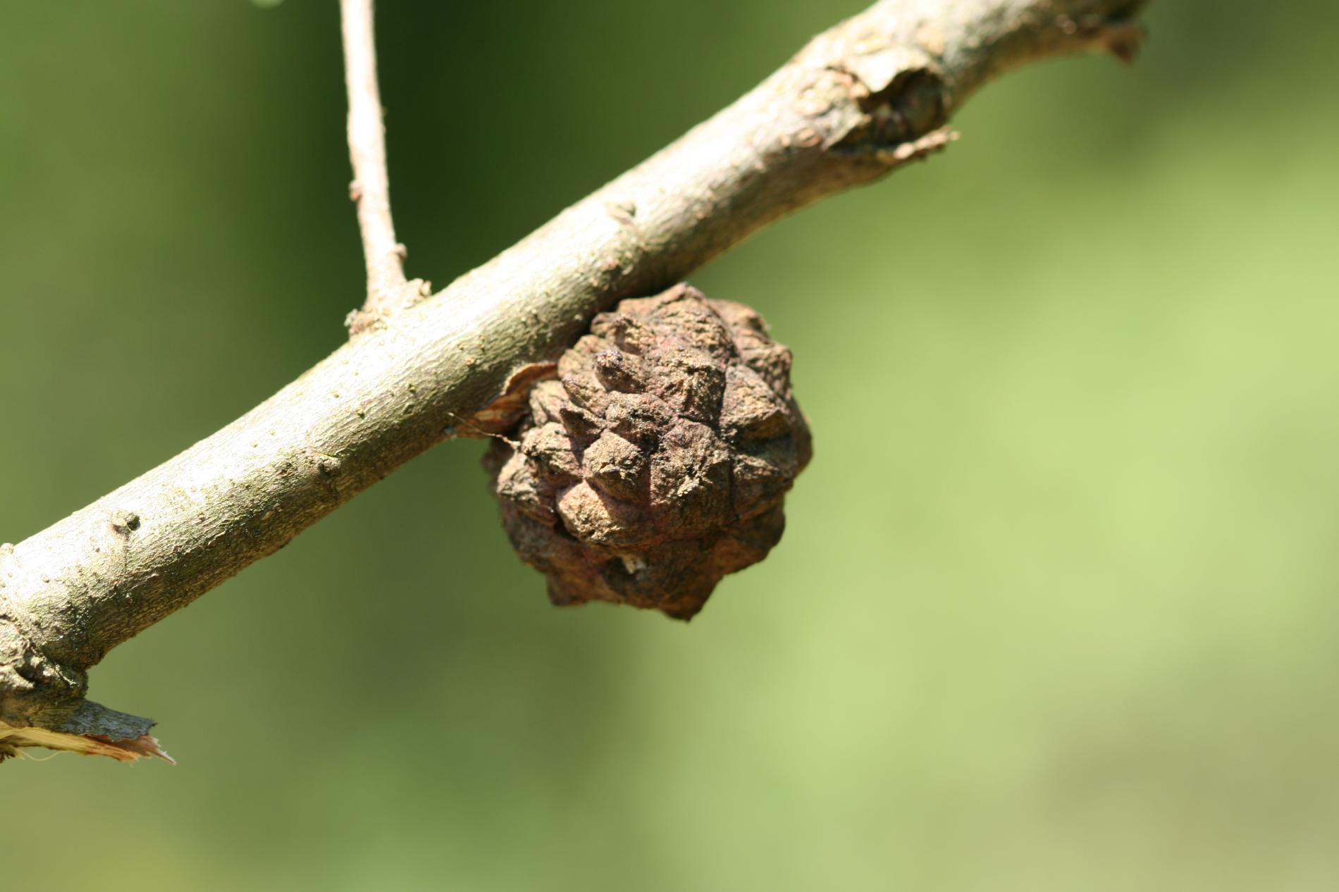 Hálky veľkosťou asi 2 cm na vetvičke. Hálkaje tvorená viacerými 5-6 uholníkovými výrastkami.
