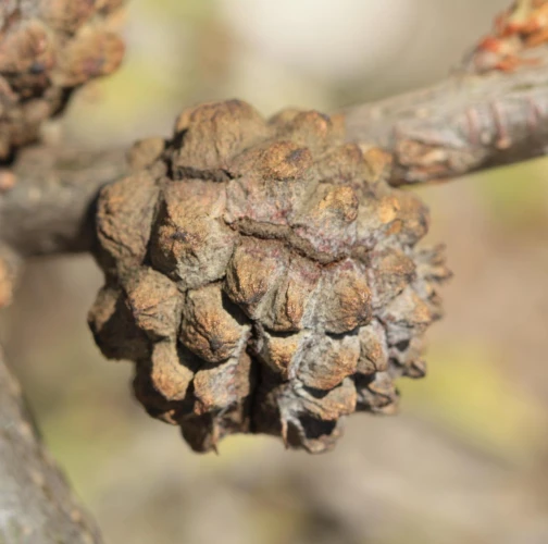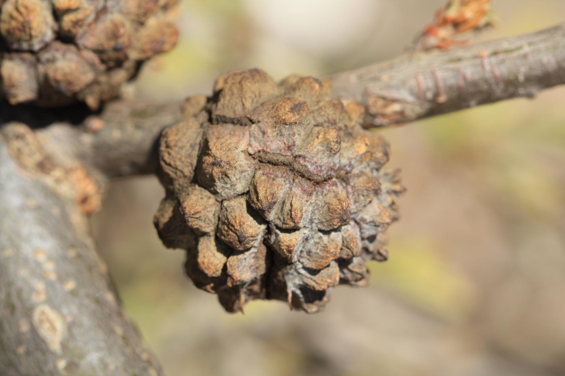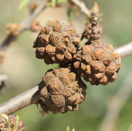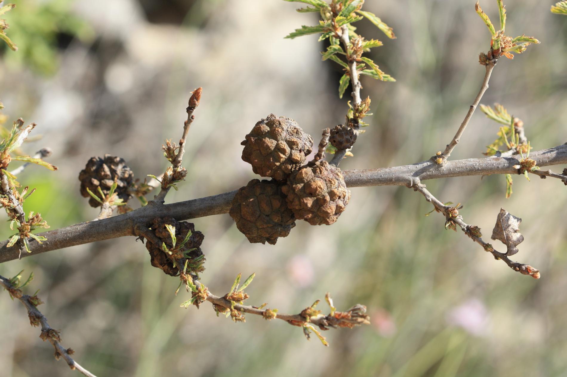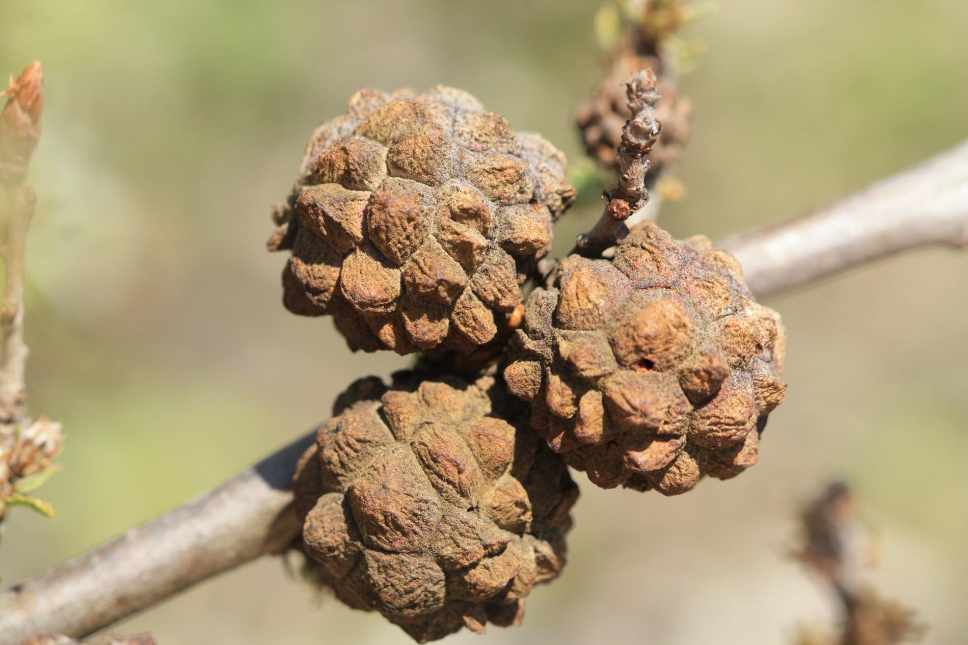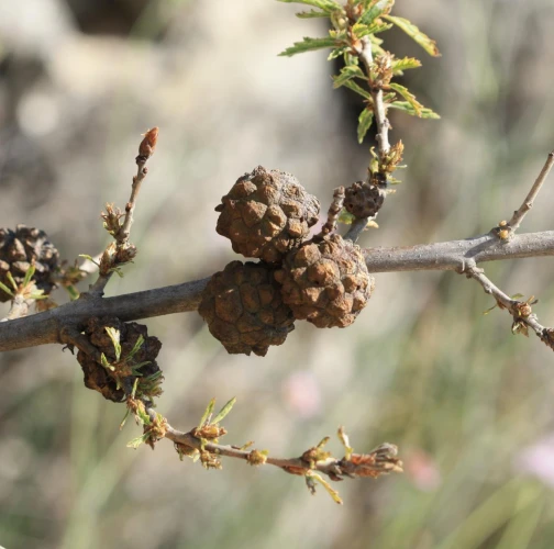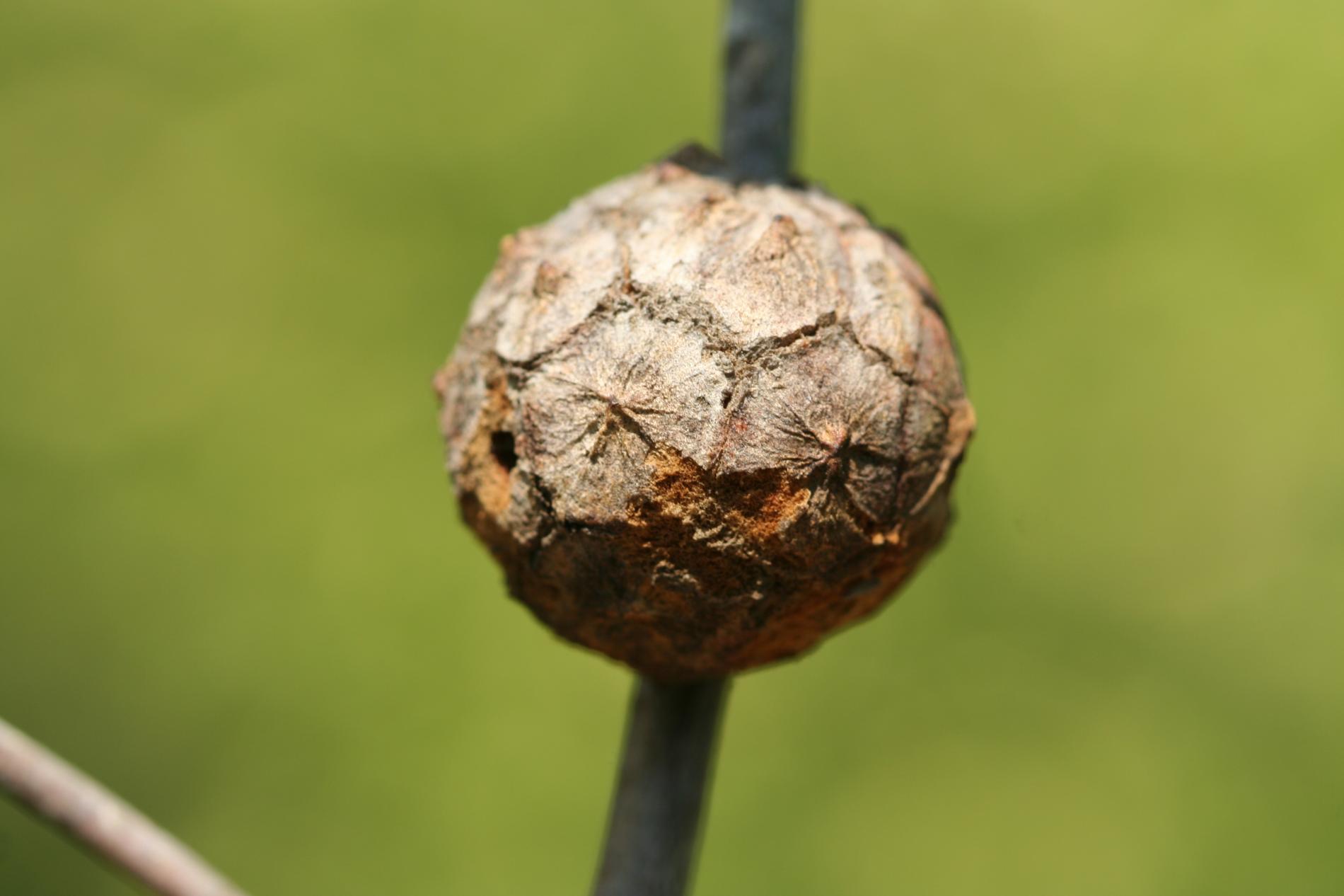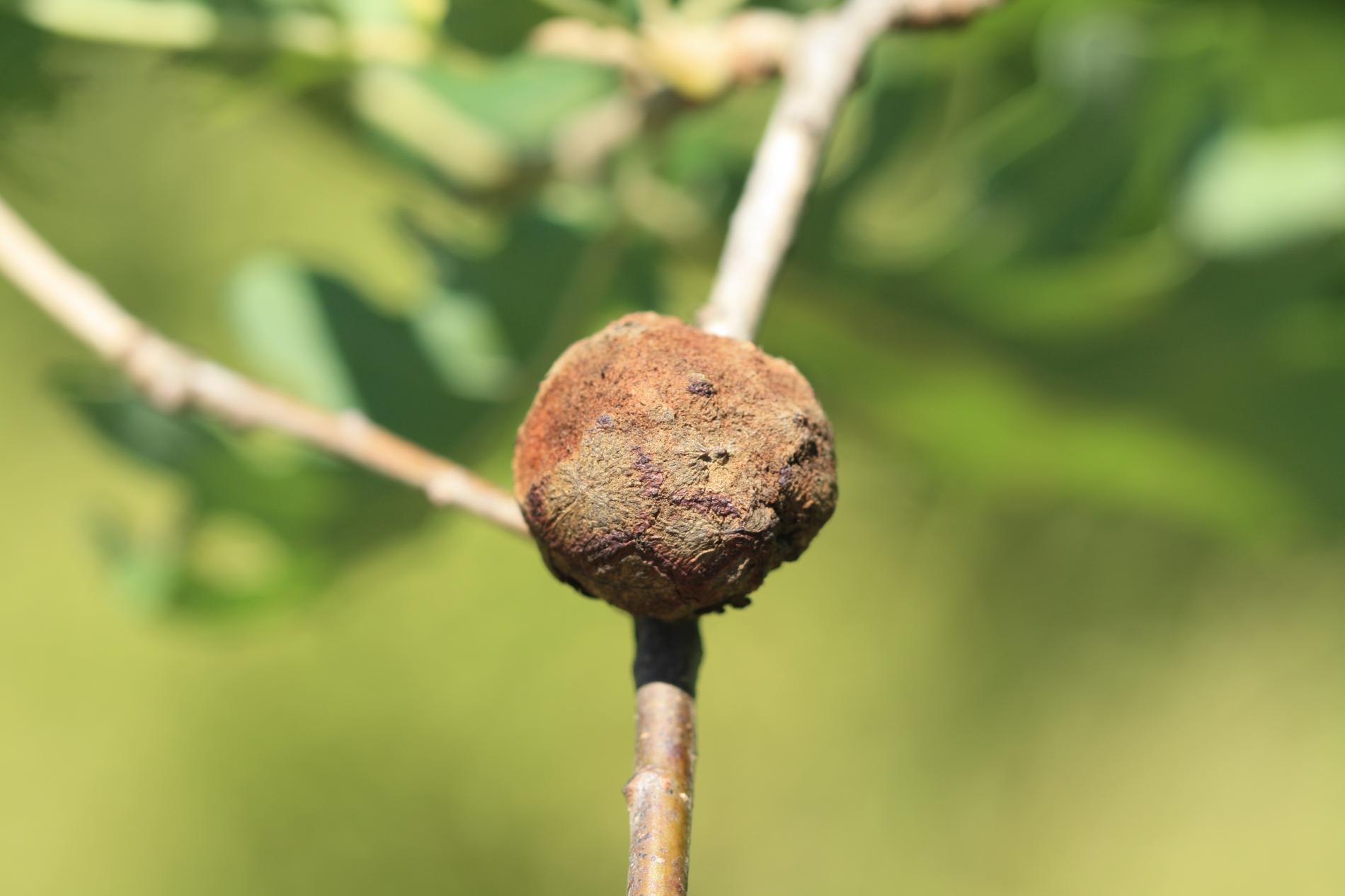 Hálky veľkosťou asi 2 cm na vetvičke. Hálkaje tvorená viacerými 5-6 uholníkovými výrastkami.