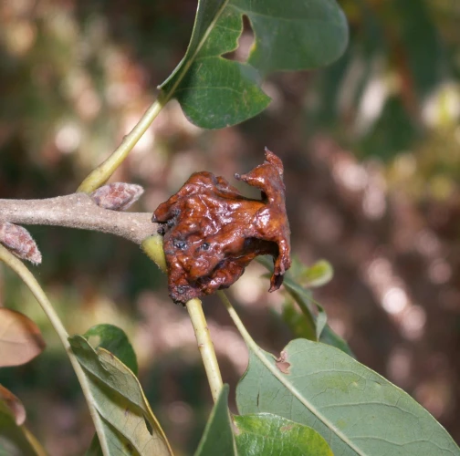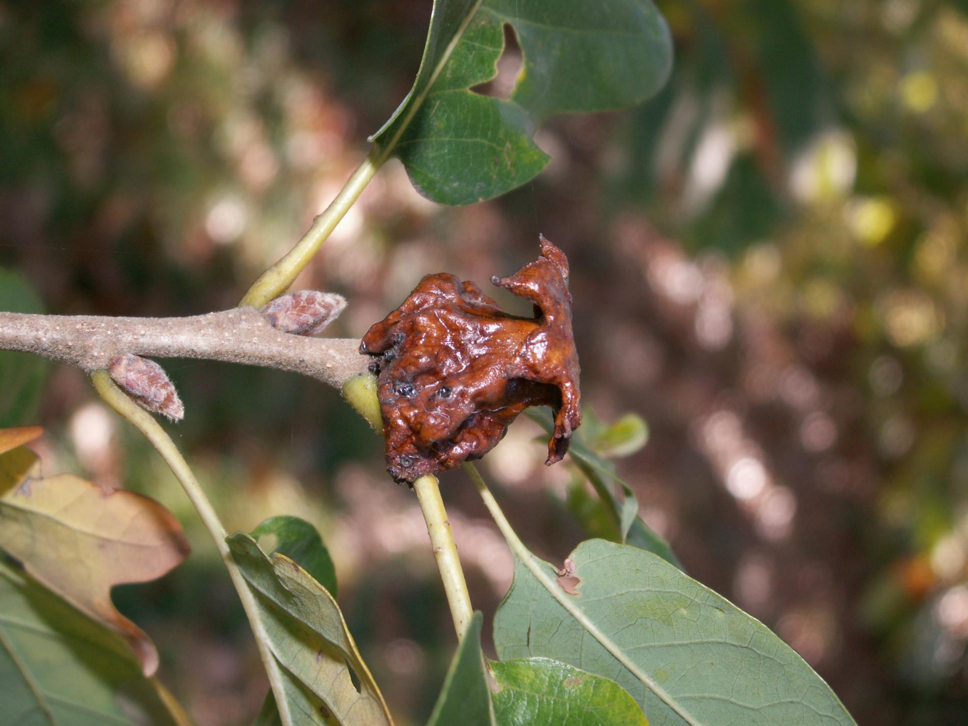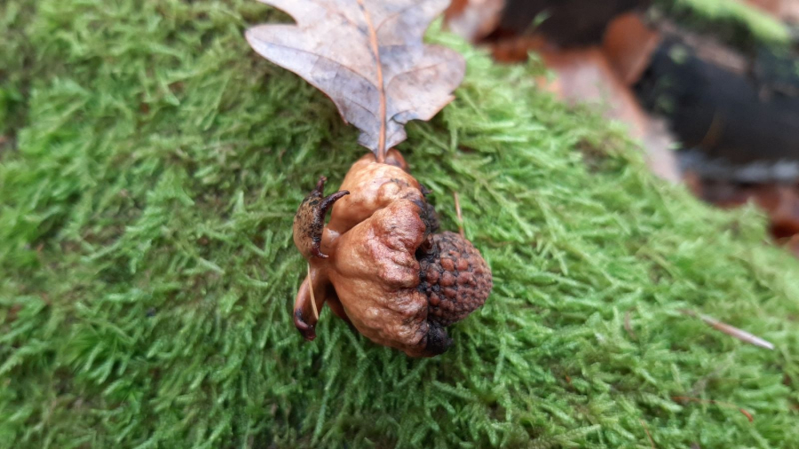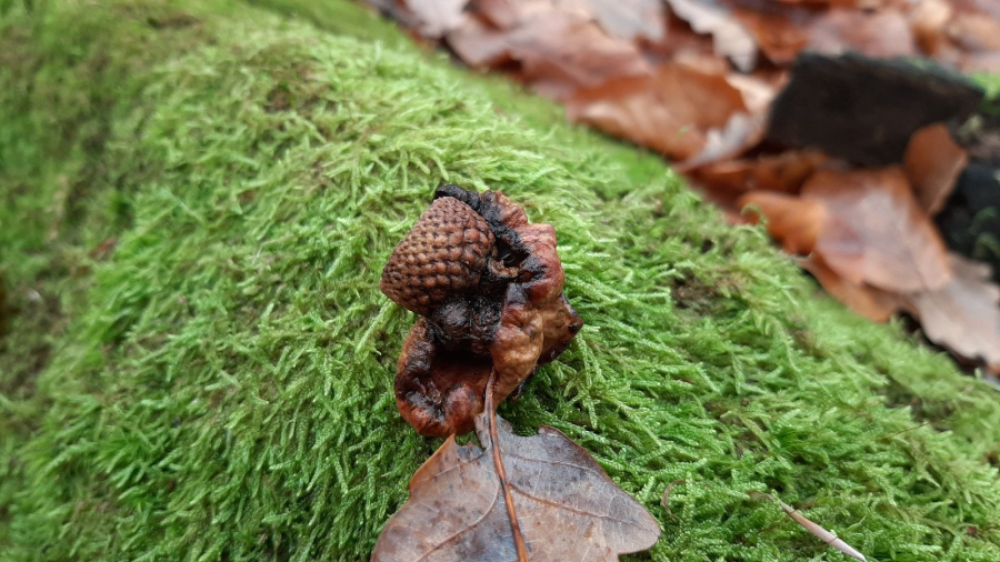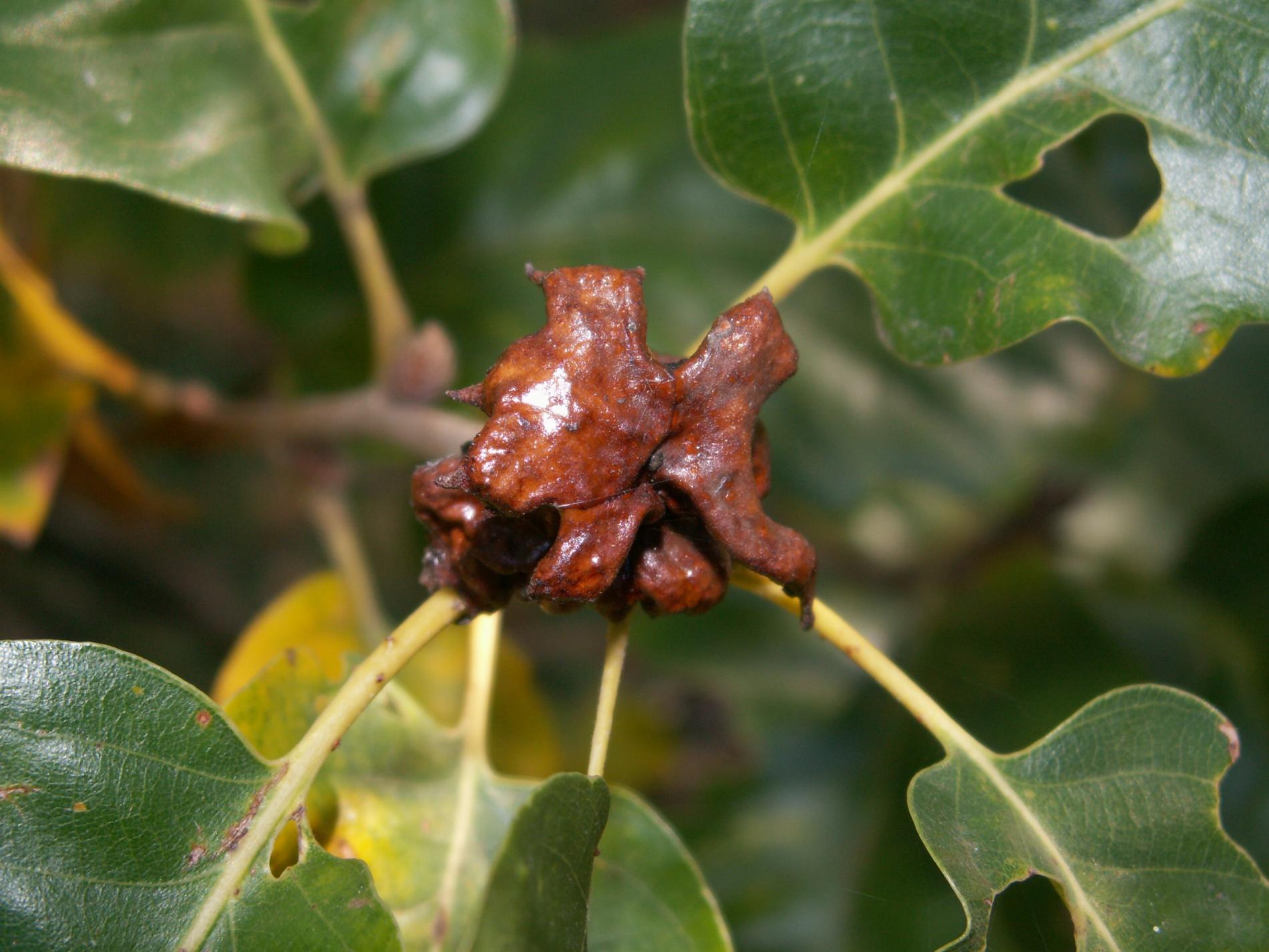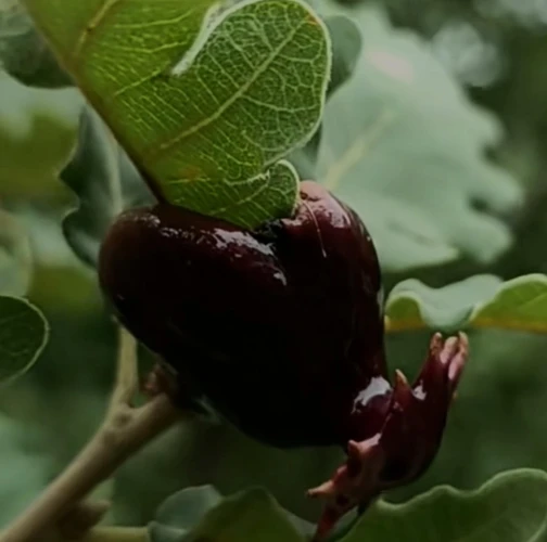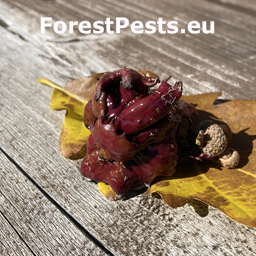 Lesklé, hnedo červené hálky na žaluďoch.