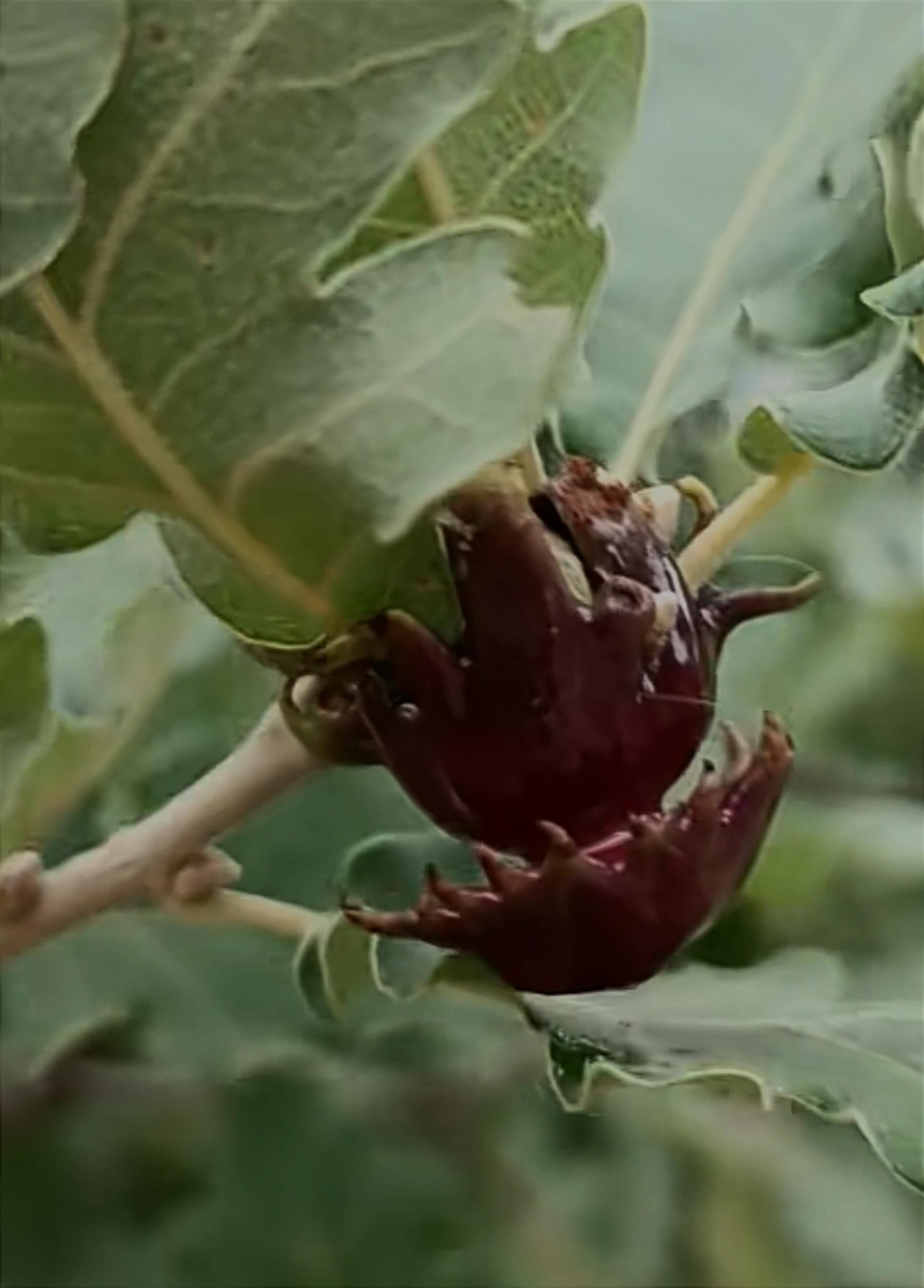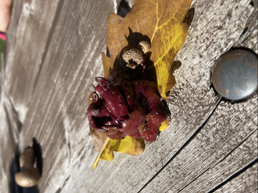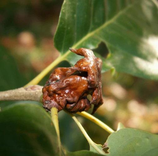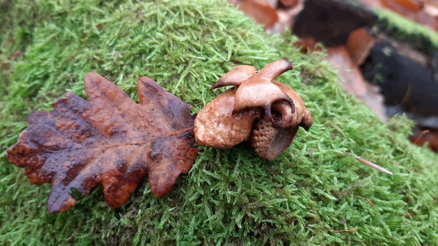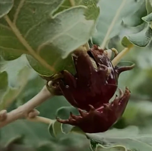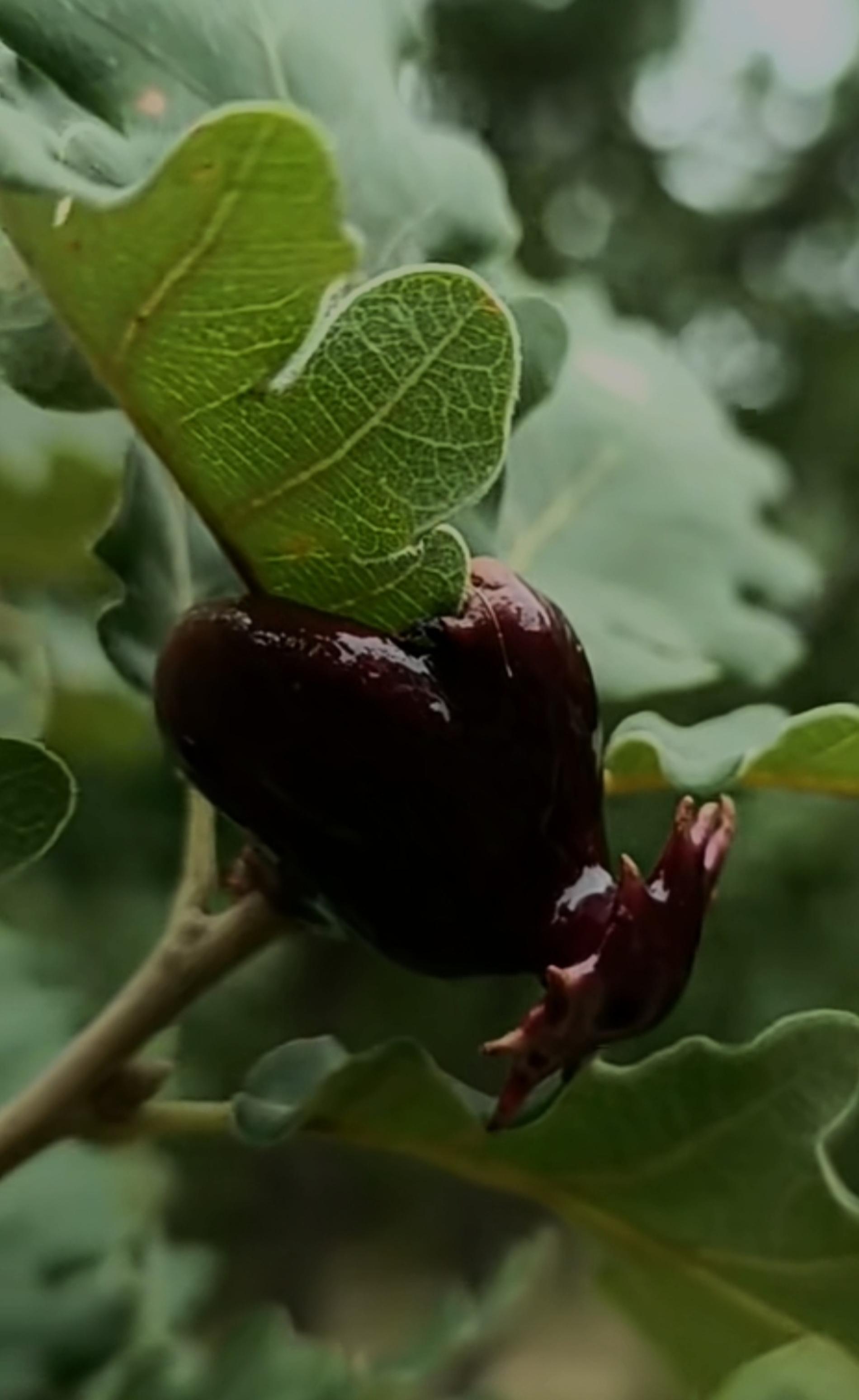 Lesklé, hnedo červené hálky na žaluďoch.