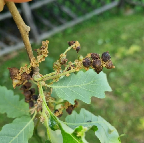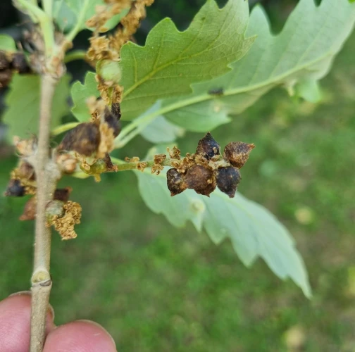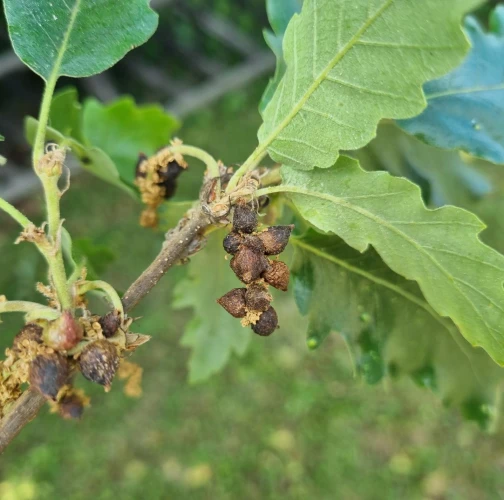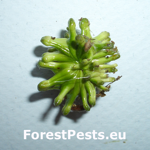 Hálky nepohlavnej generácie sú guľovité, čiastočne ponorené do čiašky žaluďa s dužinatými výrastkami na povrchu. Pohlavná generácia vytvára malé, chlpaté, guľovité opuchy na samčích jahňadách, často v hustých zhlukoch.