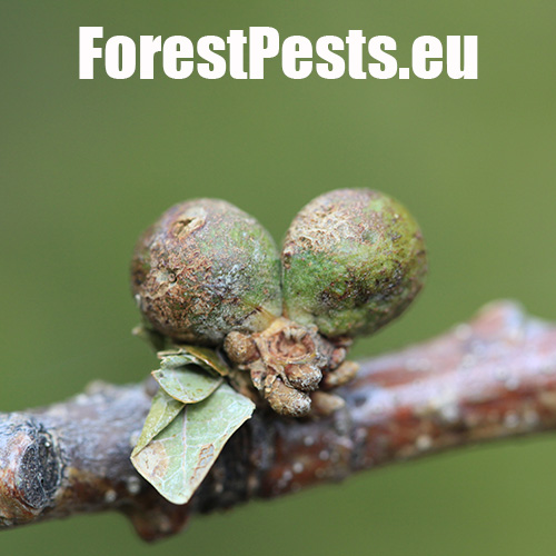 Tvrdé okrúhle hálky na vetvičke, často v skupine. Povrch zvráskavený.
