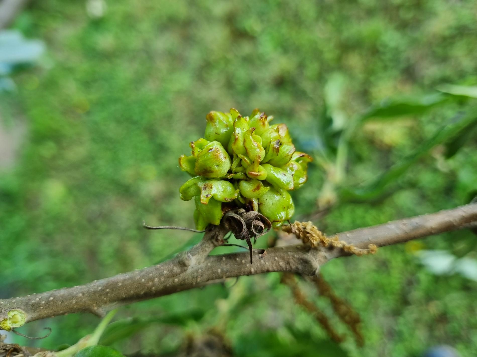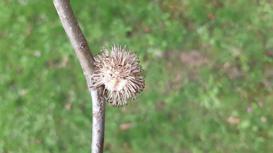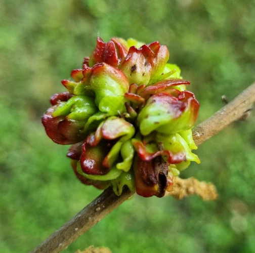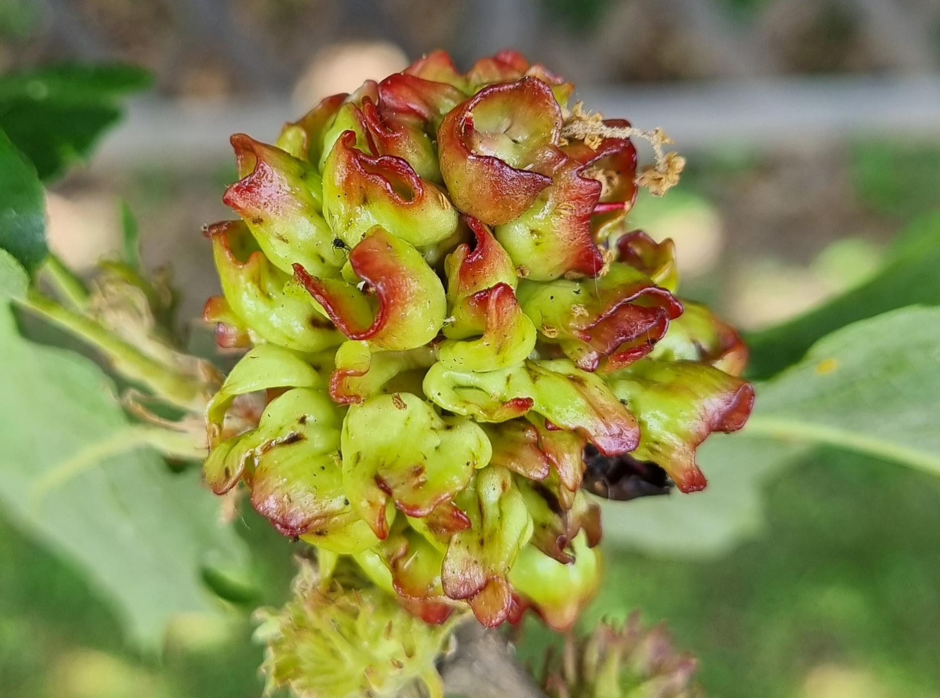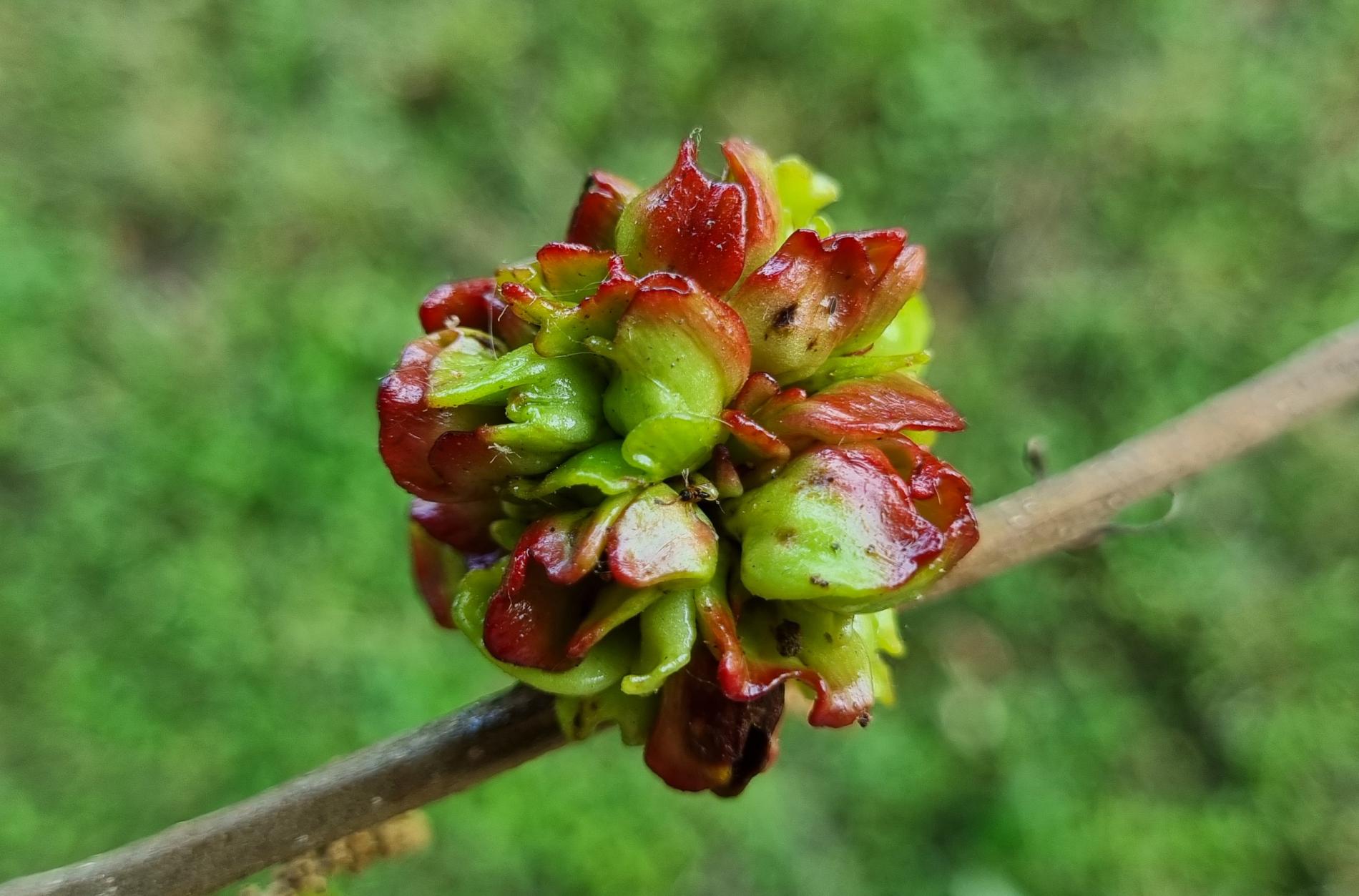Ježovitá hálka má v priemere len asi 3 – 4 mm, ale vyrastajú z nej 6 - 7 mm dlhé, na konci zhrubnuté výbežky.