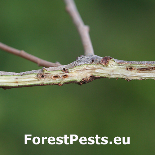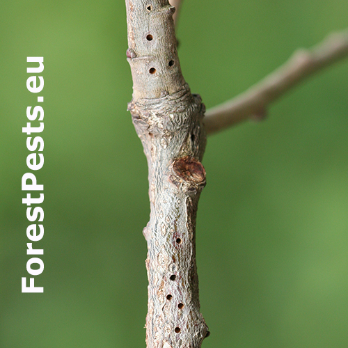 Mála osička kladie vajíčka na jar na vetvičky dubov. Larvy sa zavrtávajú do dreva a stržňa, kde vyhlodávajú úzke chodbičky. Miesto žeru opúšťajú v auguste okrúhlymi otvormi usporiadanými v jednom rade nad sebou. Následkom žeru sa vetvička oslabuje a v dôsledku vetra alebo mechanického tlaku ľahšie láme. Tento druh je u nás hojný na všetkých druhoch dubov vrátene cera, škody ale spôsobuje len v malej miere.