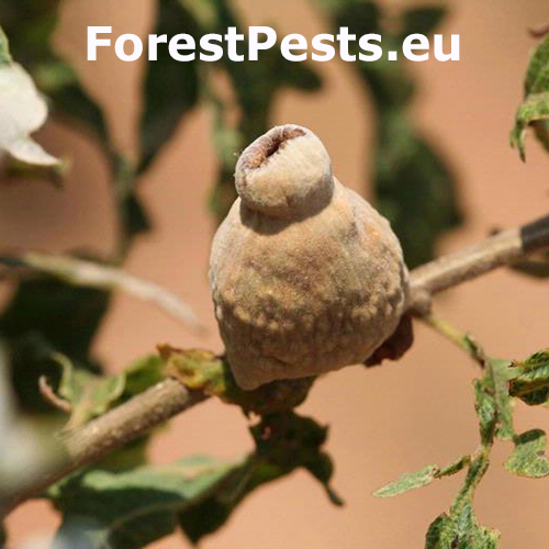 Široká kužeľovitá, až 2 cm vysoká hálka. S otvorom na vrchu - často špicatá na vrchu. Je báze je pripevnená k vetvičke a často viac či menej obklopuje vetvičku. Hálka je husto pokrytá hrdzavookrovou plsťou.