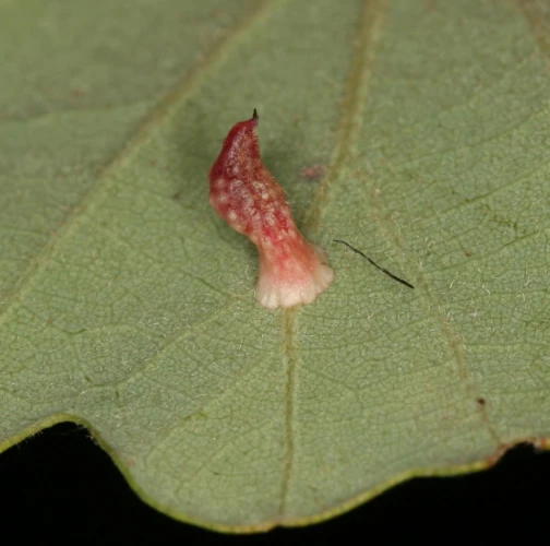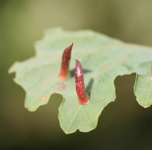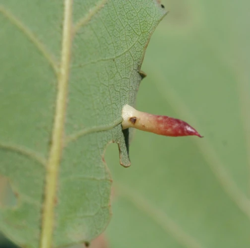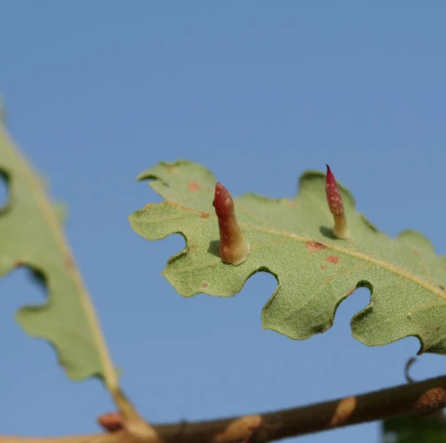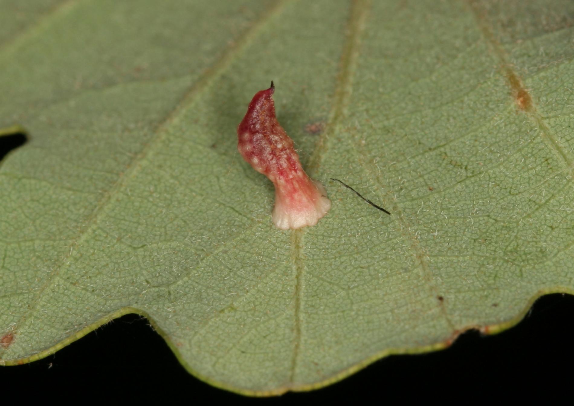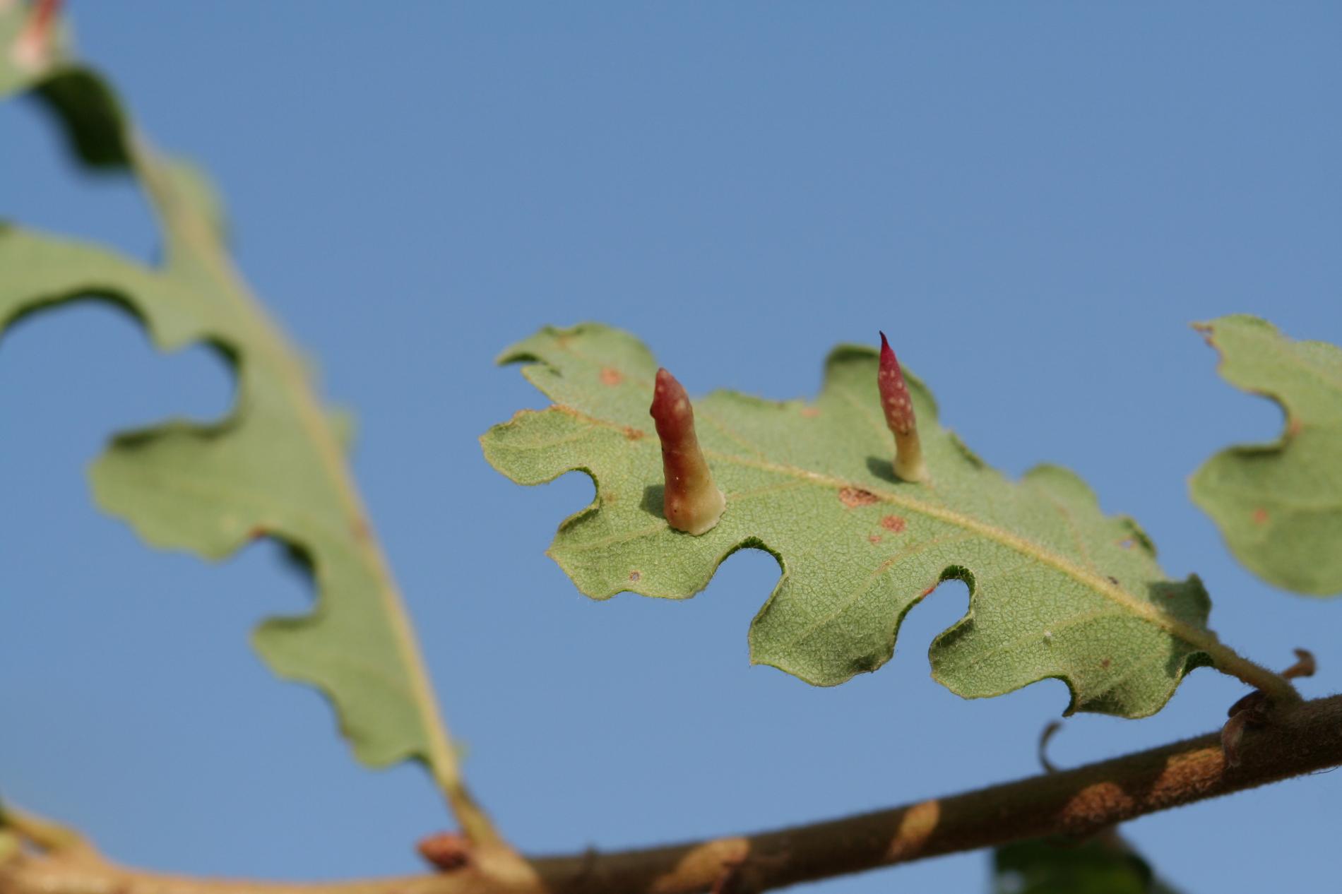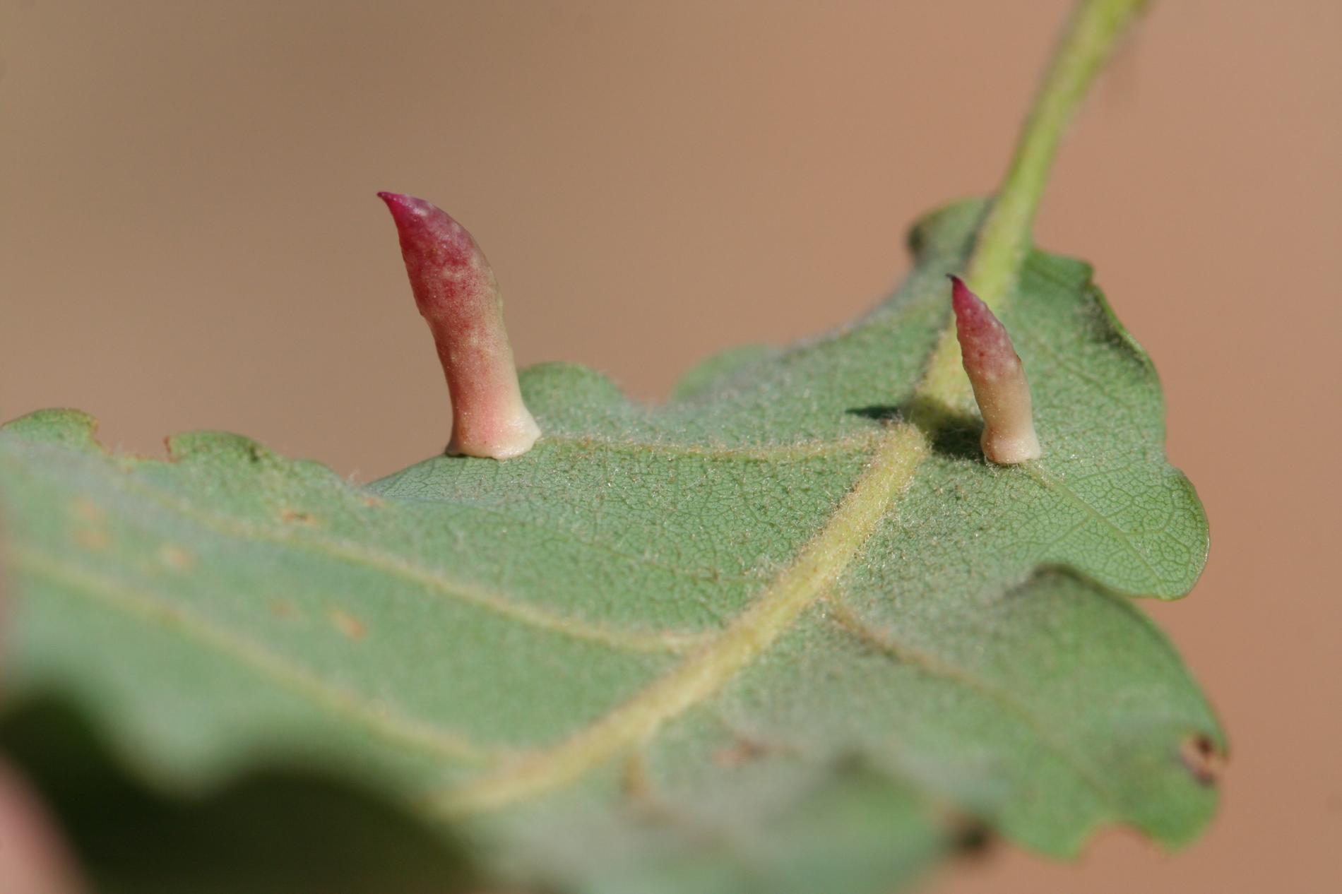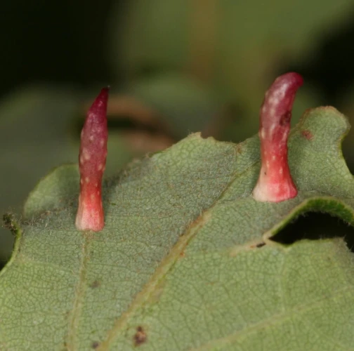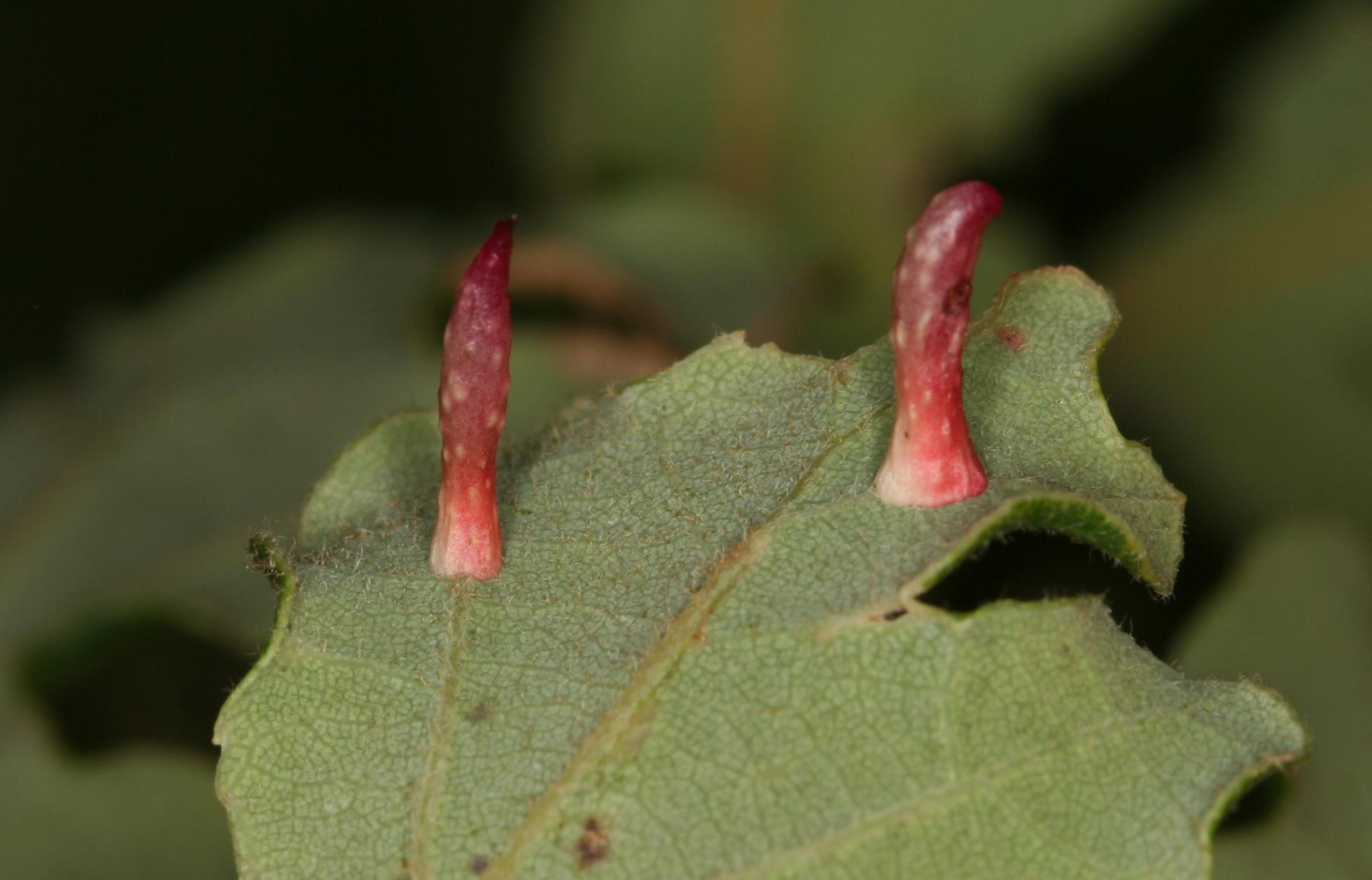 Asi 0,5-1 cm veľká stľpovité hálky obyčajne v skupinách na spodnej strane listu.