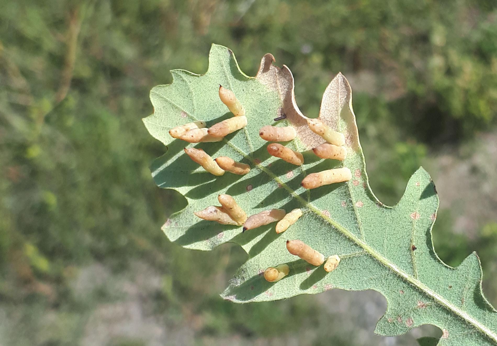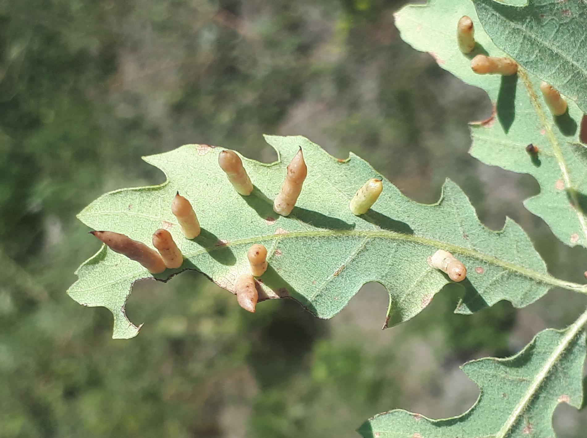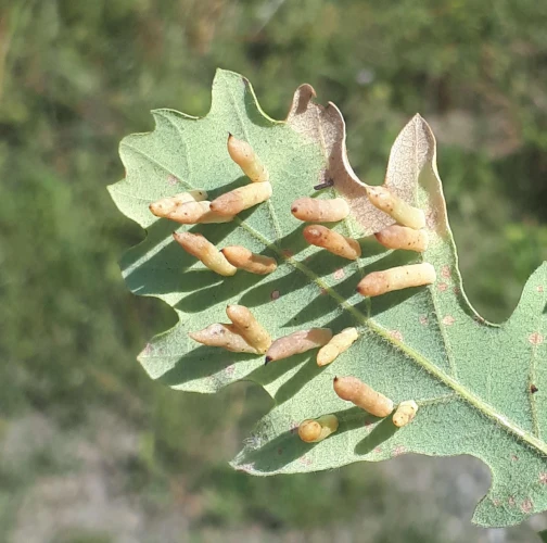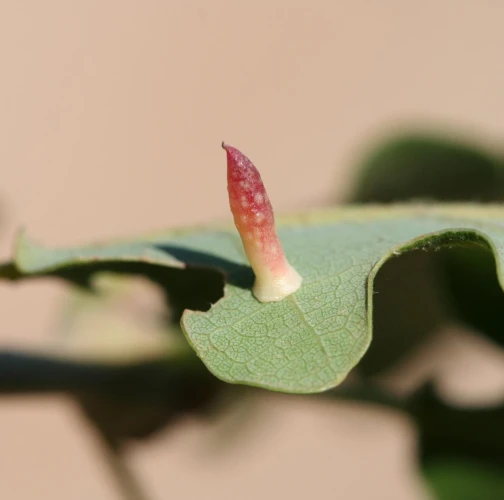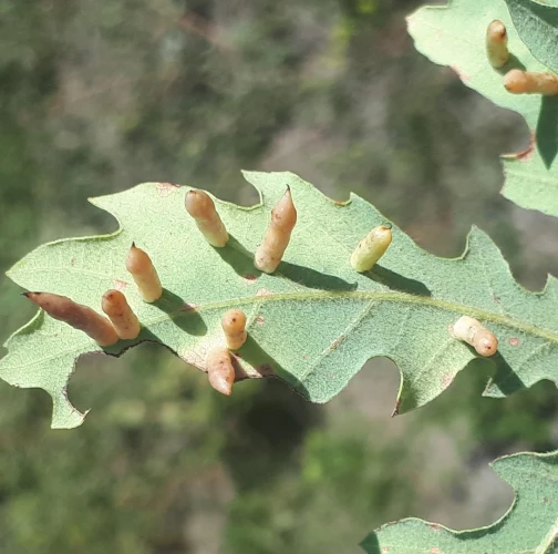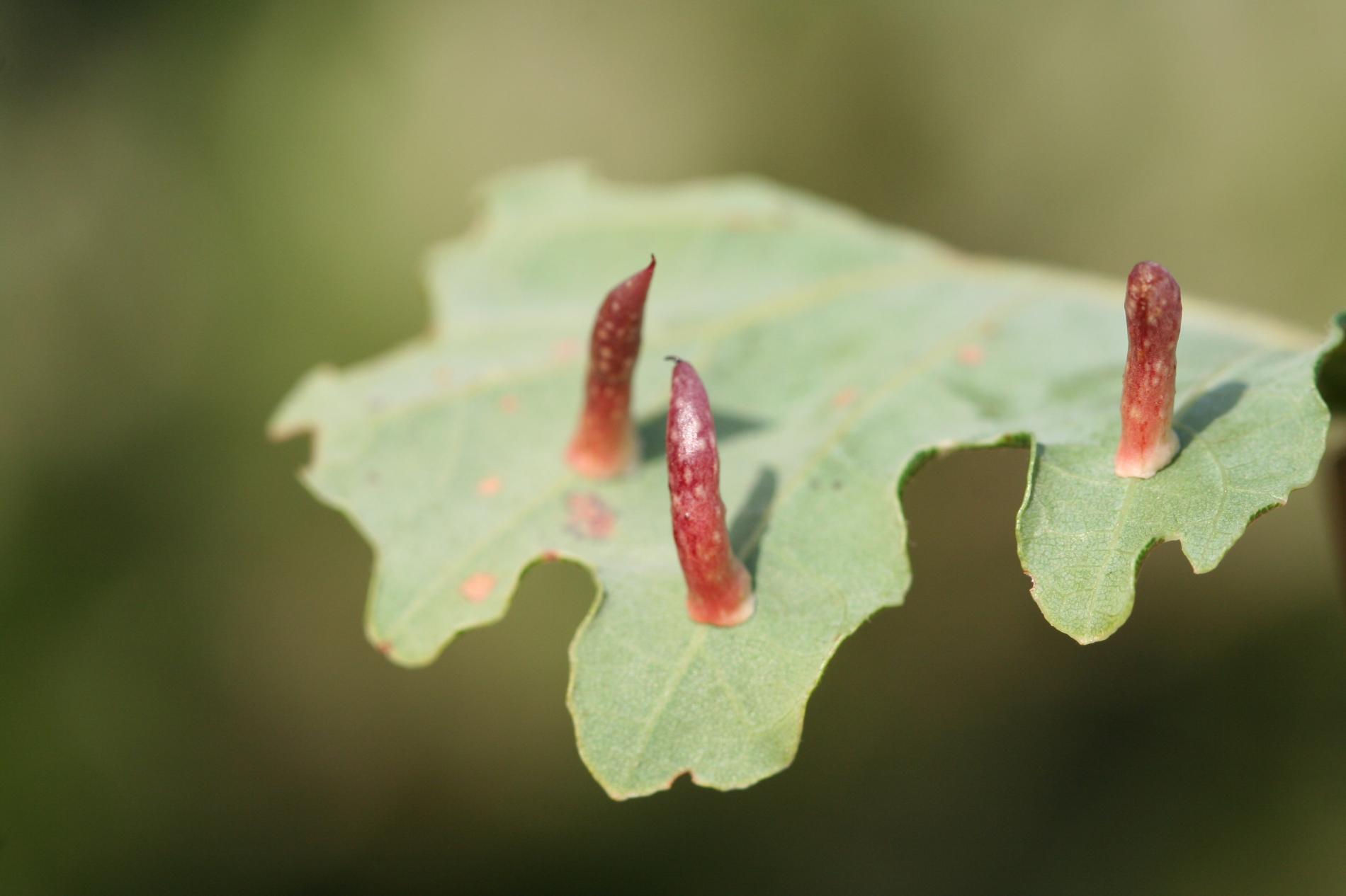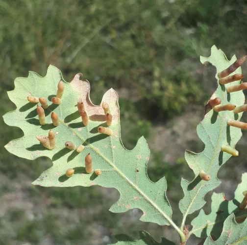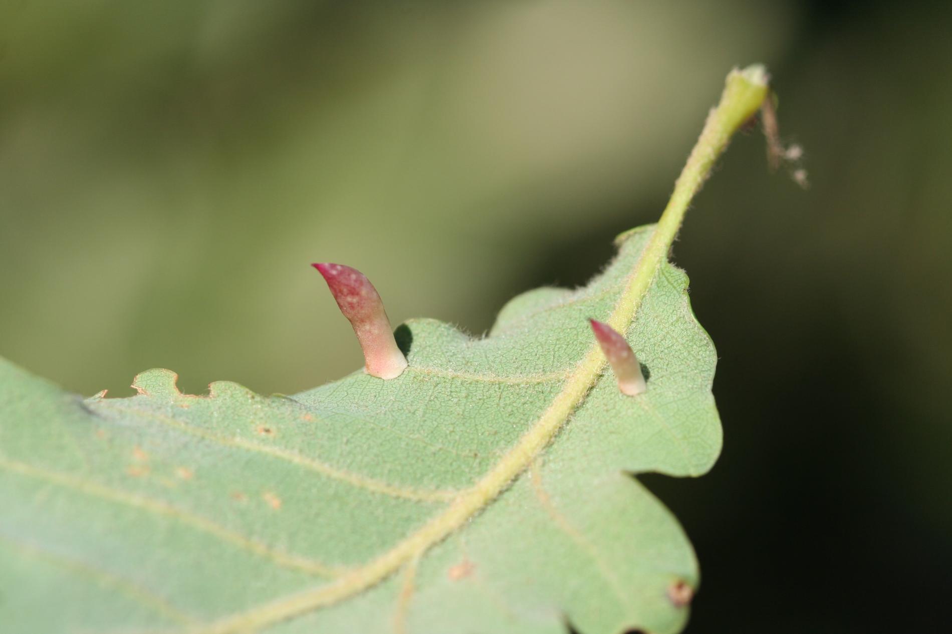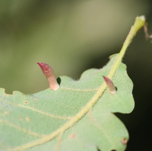Asi 0,5-1 cm veľká stľpovité hálky obyčajne v skupinách na spodnej strane listu.