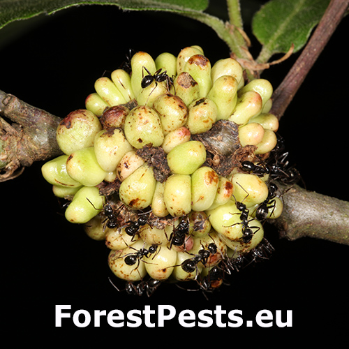 Hálky nepohlavnej generácie sa tvoria na vetvičkách, často sú v skupinách 20–30. Sú zelené, lepkavé a vajcovitého tvaru, s dĺžkou približne 5 mm. Hálky rovnomerne vyrastajú zo všetkých strán vetvičky a každá je jednokomorová. Čerstvé hálky často priťahujú mravce, pravdepodobne kvôli sekrétom poskytujúcim výživu. Pohlavná generácia produkuje menšie okrúhle hálky, približne 5 mm veľké, ktoré sa nachádzajú na okrajoch listov.