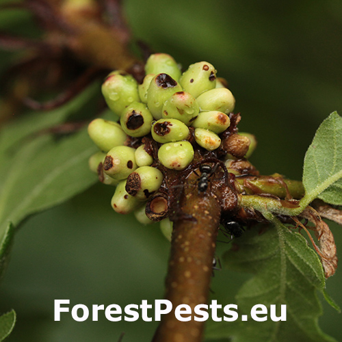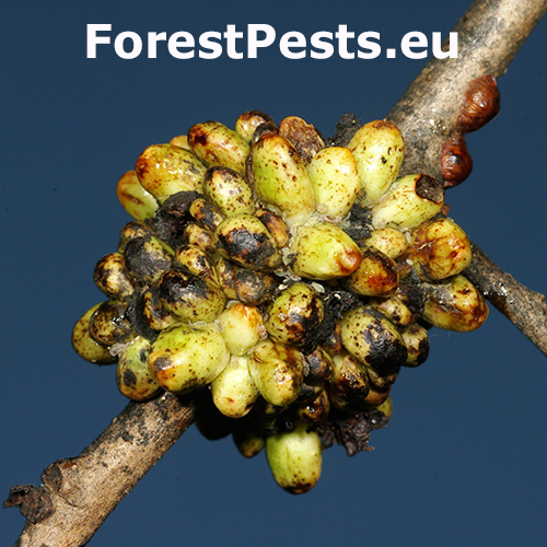 Hálky asexuálnej generácie sú na vetvičkách, sú zelené, lepkavé a vajcovité, tvoriace husté zhluky 20–30 kusov. Na listoch vytvára sexuálna generácia menšie guľovité hálky na okrajoch, ktoré rovnomerne vyčnievajú na oboch stranách listovej plochy. Vetvičky s hálkami môžu byť zdeformované a v blízkosti čerstvých hálok sa často objavujú mravce.