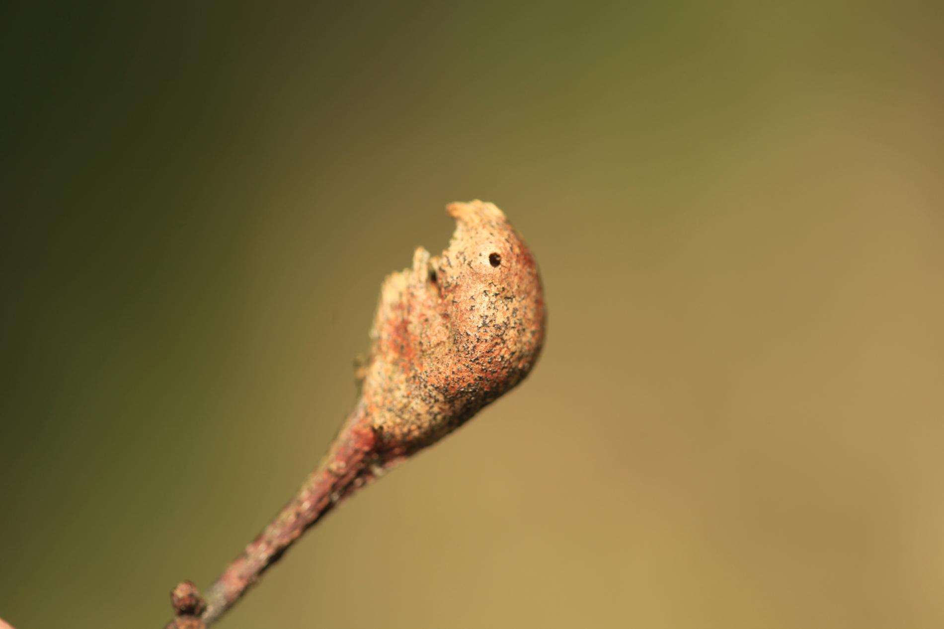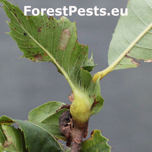 Hálky na báze listu. Zostávajú na vetvičke aj niekoľko rokov ako suché hrčky.