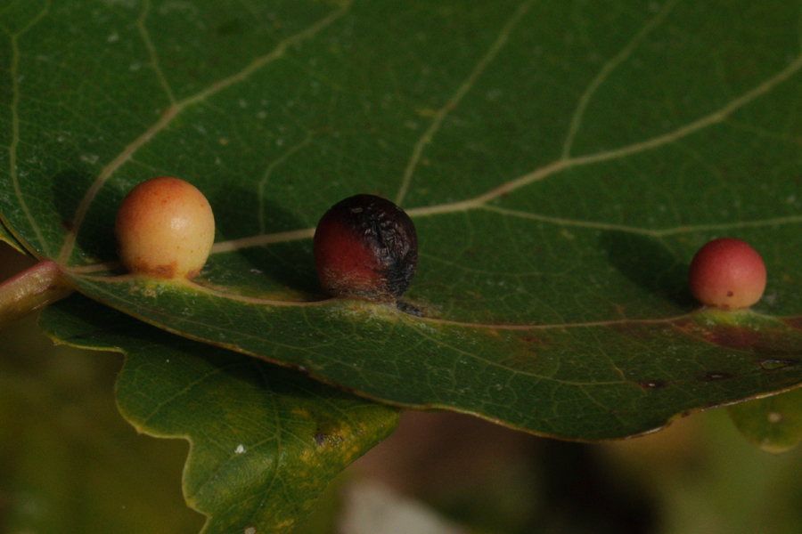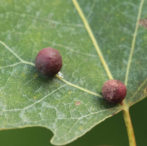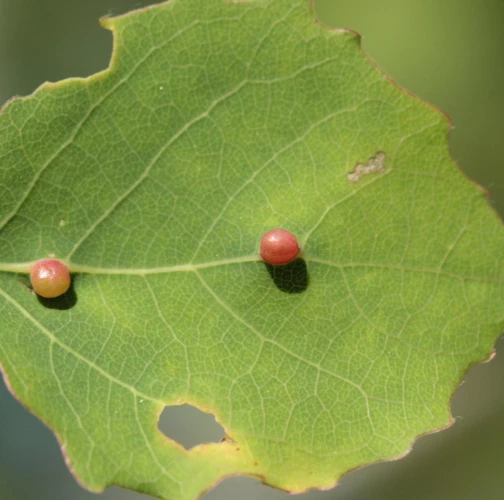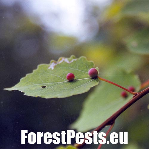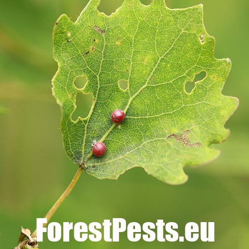 Okrúhle červené hálky na vrchnej strane listov topoľa. Majú priemer 4 – 5 mm a vyskytujú sa v skupinách. V každej hálke žije jedna červenkavá larva. Kuklí sa v pôde. Druh je na niektorých miestach hojný.