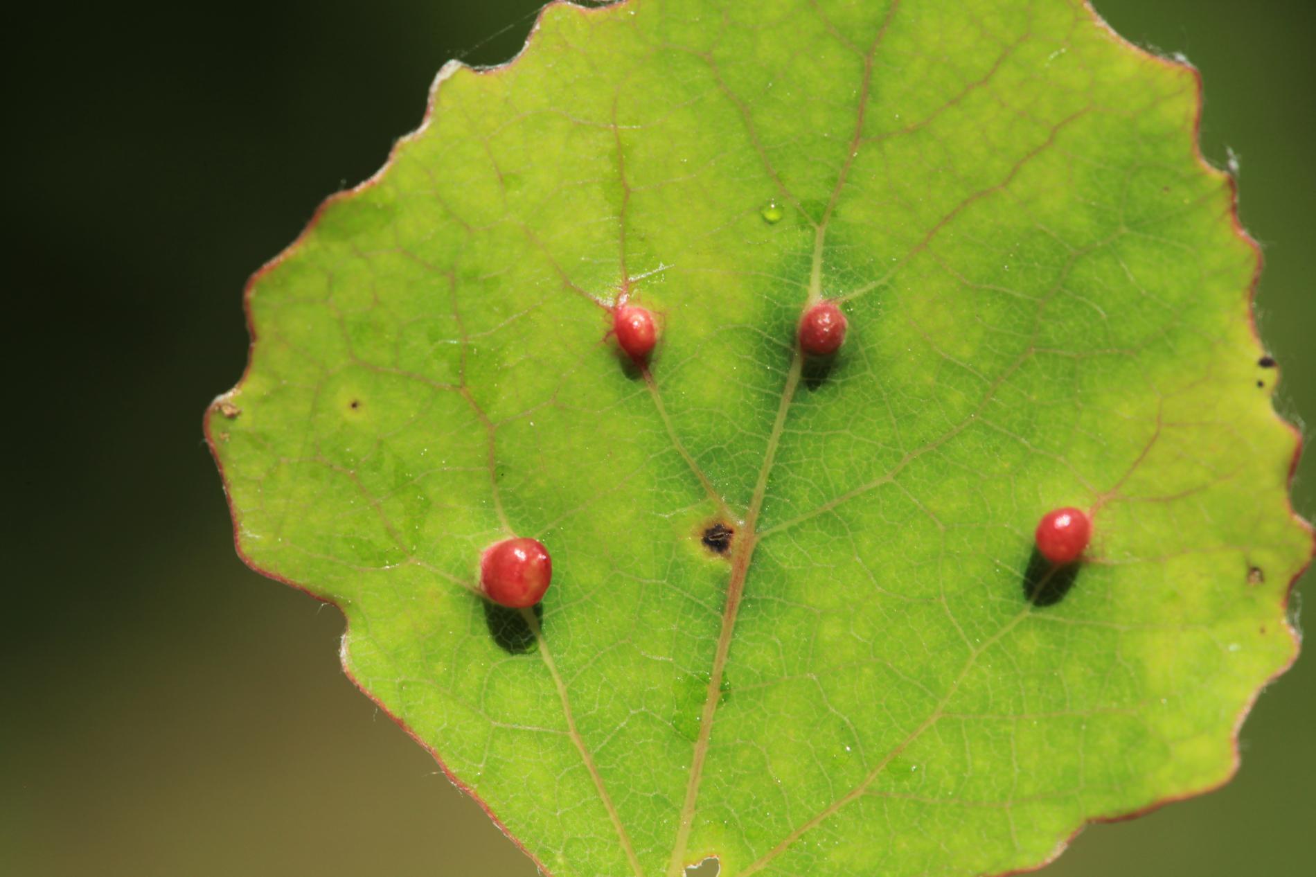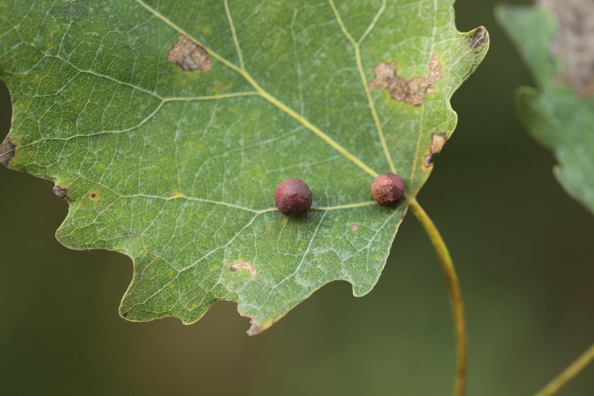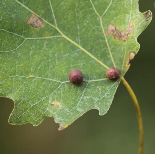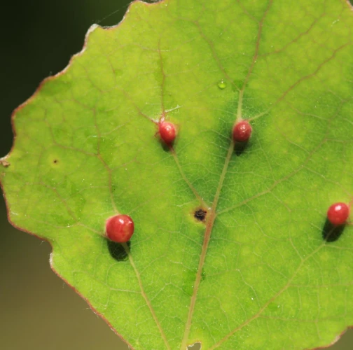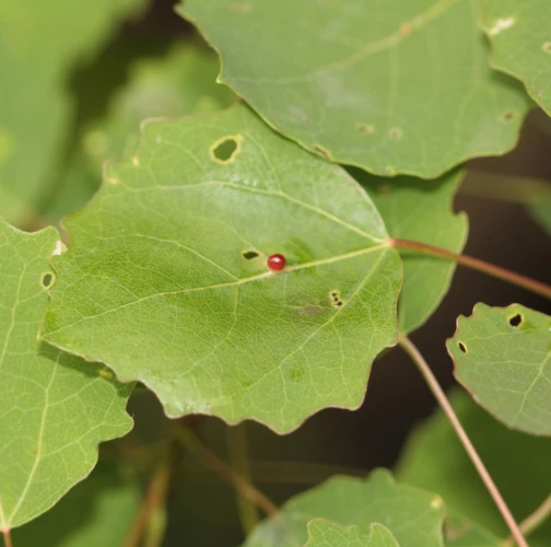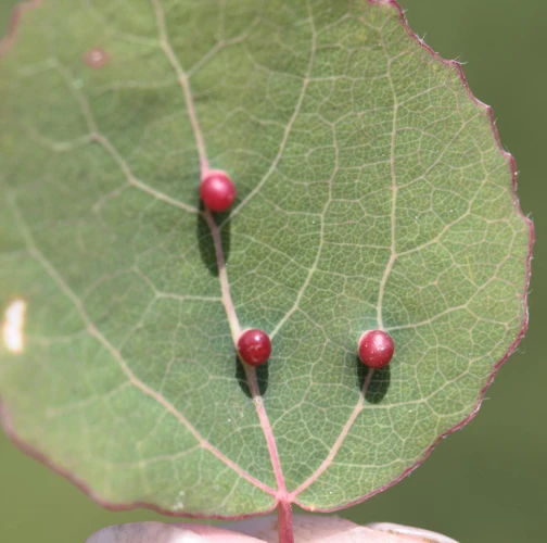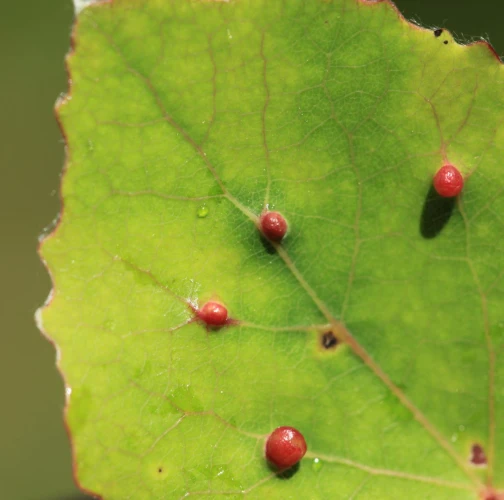 Okrúhle červené hálky na vrchnej strane listov topoľa.
