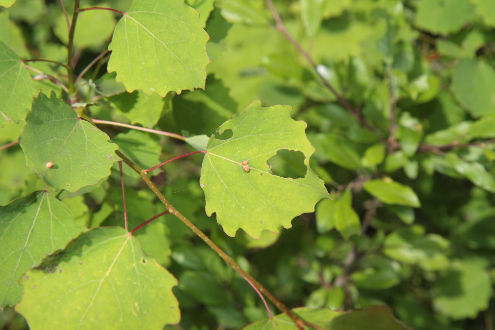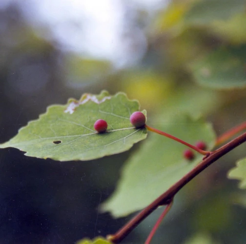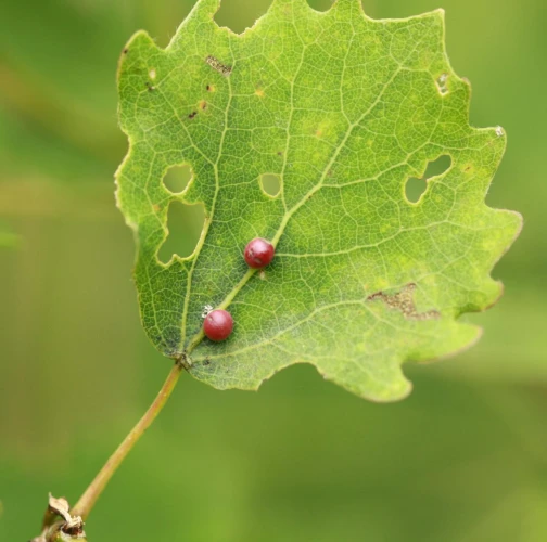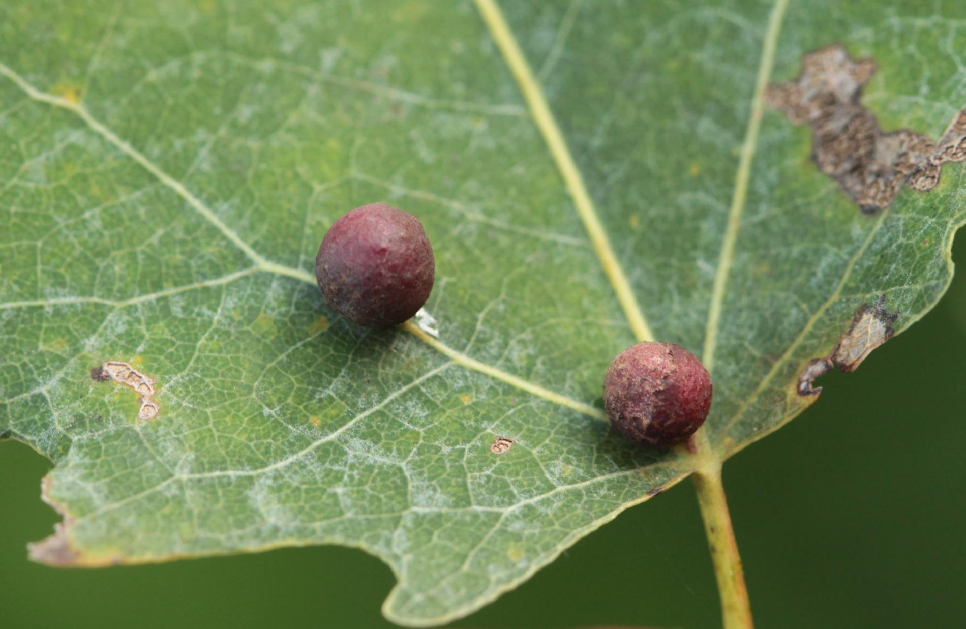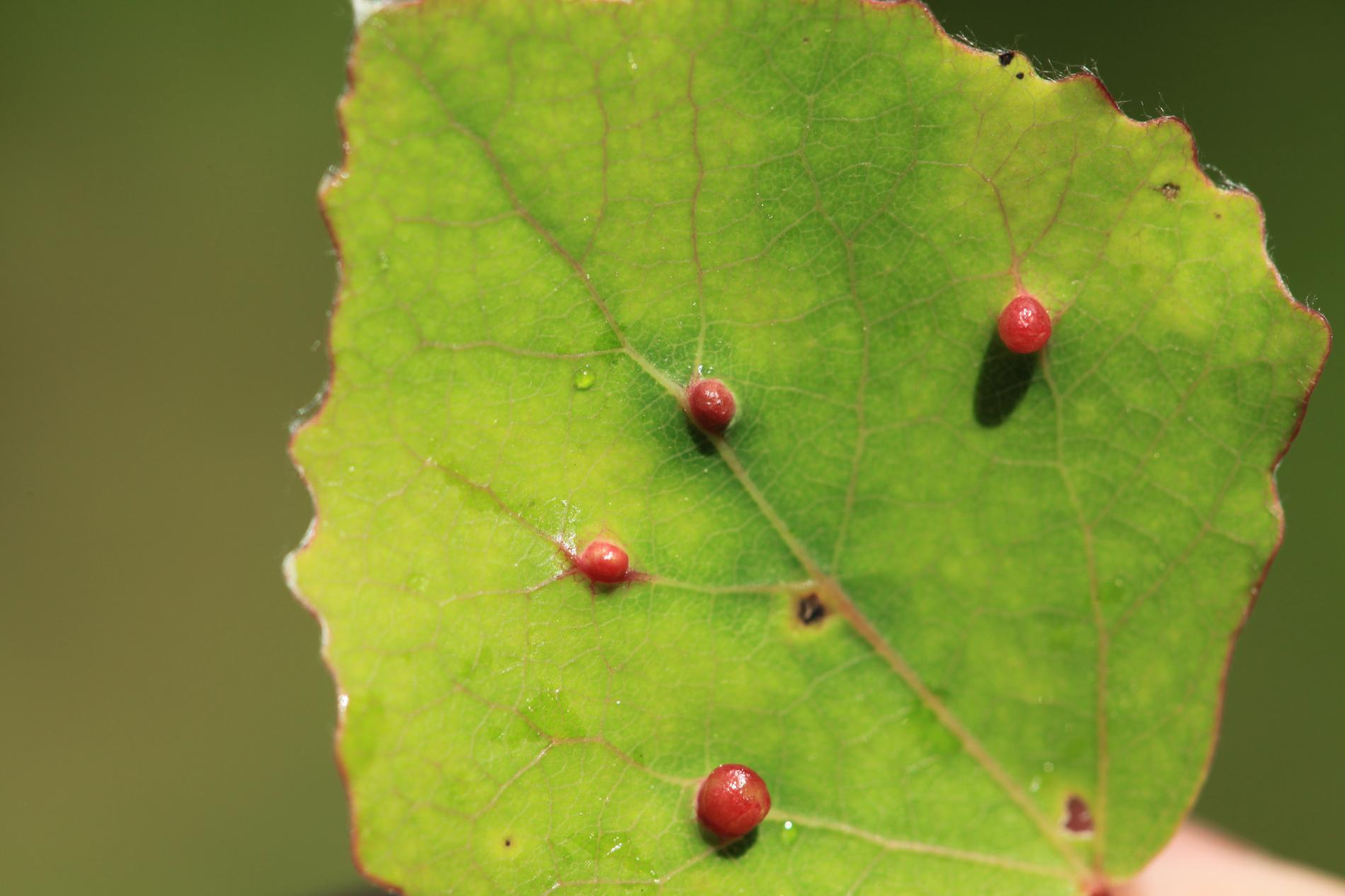 Okrúhle červené hálky na vrchnej strane listov topoľa.