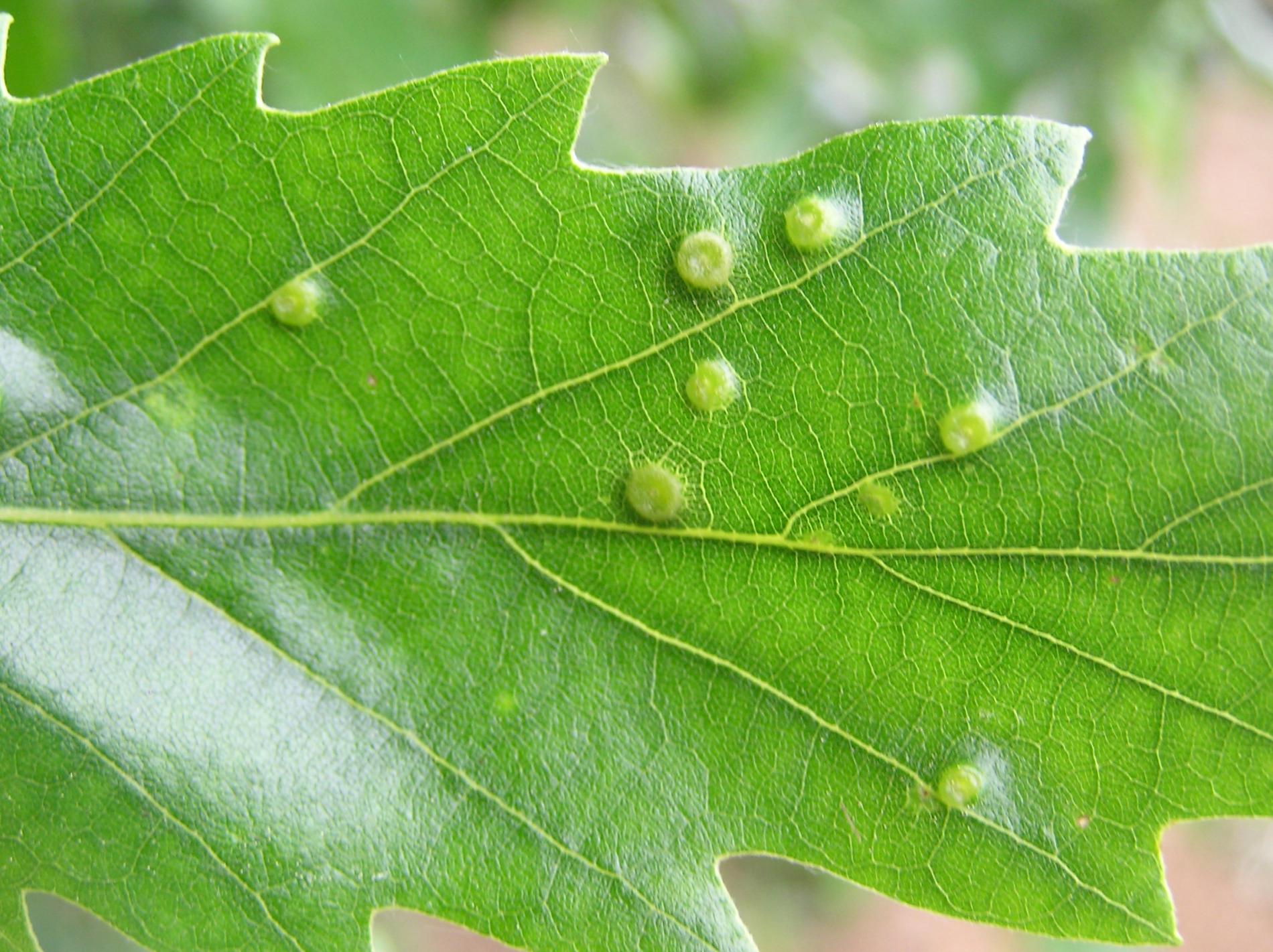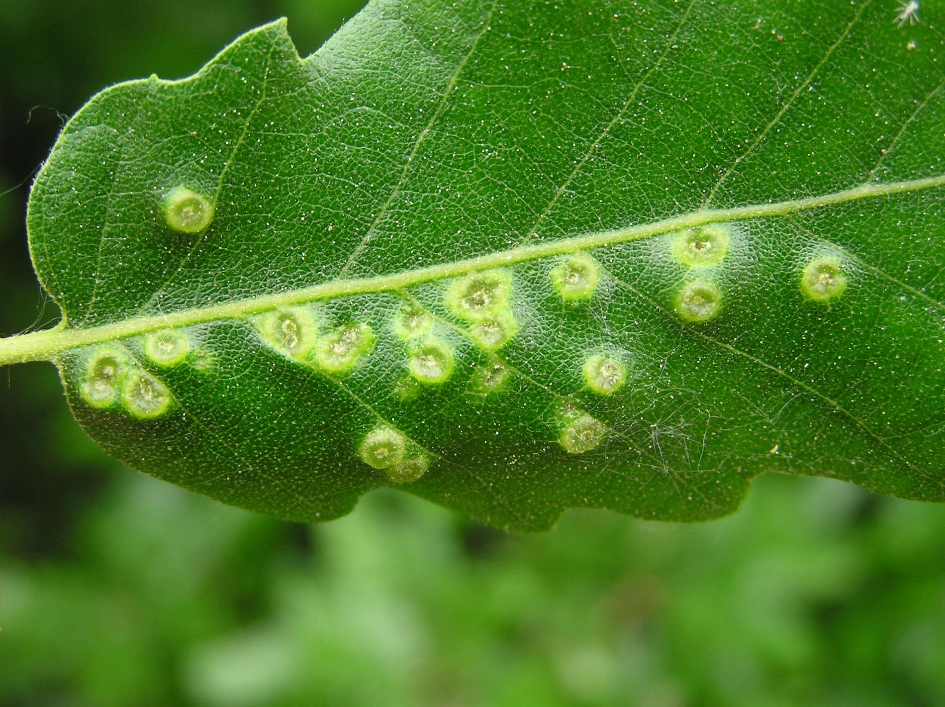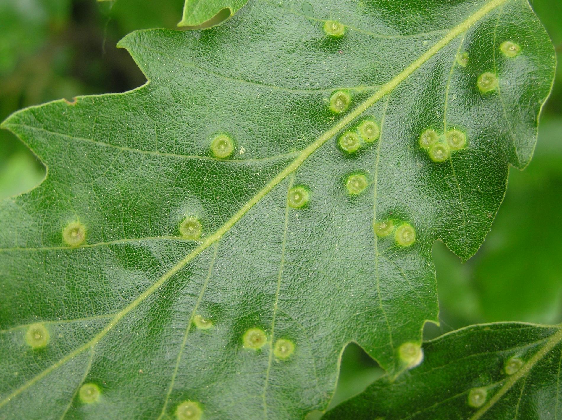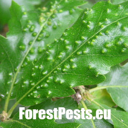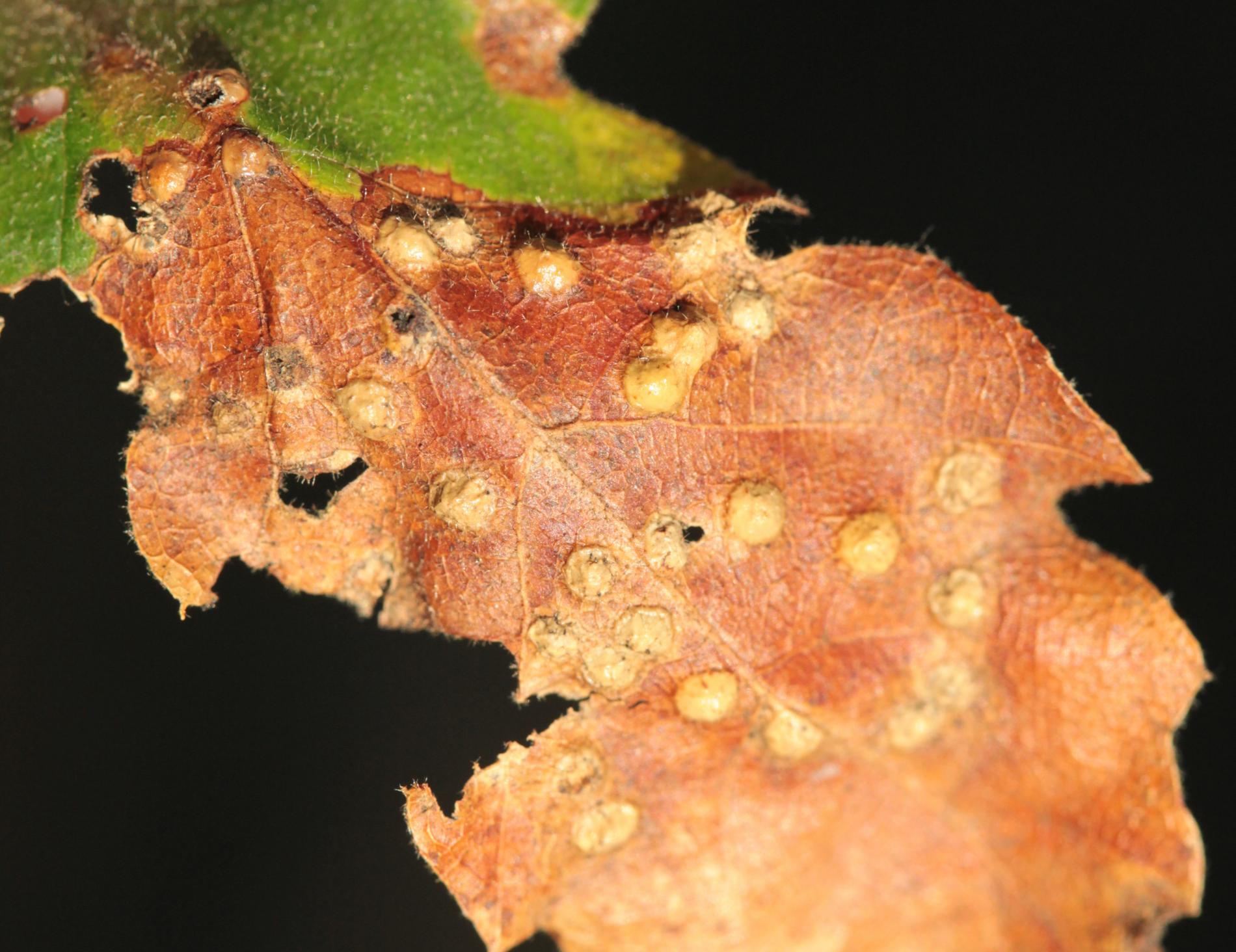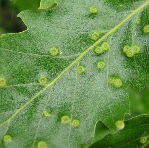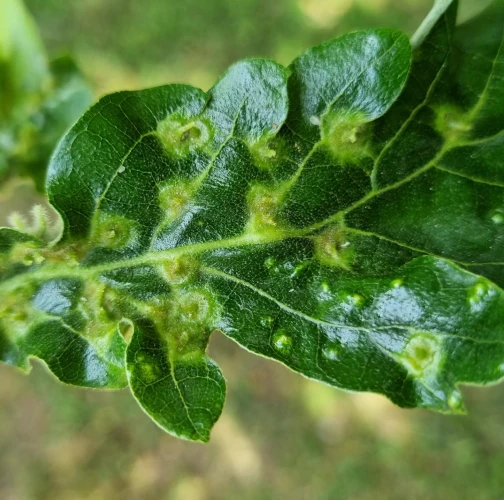 Na vrchnej strane listov sa tvoria 2 - 3 mm vysoké diskovité hrbolčeky - hálky. Na liste sa objavujú v zhlukoch po 20 – 50 ks.
