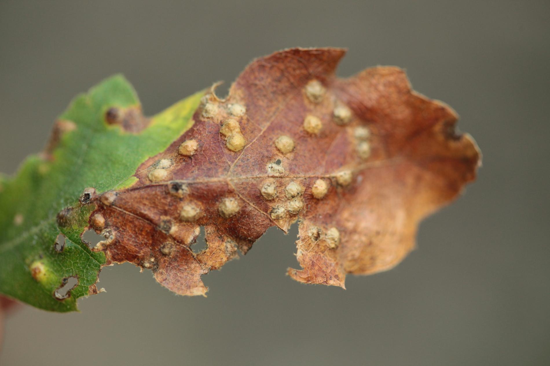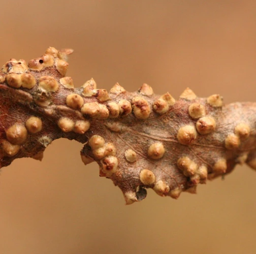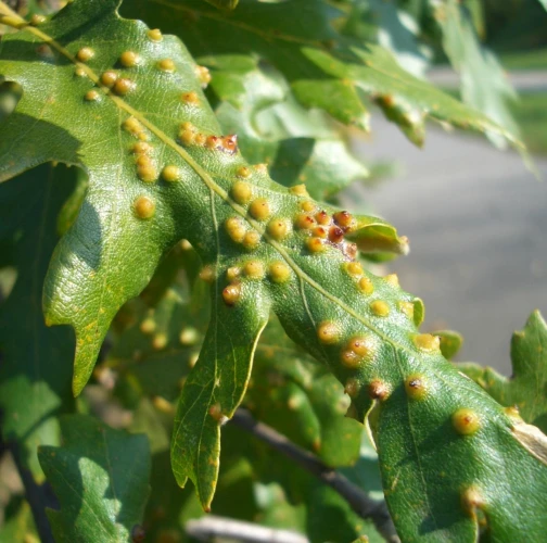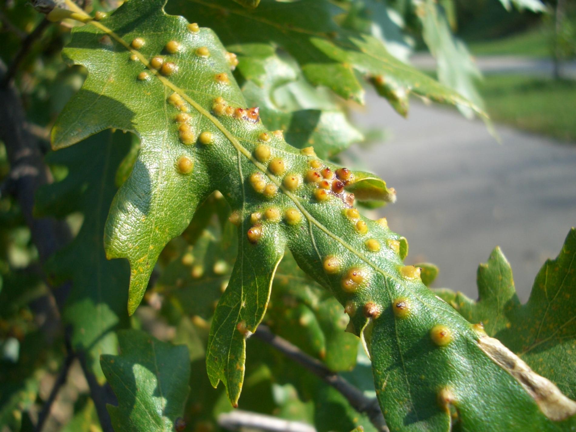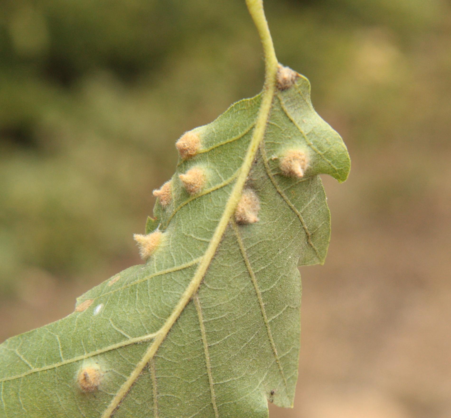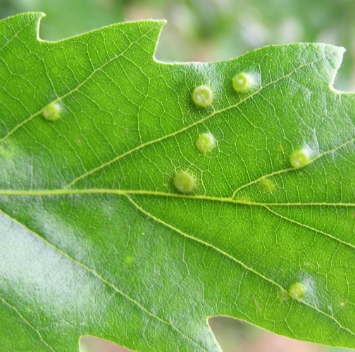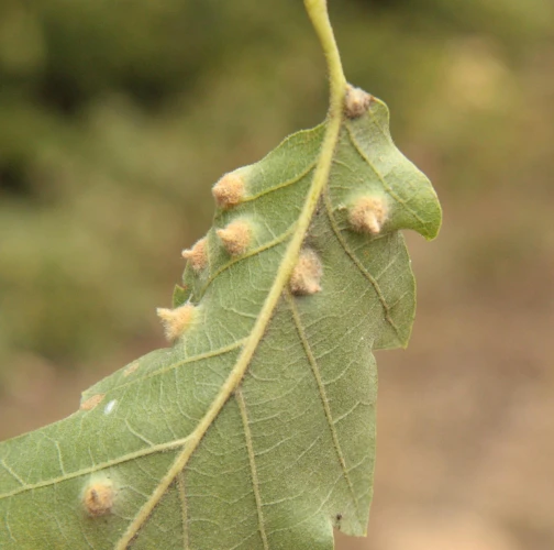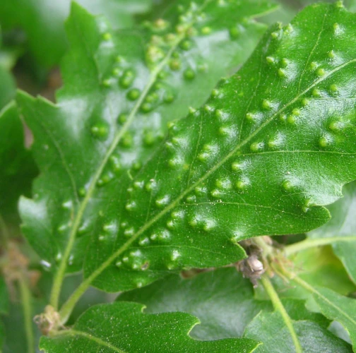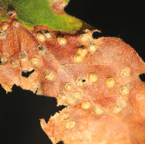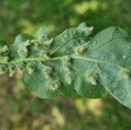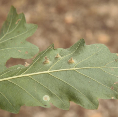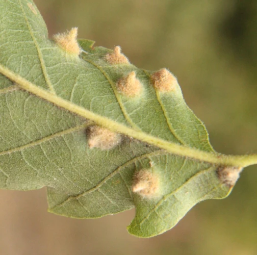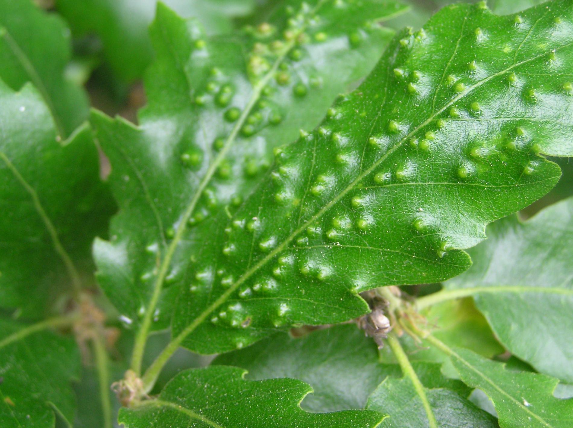 Na vrchnej strane listov sa tvoria 2 - 3 mm vysoké diskovité hrbolčeky - hálky. Na liste sa objavujú v zhlukoch po 20 – 50 ks.