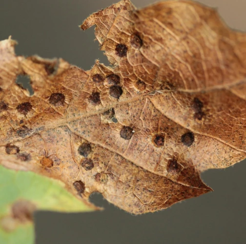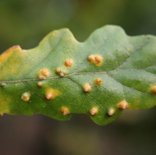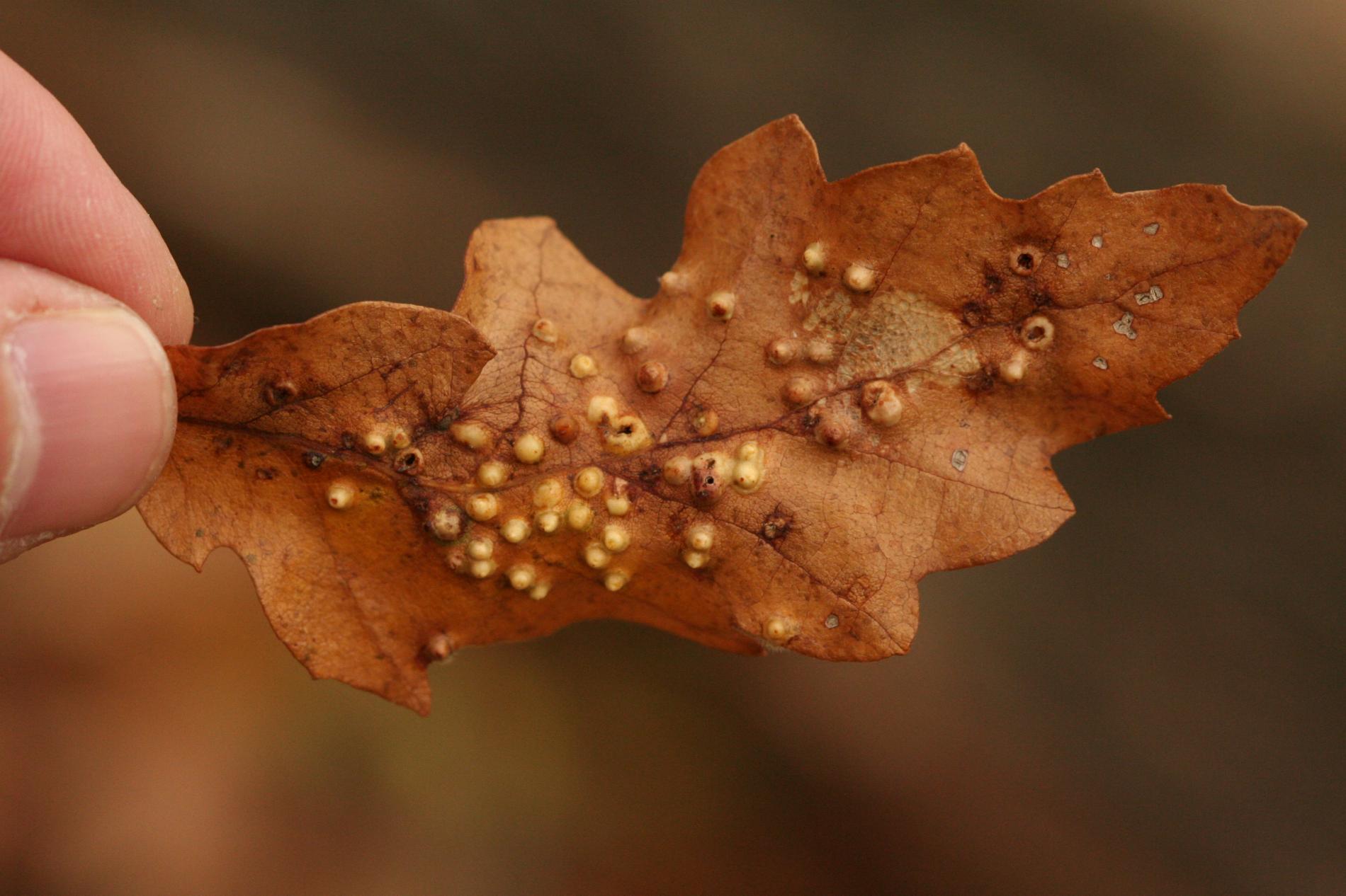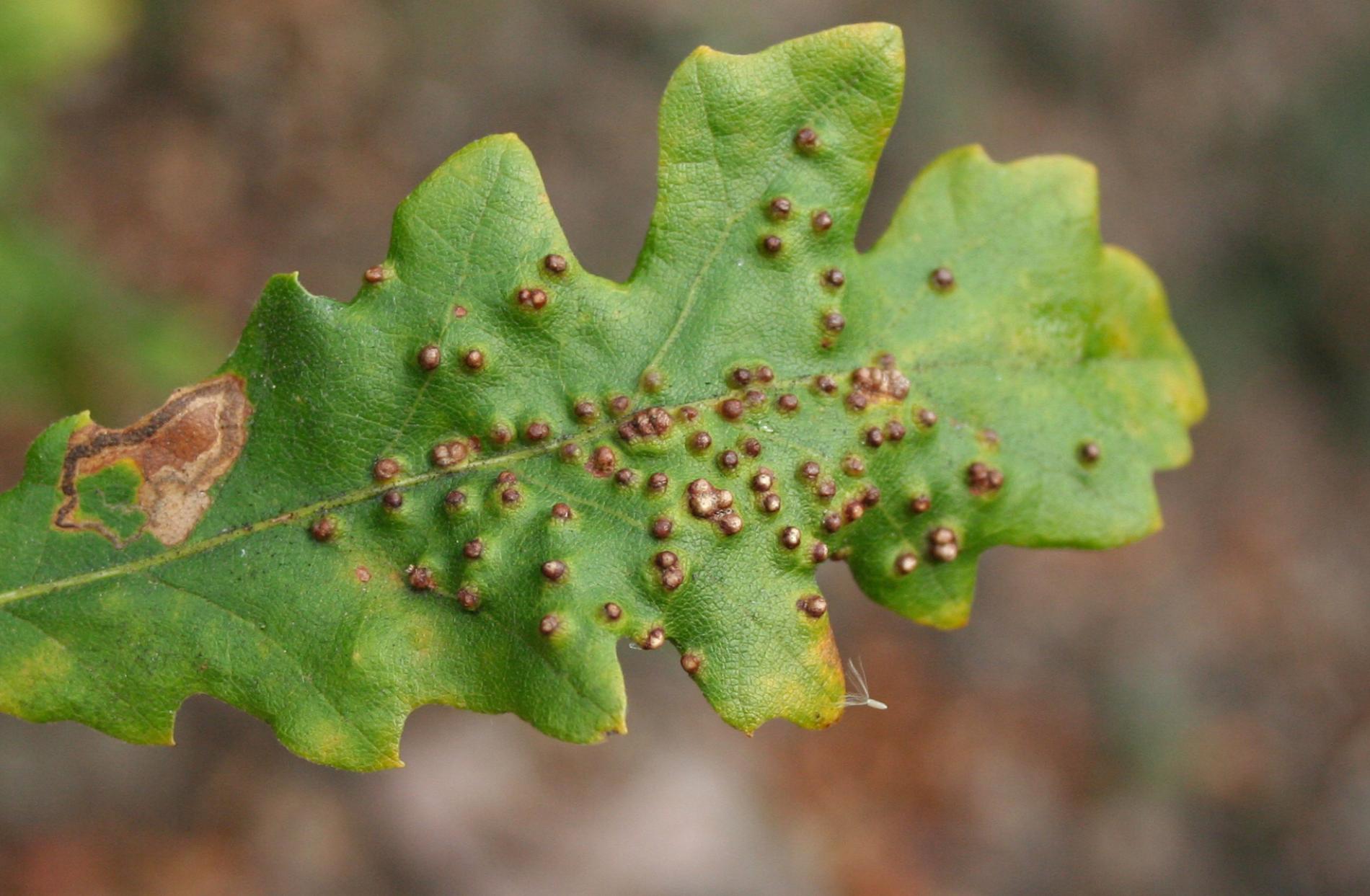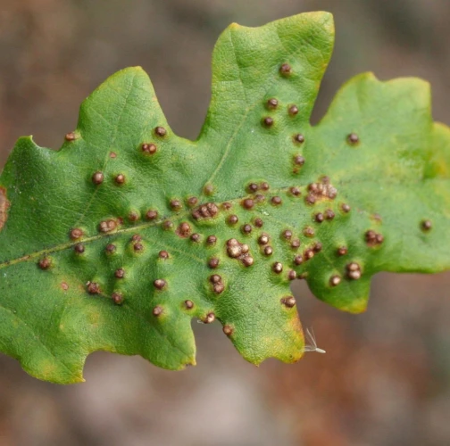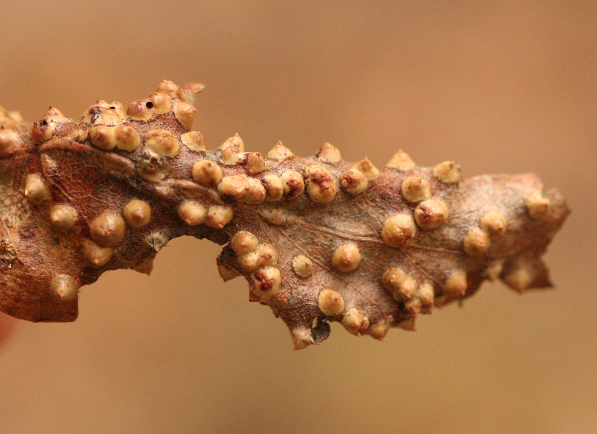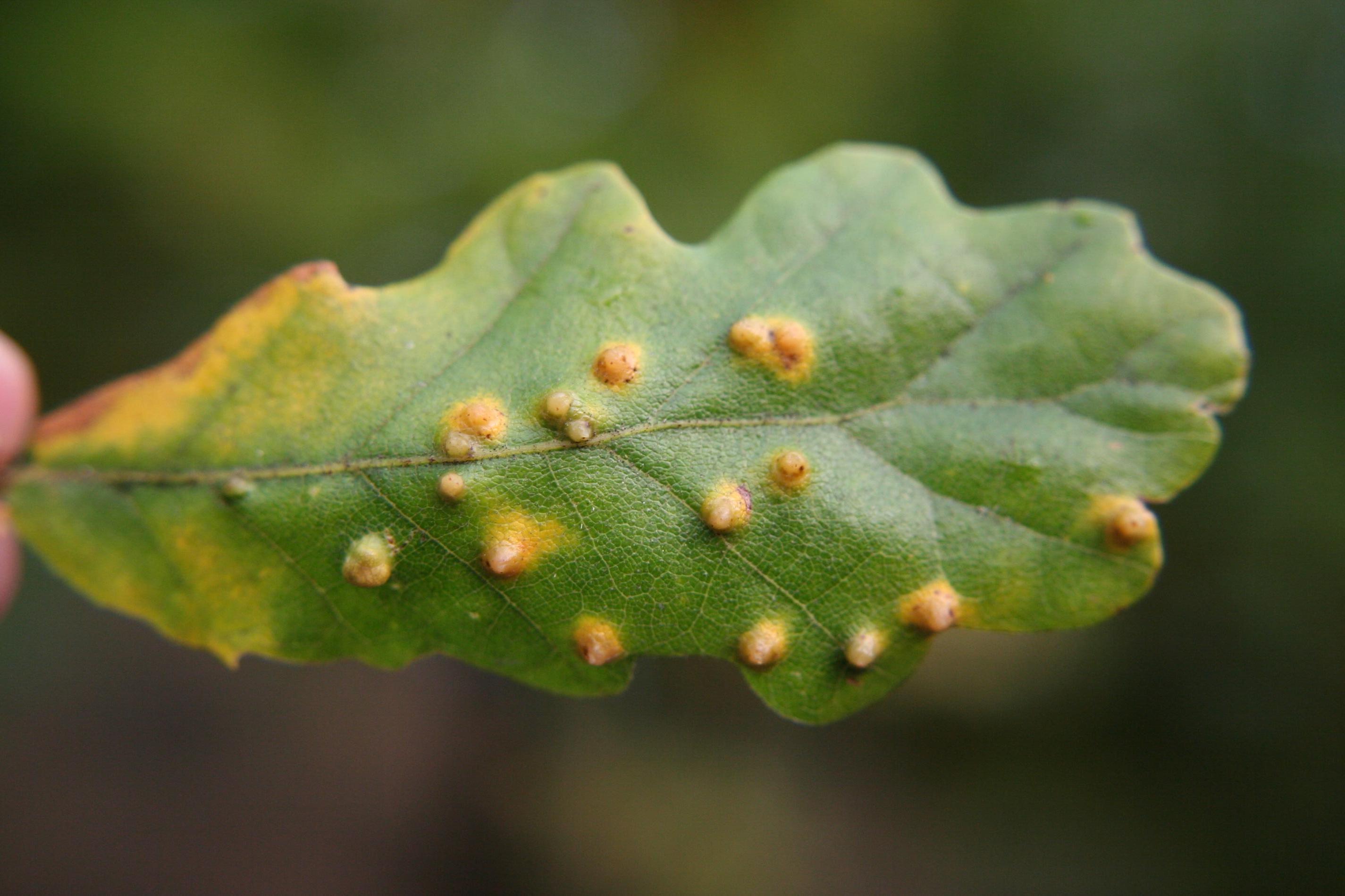 Na vrchnej strane listov sa tvoria 2 - 3 mm vysoké diskovité hrbolčeky - hálky. Na liste sa objavujú v zhlukoch po 20 – 50 ks.