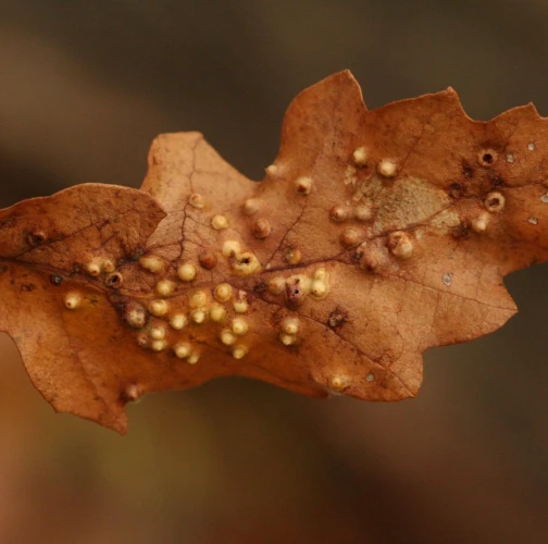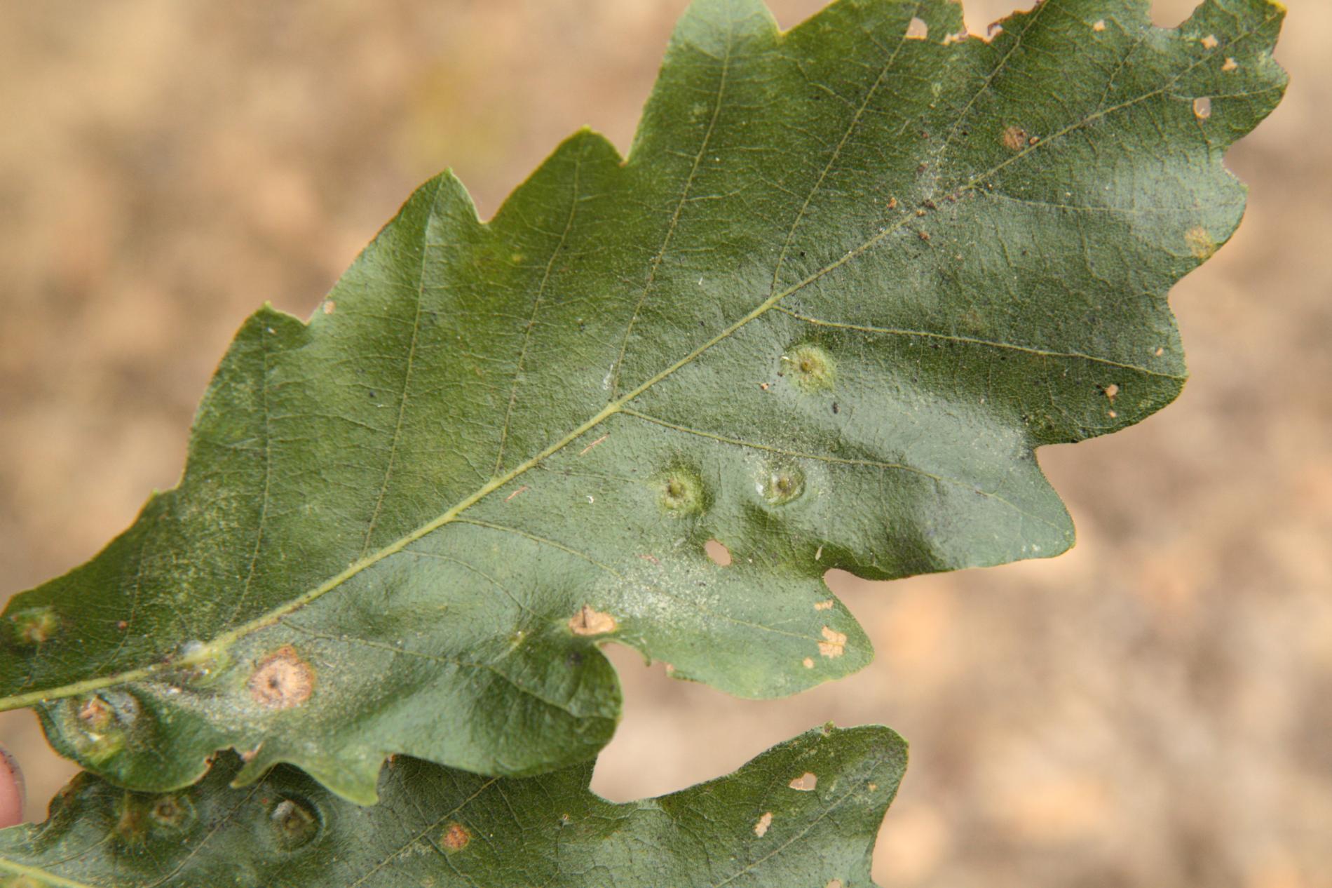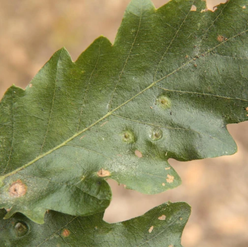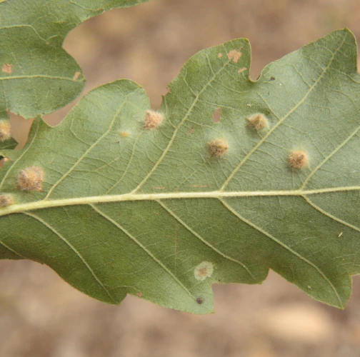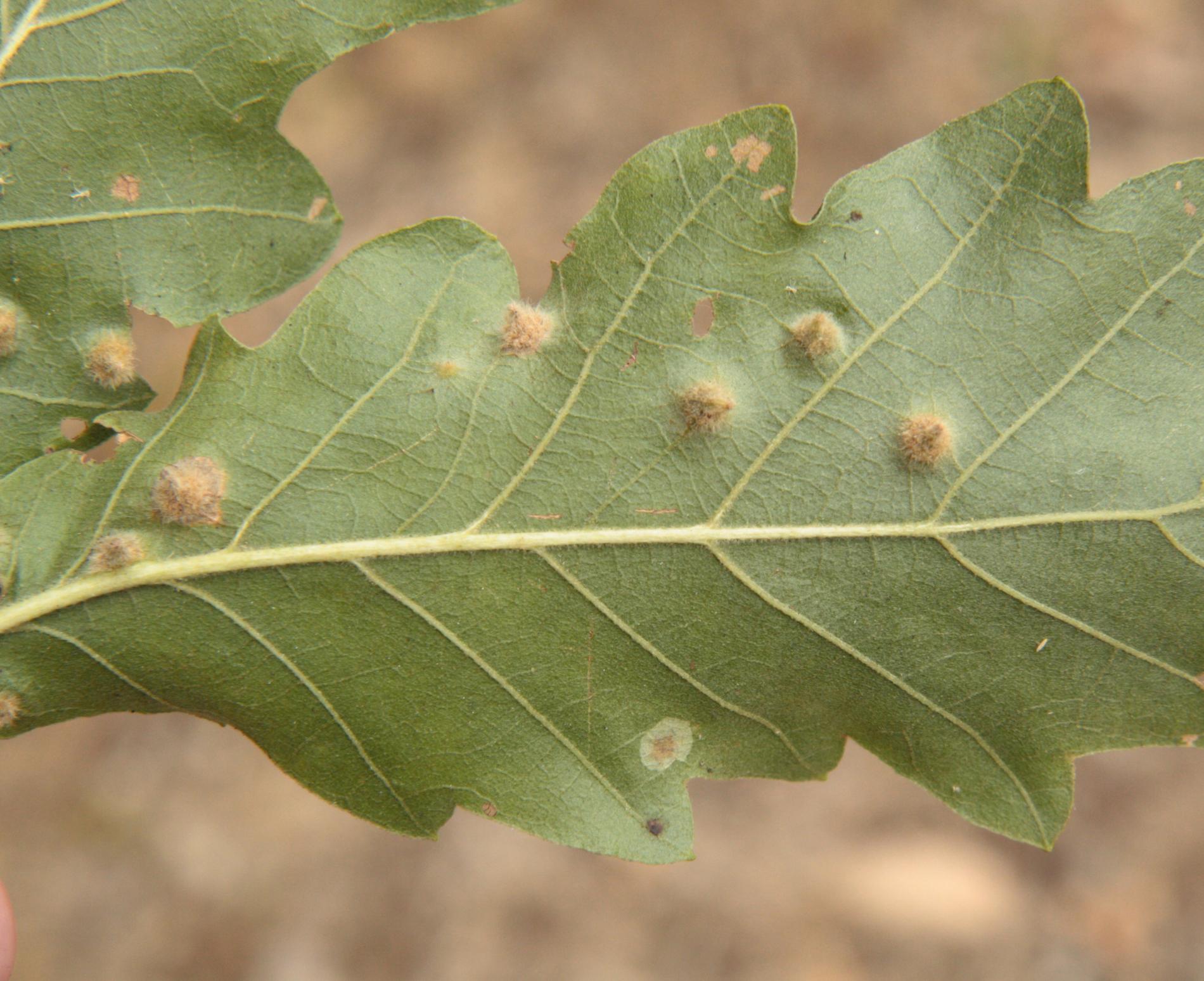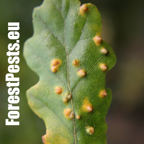 Na vrchnej strane listov duba cerového sa tvoria 2 - 3 mm vysoké diskovité hrbolčeky - hálky. Na liste sa objavujú v zhlukoch po 20 – 50 ks. Larva sa vyvíja vo vnútri hálky. Na jeseň, keď list opadne larva hálku opúšťa a kuklí sa v pôde. Počas roka má jednu generáciu.