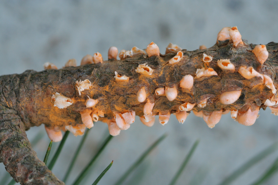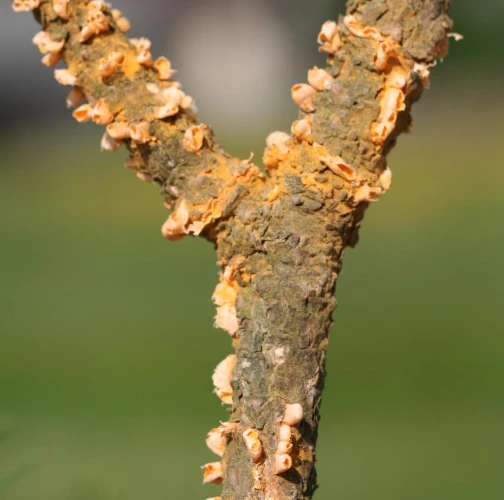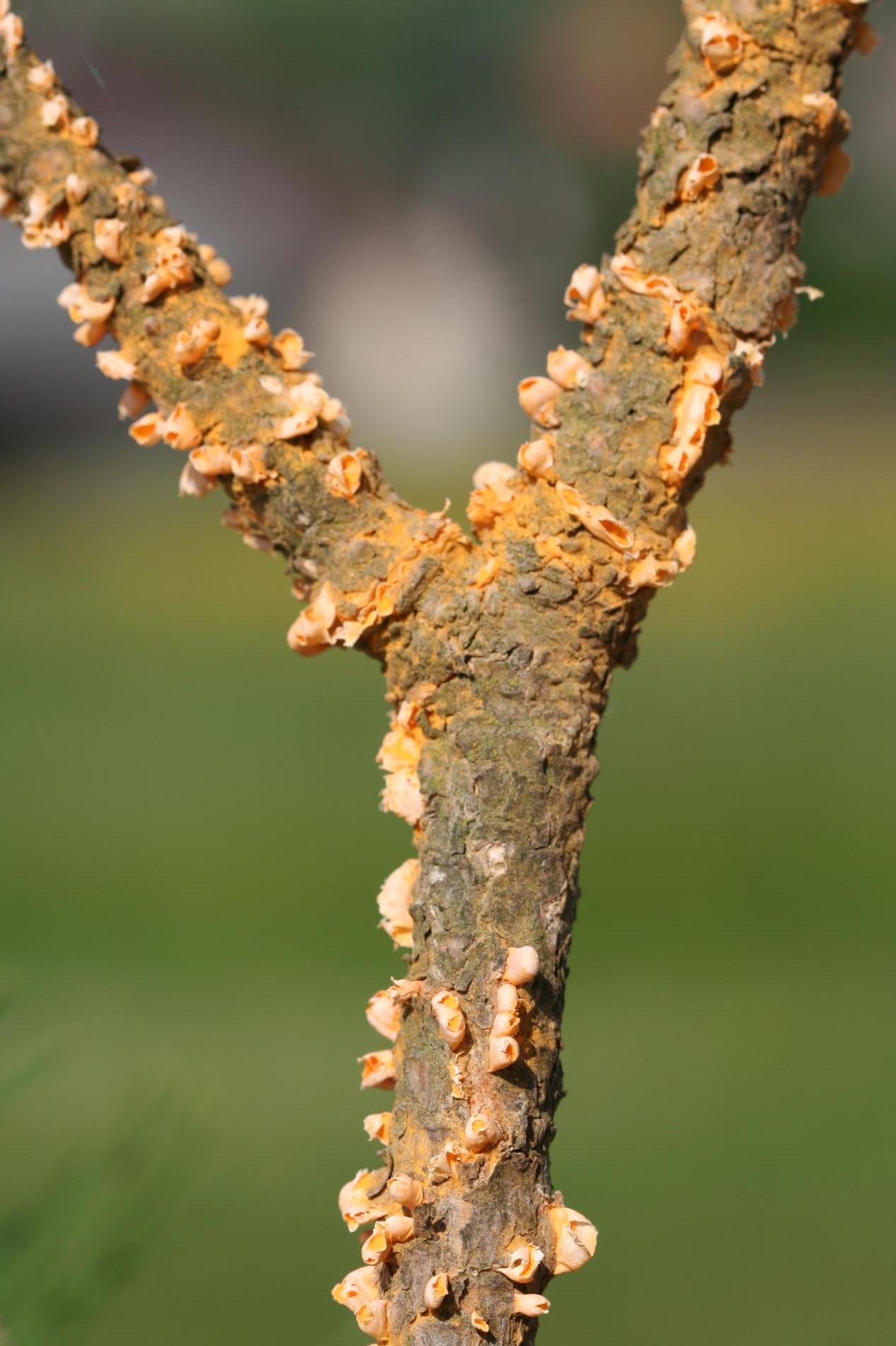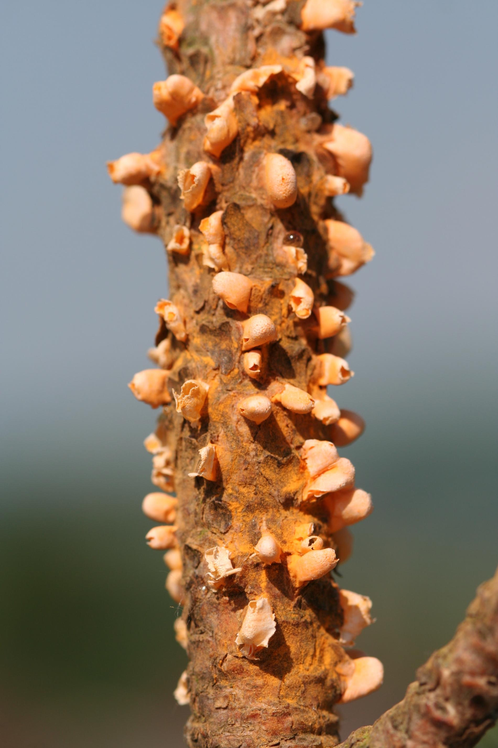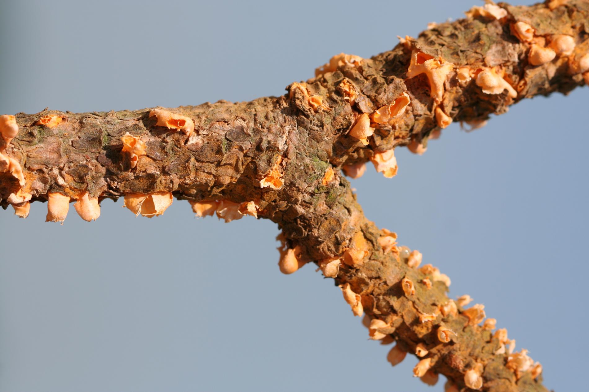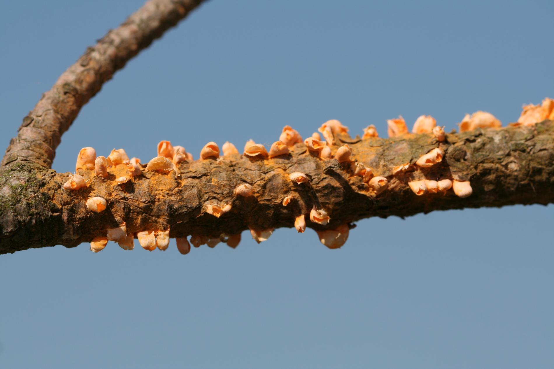 Na konároch alebo výhonkoch sa vyskytujú oranžové, živicové útvary, obsahujúcime oranžový prášok.