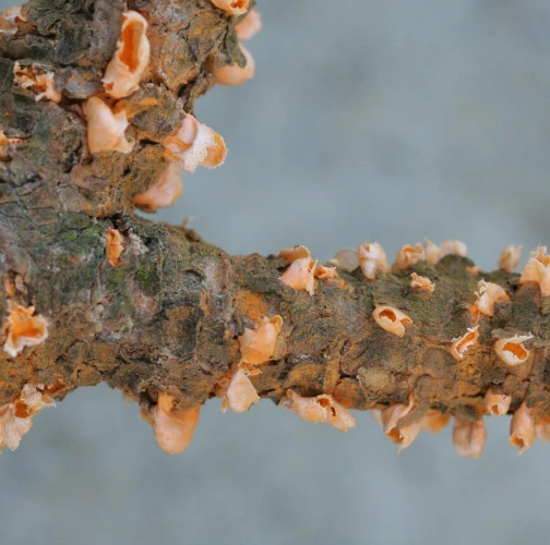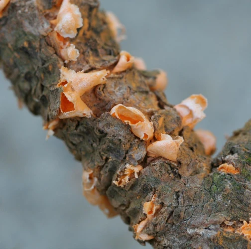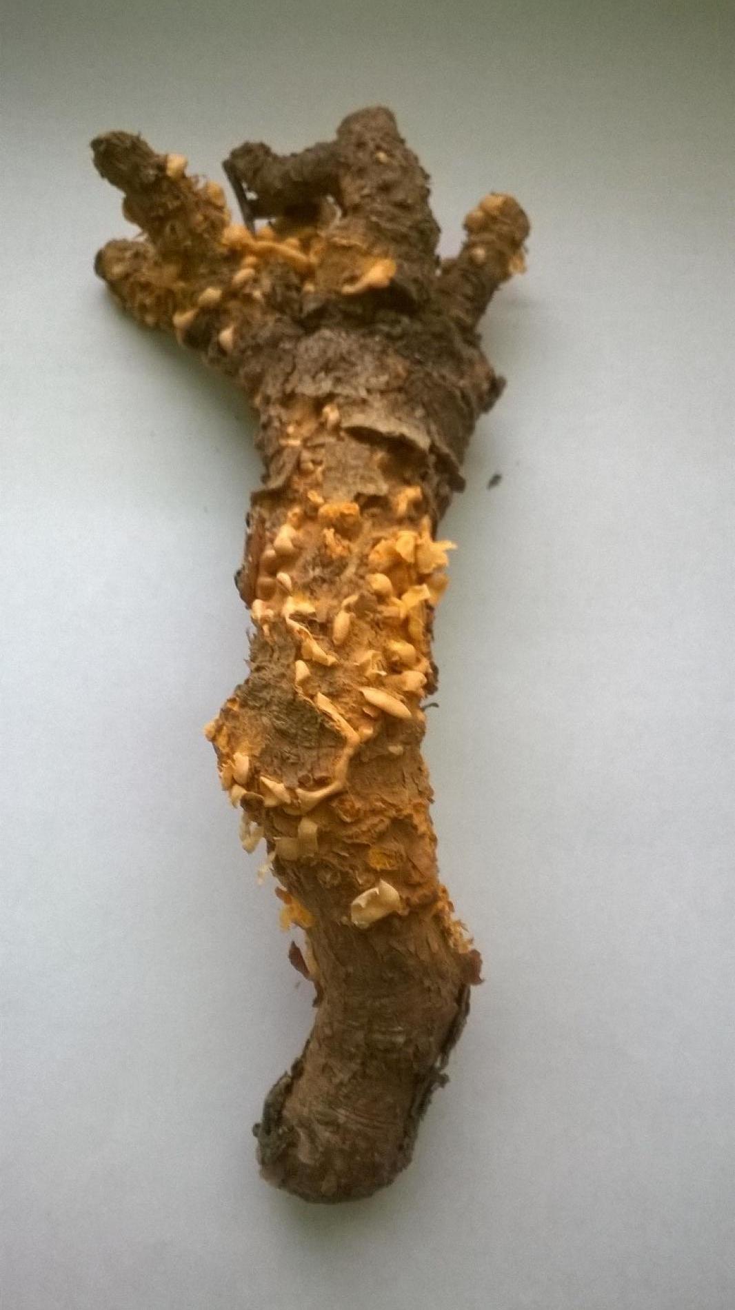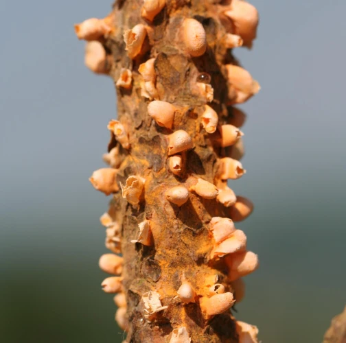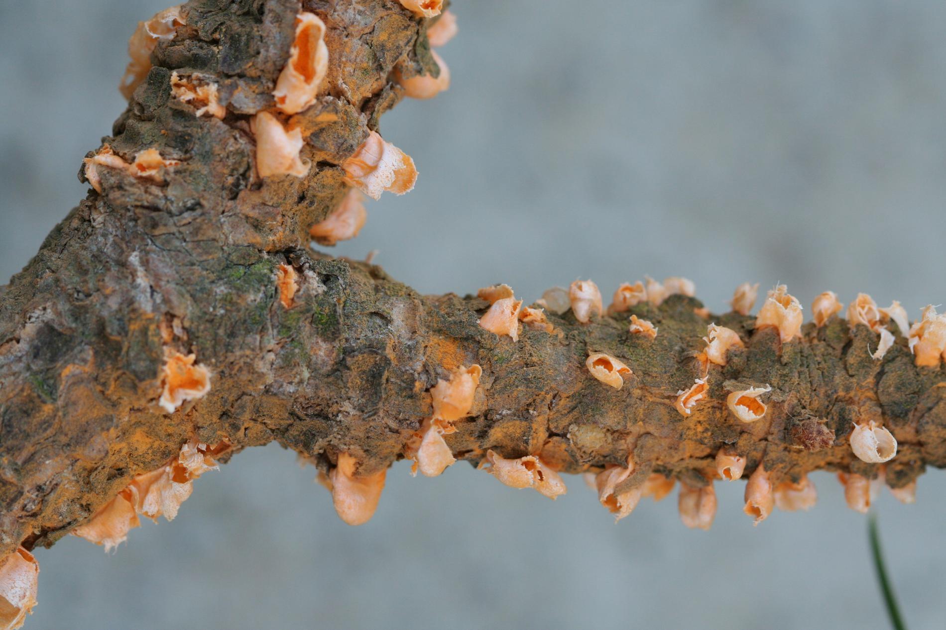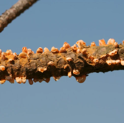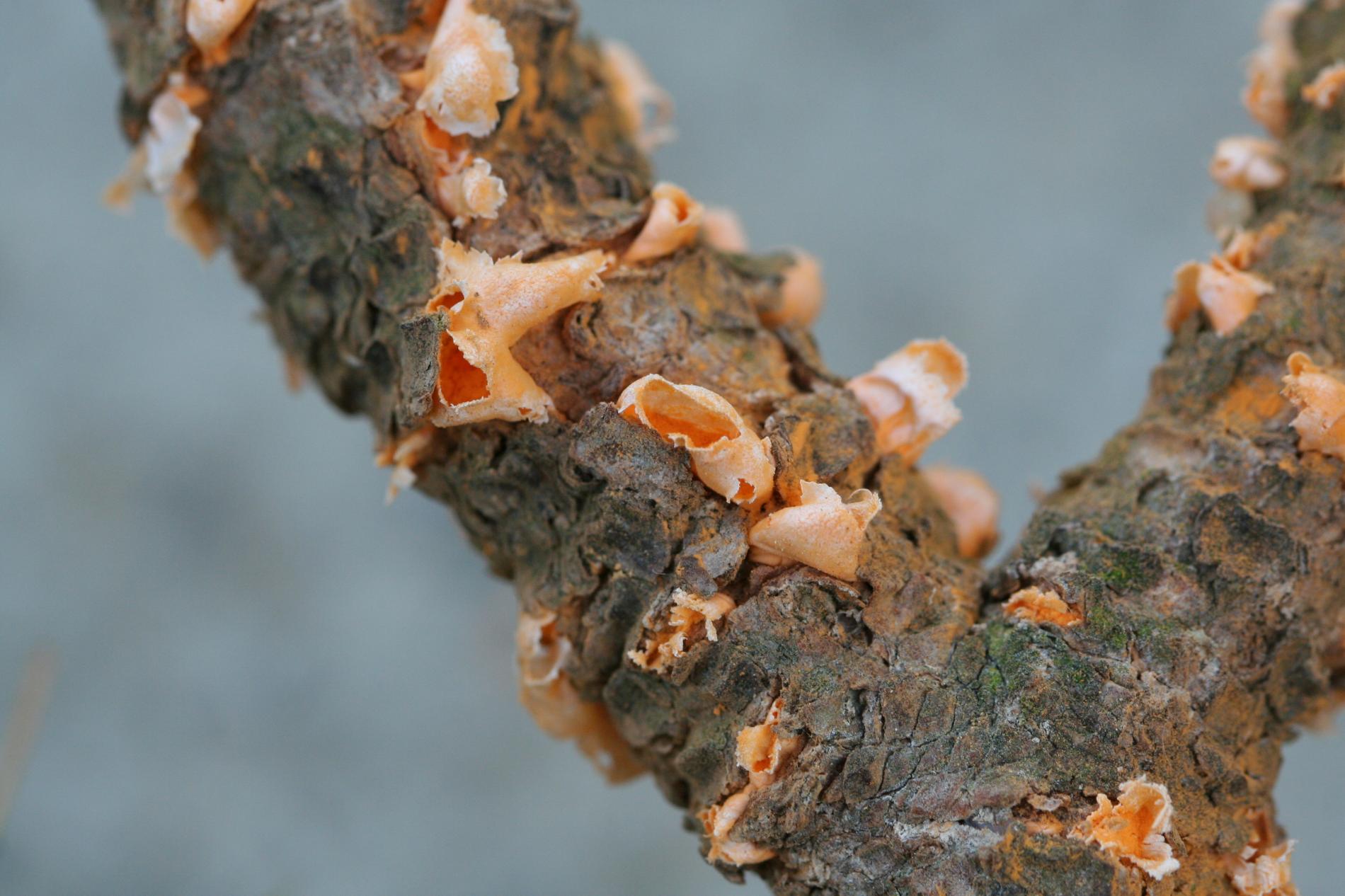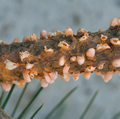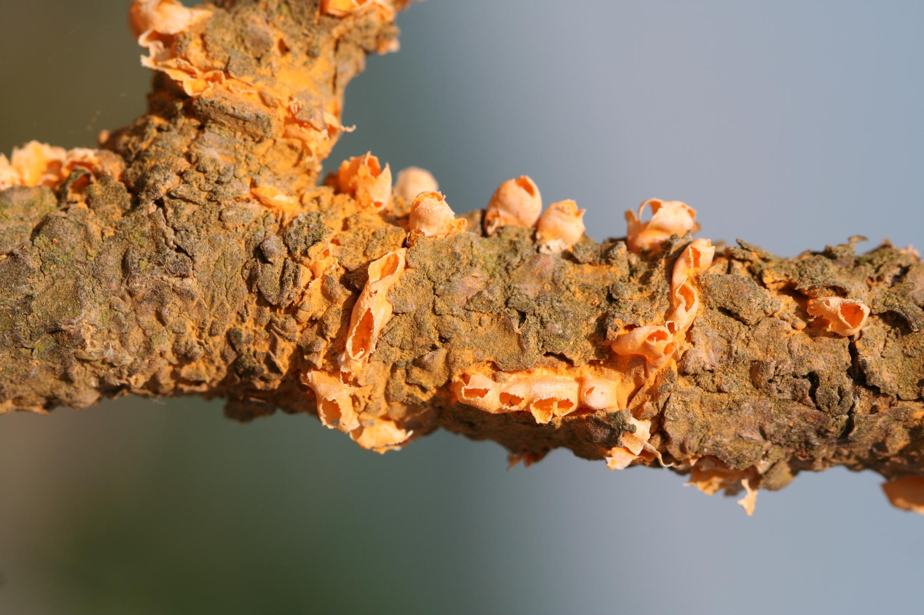 Na konároch alebo výhonkoch sa vyskytujú oranžové, živicové útvary, obsahujúcime oranžový prášok.