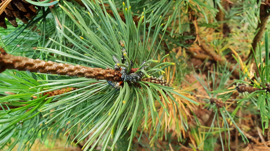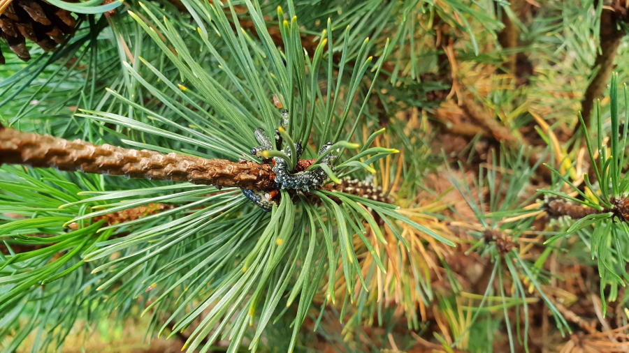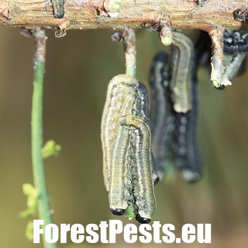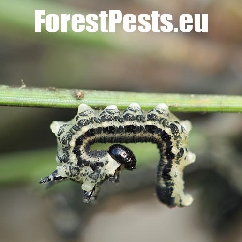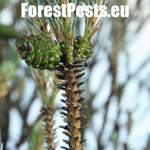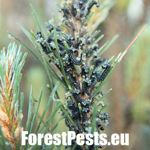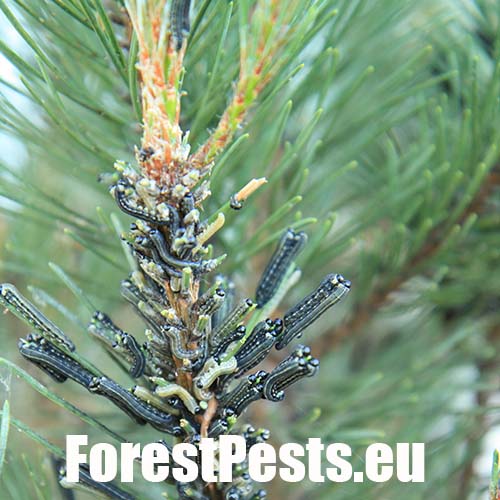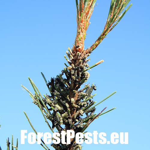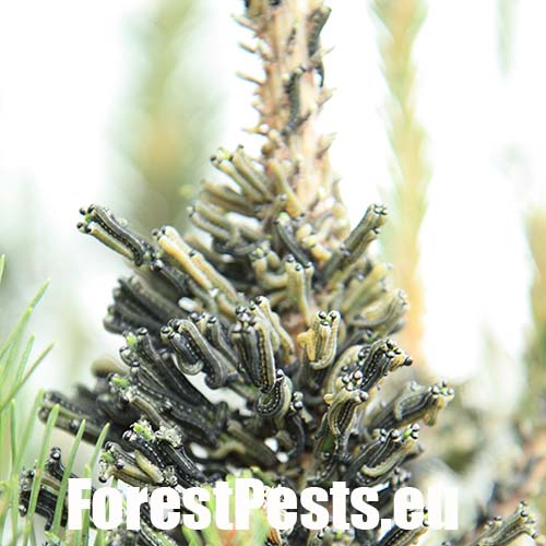 Na výhonkoch sú ihlice obžrané, najmä staršie ročníky tak, že na koncoch vetvičiek zostávajú iba štetôčky nových ihlíc. Larvy sú sivo hnedé, majú pozdĺžne pásy a tmavú hlavu.