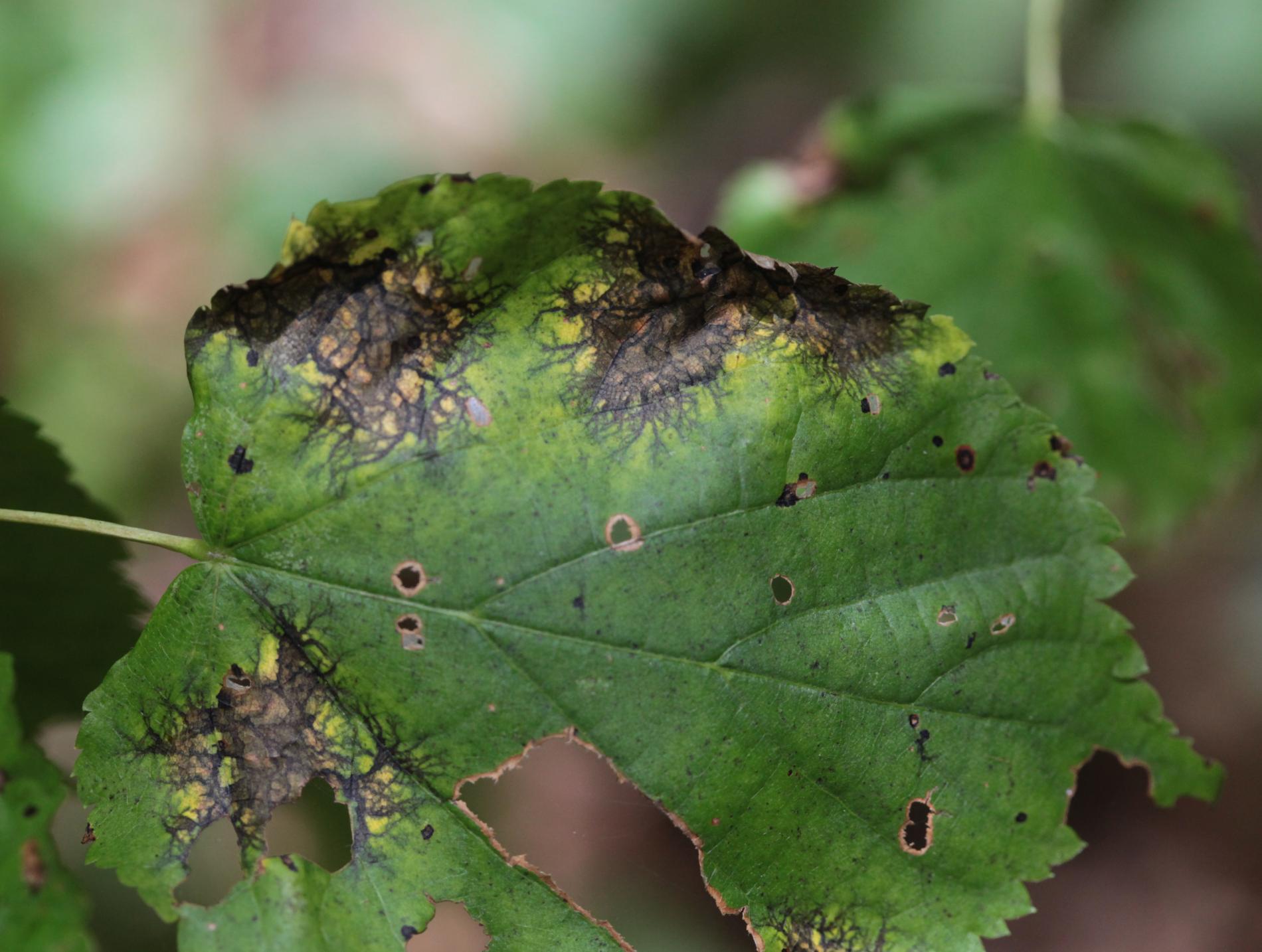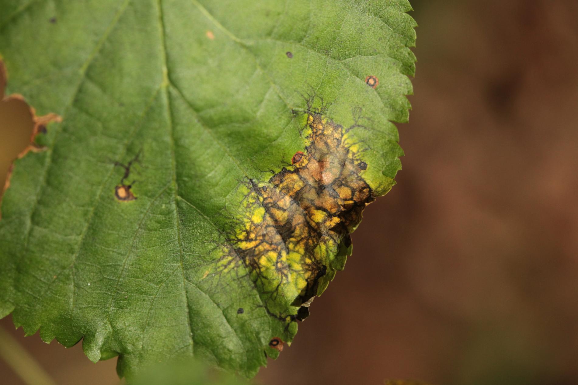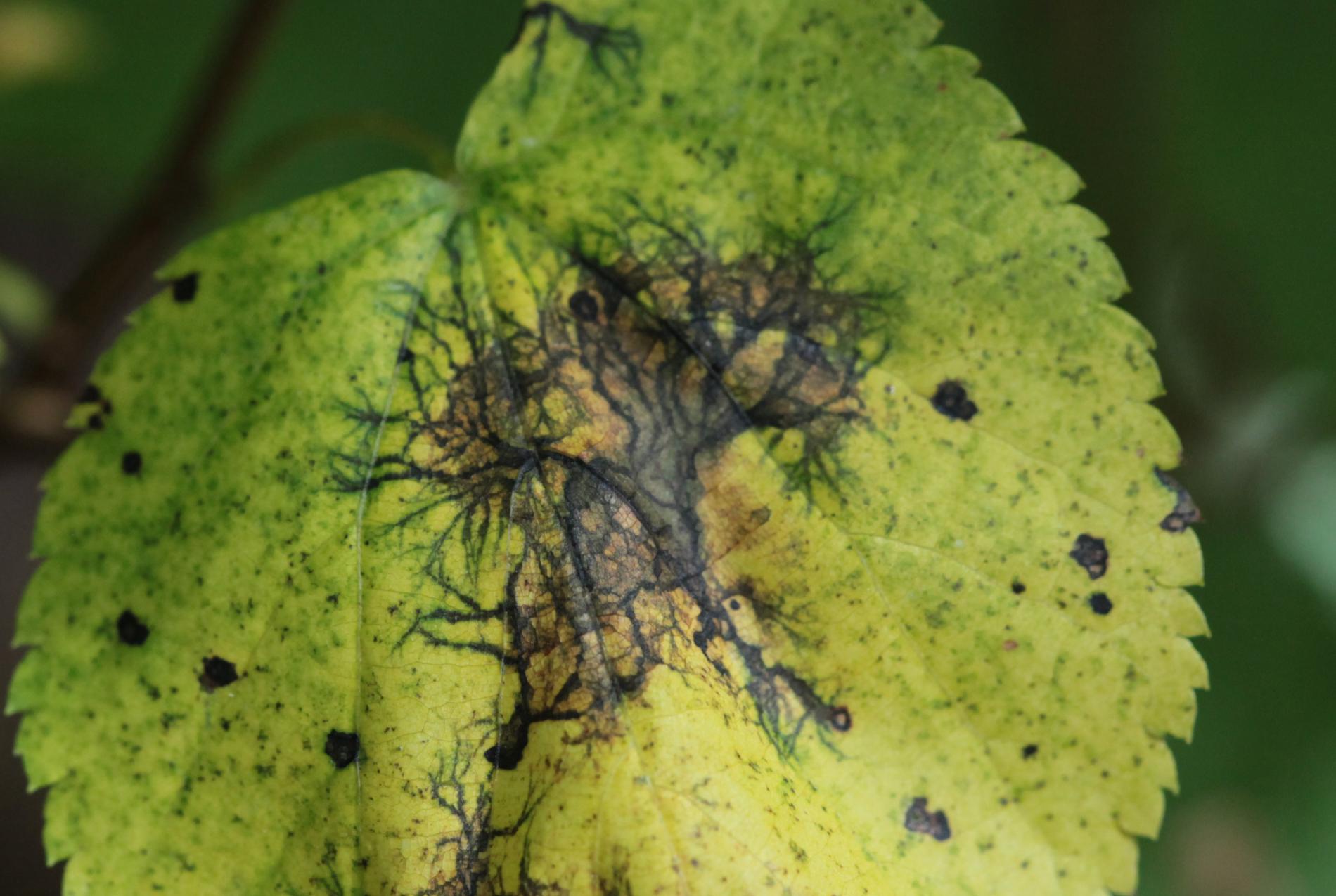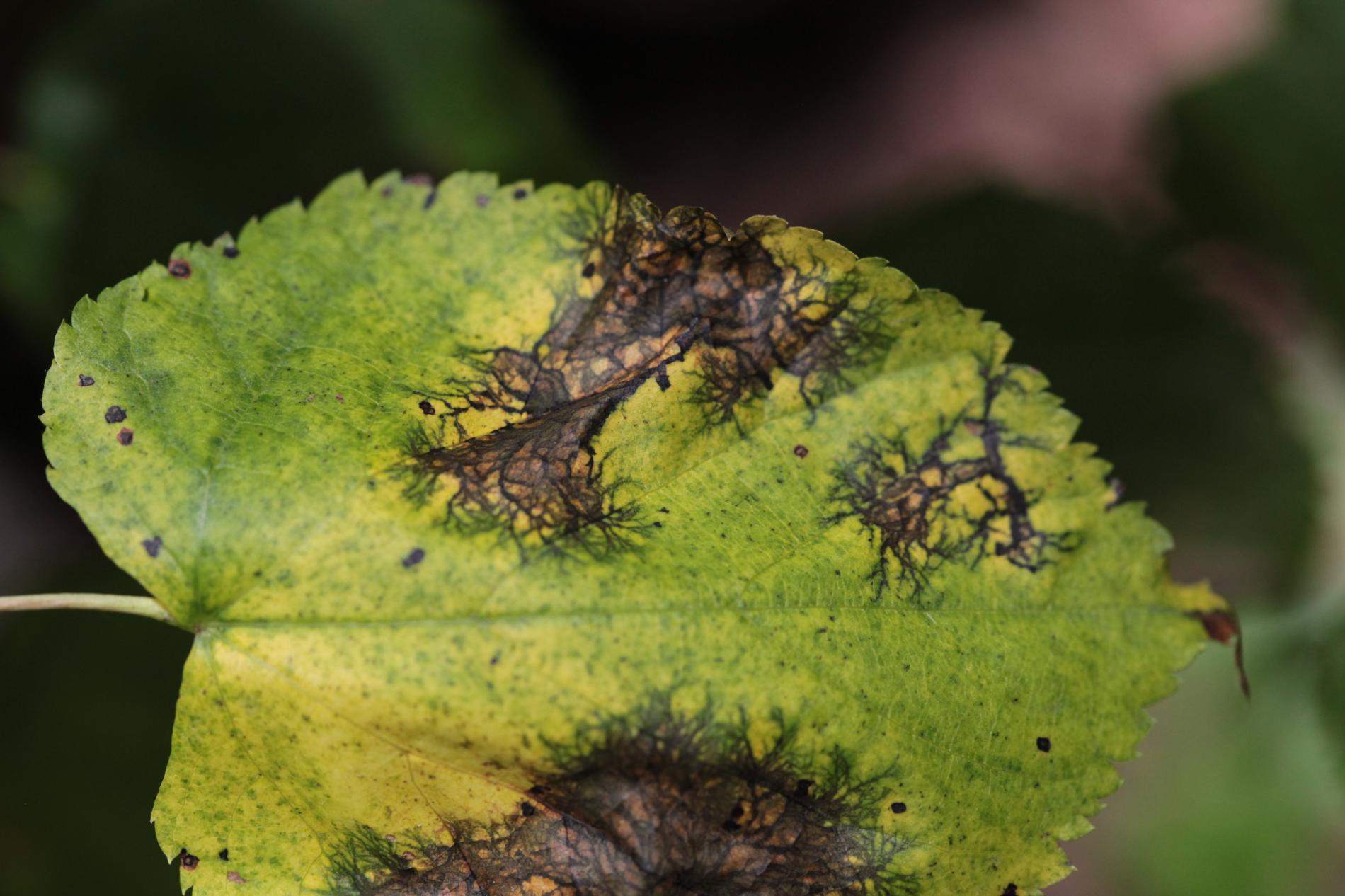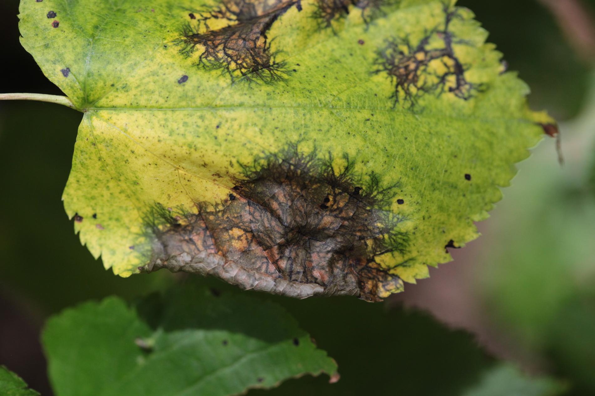 Výrazné tmavé lézie na listoch. Lézie sa rozširujú, spájajú a výsledkom sú škvrny nepravidelného tvaru. Okolie je sieťované.