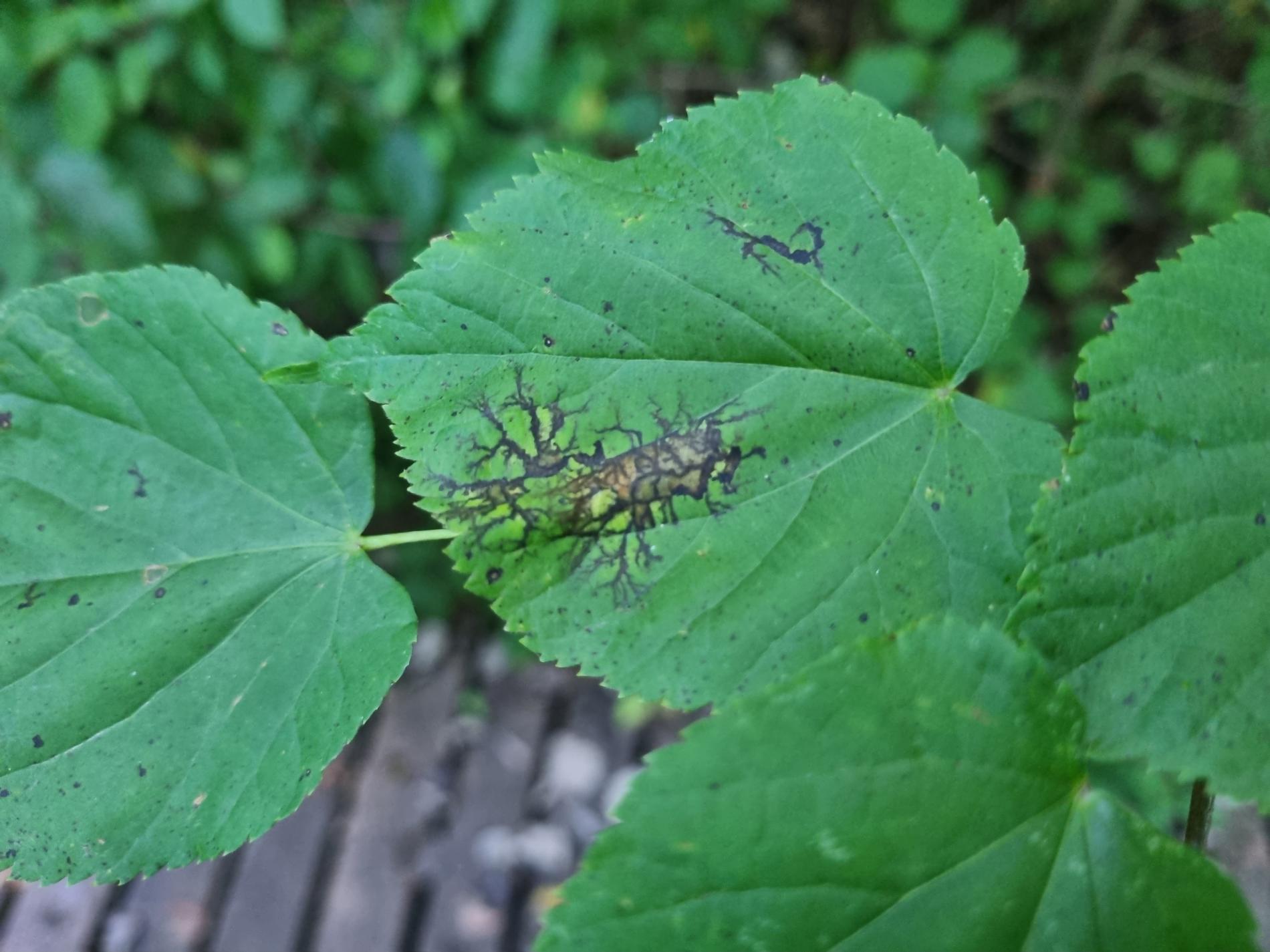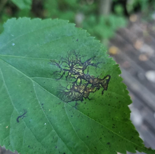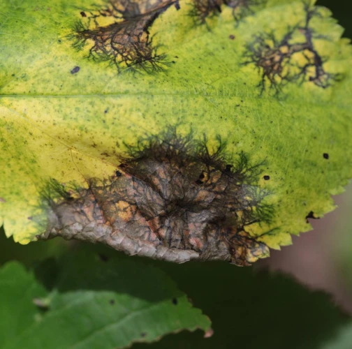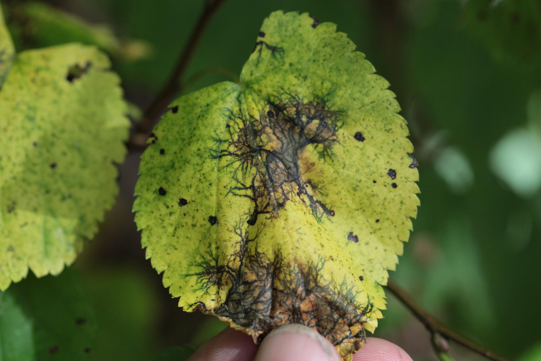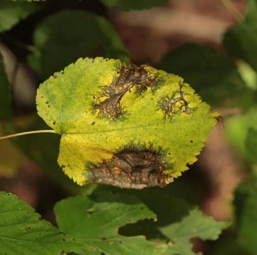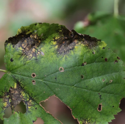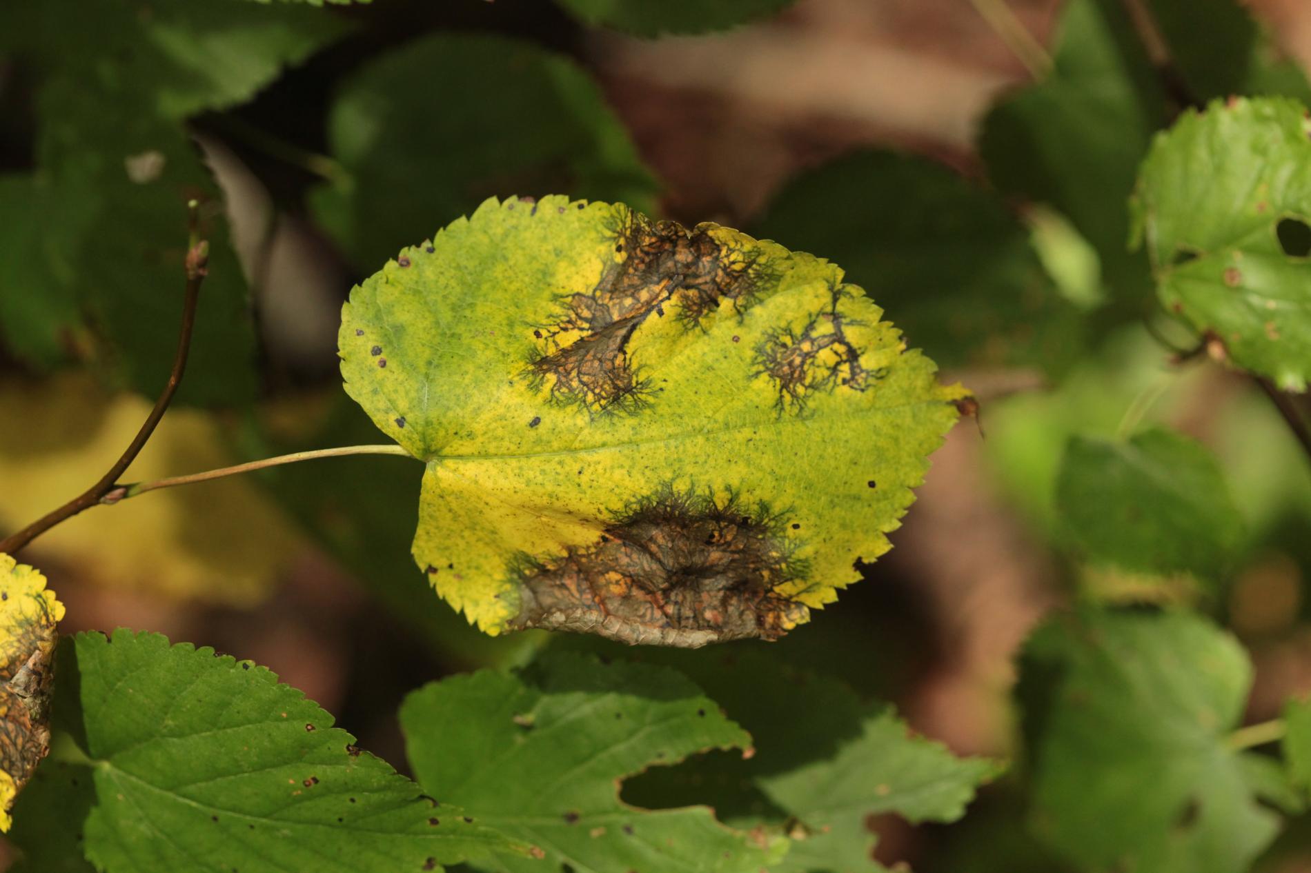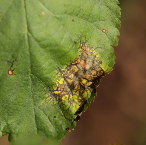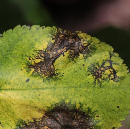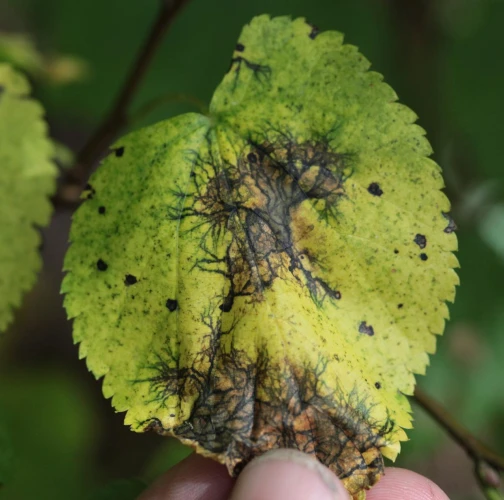 Výrazné tmavé lézie na listoch. Lézie sa rozširujú, spájajú a výsledkom sú škvrny nepravidelného tvaru. Okolie je sieťované.