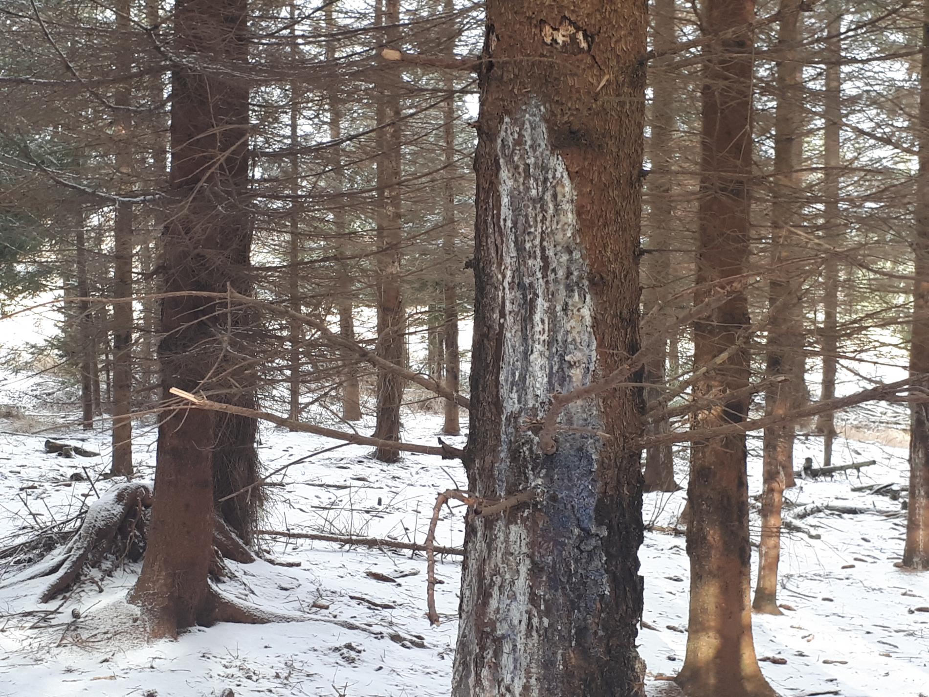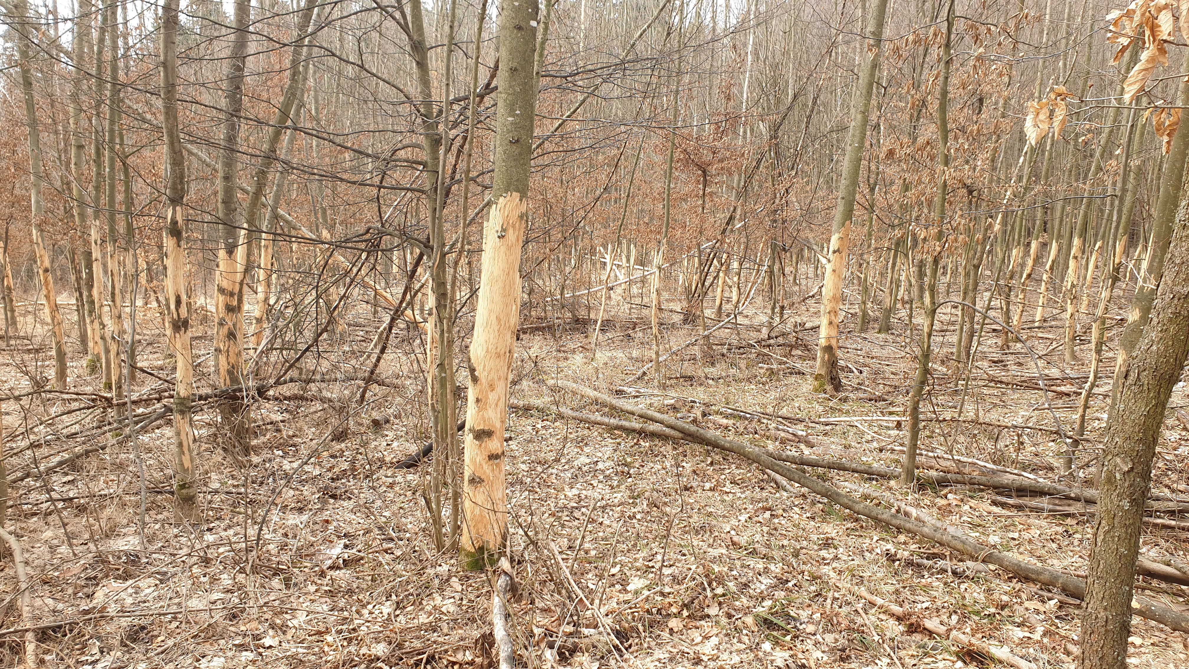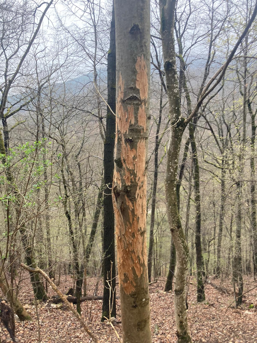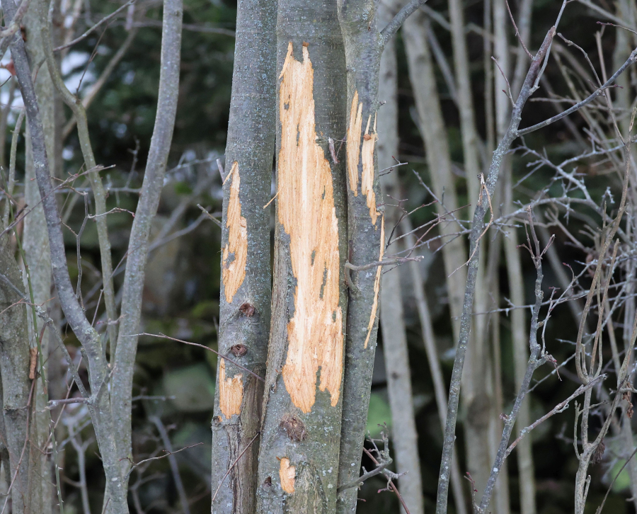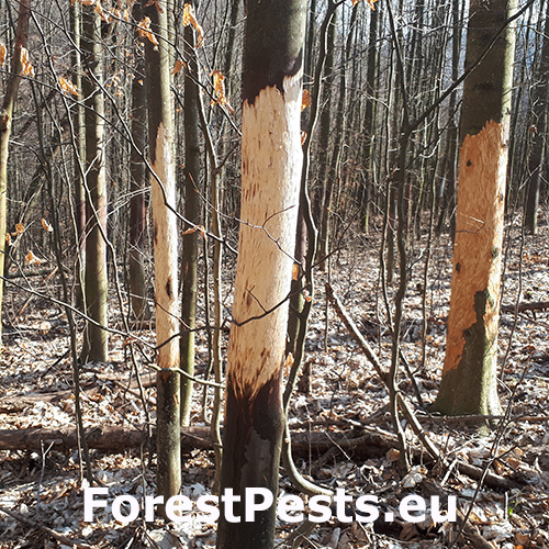 Kmene bez kôry so stopami po zuboch. Kusy kôry odtrhnuté z kmeňov, polámané konáre, chýbajúce terminálne výhonky a konáre zreteľne odhryznuté.