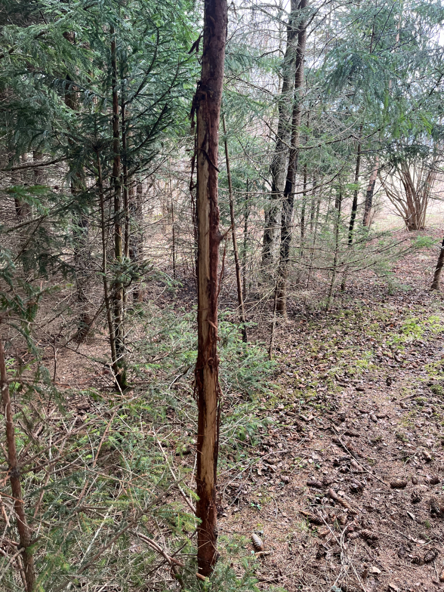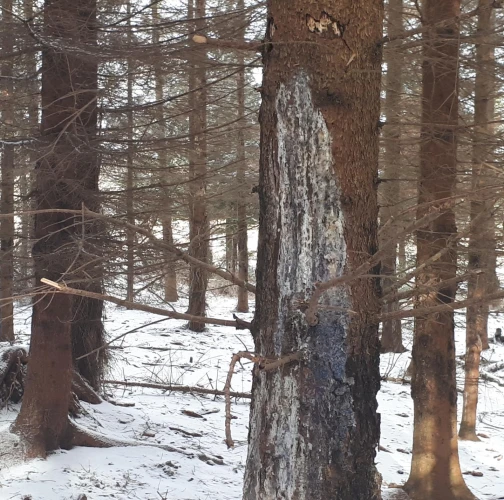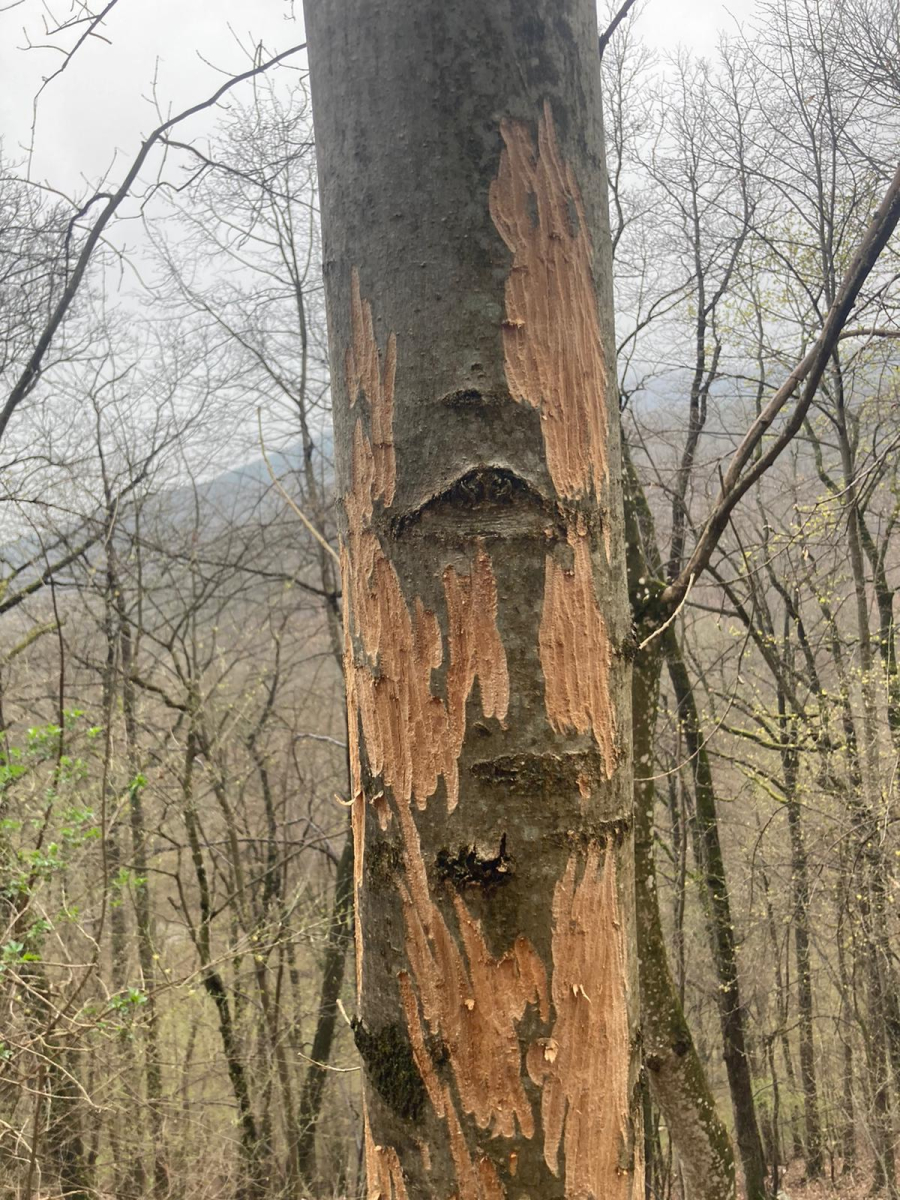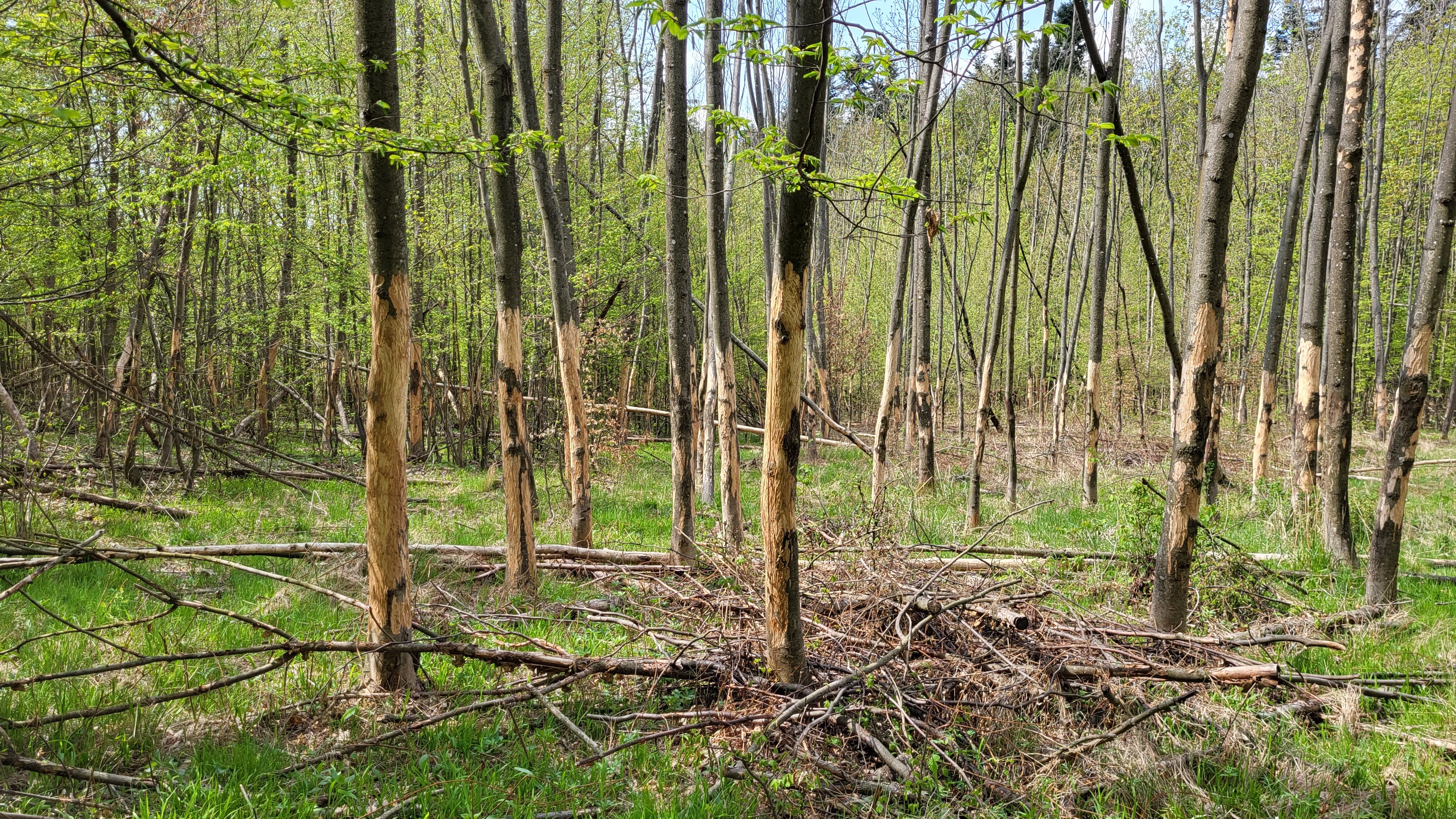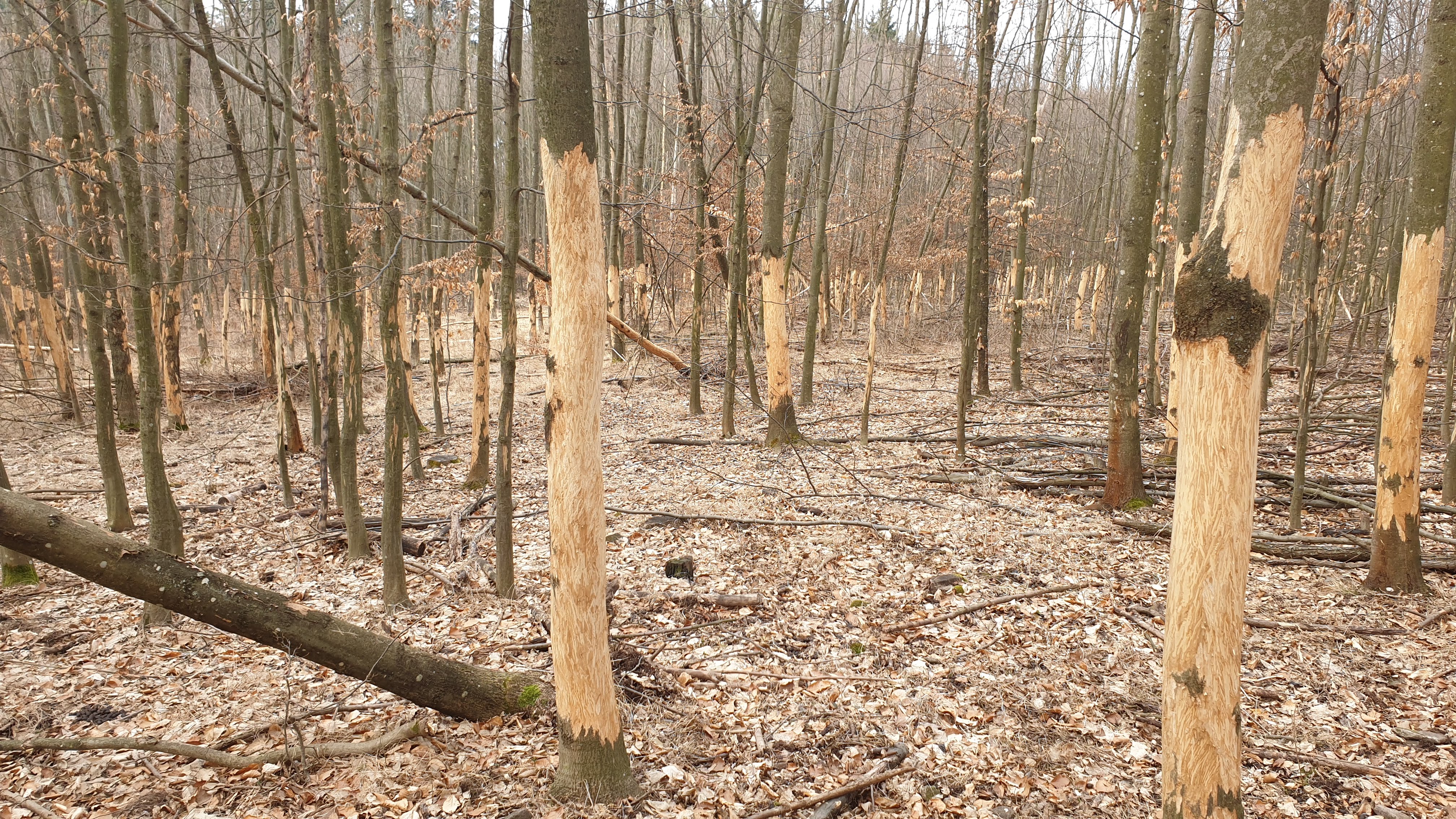 Kmene bez kôry so stopami po zuboch. Kusy kôry odtrhnuté z kmeňov, polámané konáre, chýbajúce terminálne výhonky a konáre zreteľne odhryznuté.