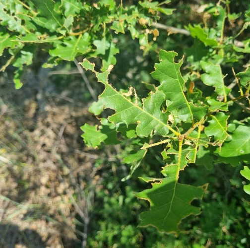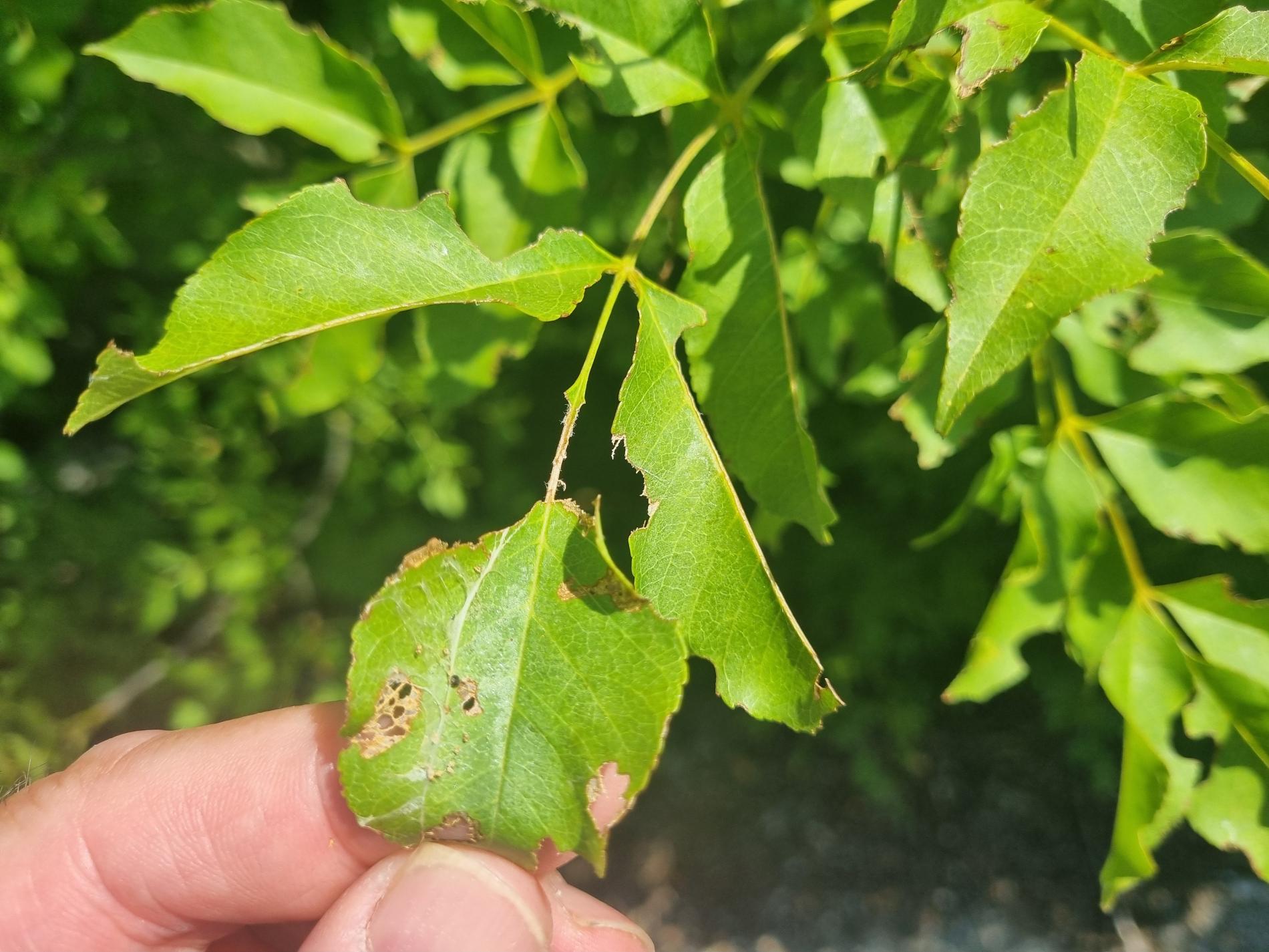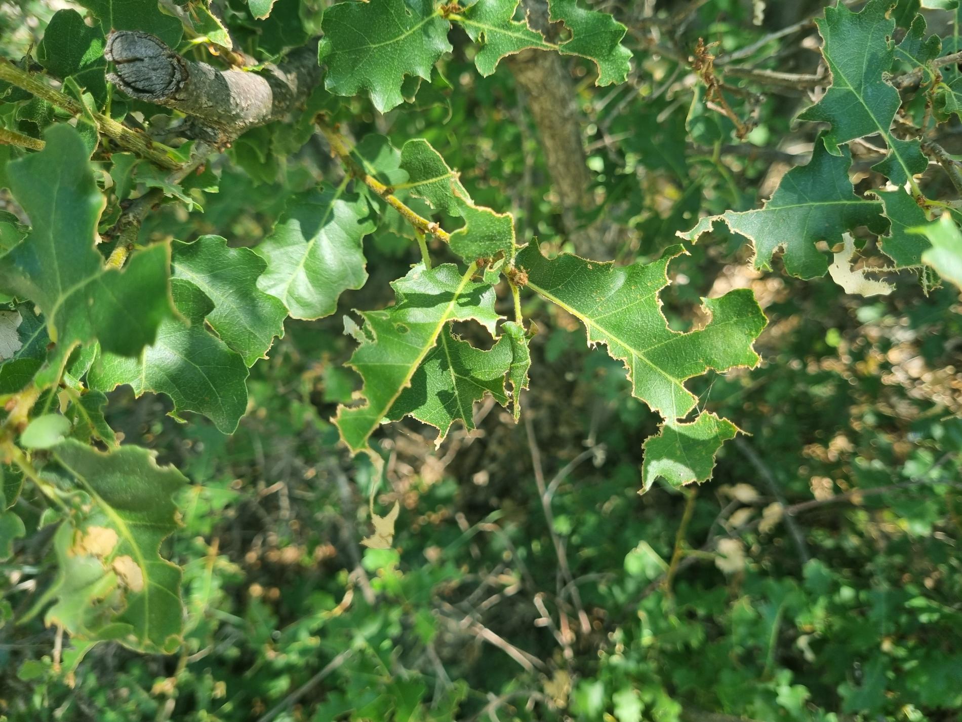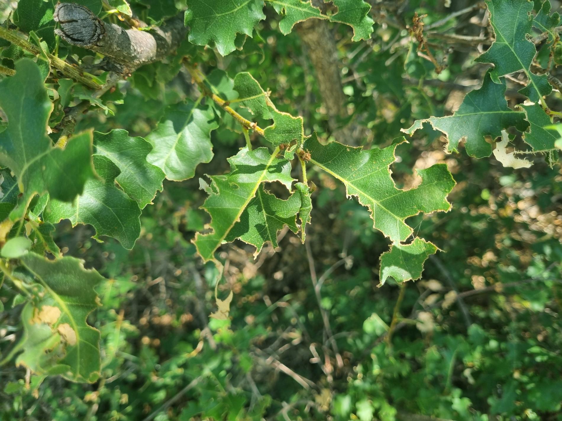 Nepravidelne poškodené okraje listov, čiastočne chýbajúce časti listovej čepele, drobné výrezy na listoch krov a listnatých stromov.