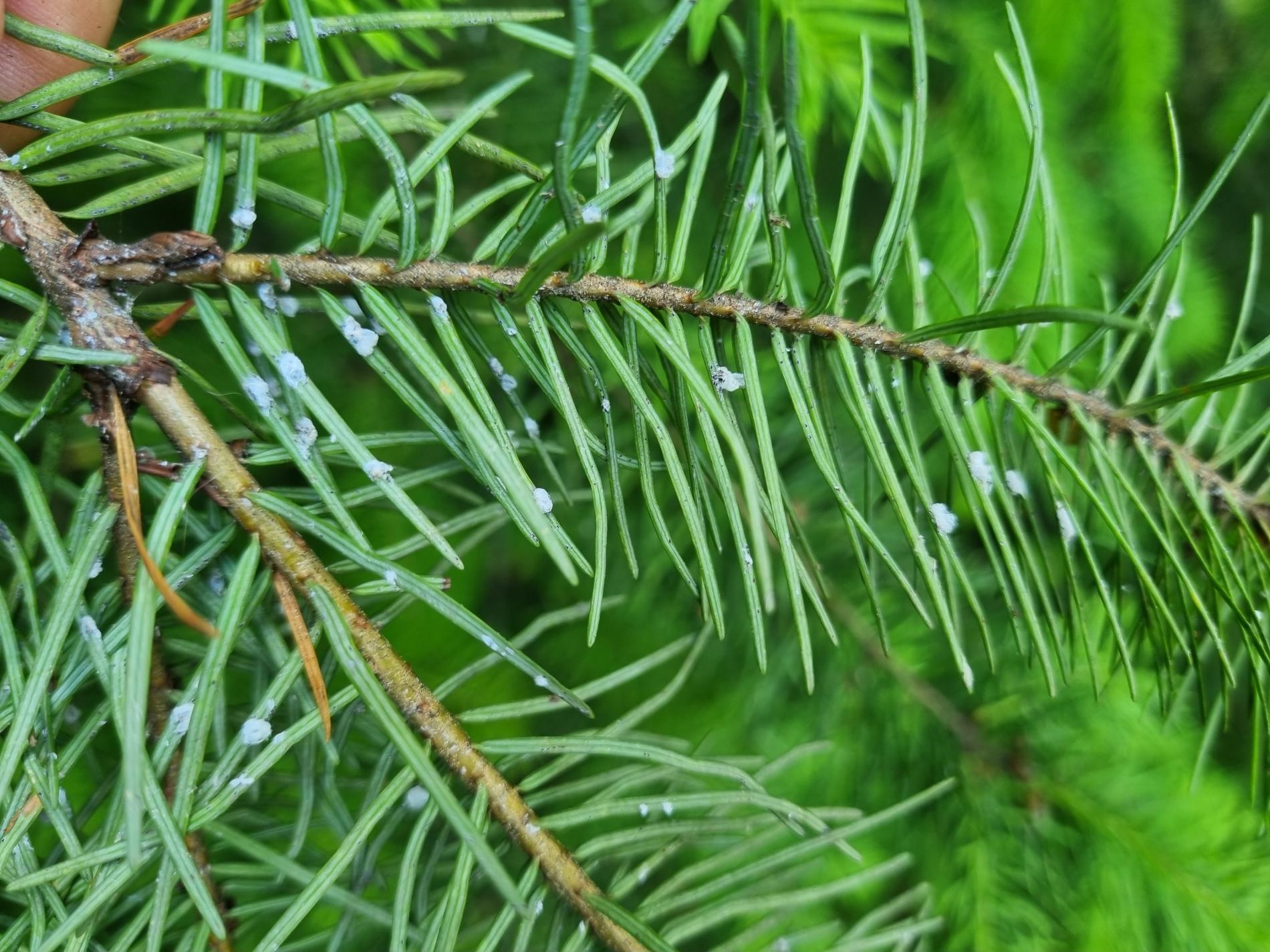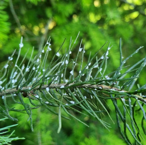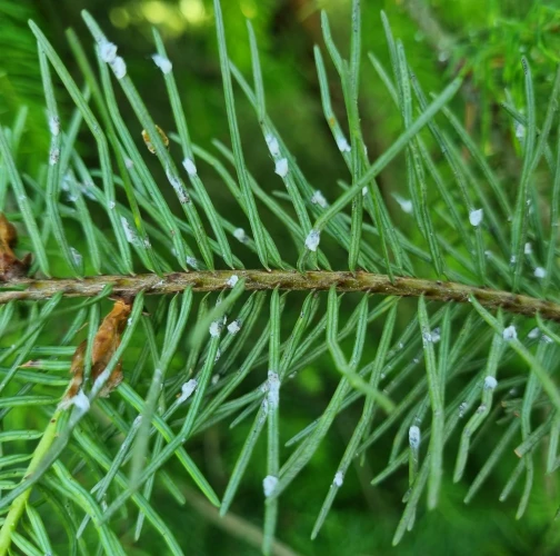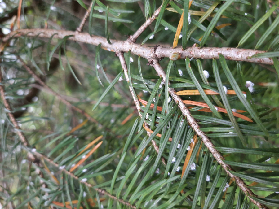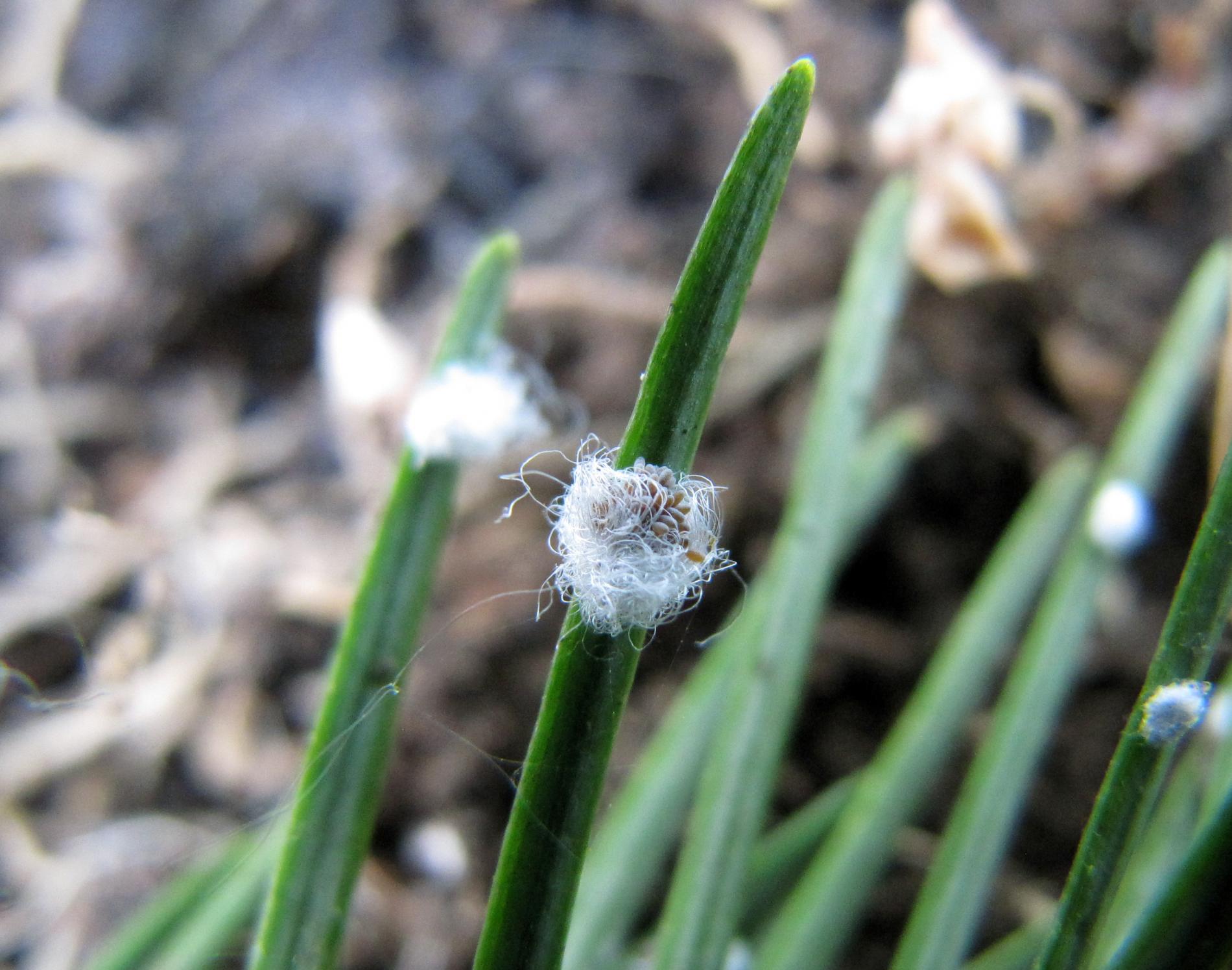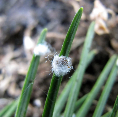 Malé chumáčiky vatovitej hmoty, ktorými sú ihlice doslova posiate.