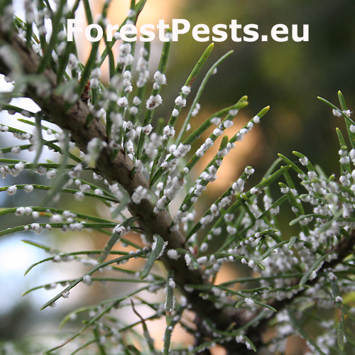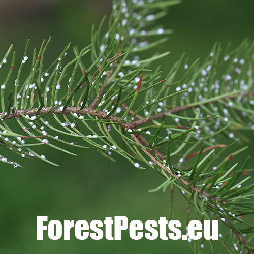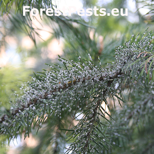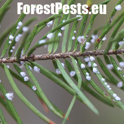 Najznámejší škodca duglasiek. Larvy prezimujú na ihliciach a na jar začnú tvoriť malé chumáčiky vatovitej hmoty, ktorými sú potom ihlice doslova posiate. V máji kladie pod chumáčikom „vaty“ okolo 300 vajíčok z ktorých sa vyliahne nová generácia. Časť potomstva prechádza na kmeň, časť saje na nových ihliciach, ktoré môžu vážne poškodzovať. V mieste sania vzniká malá žltá škvrna, ihlice žltnú a opadávajú. Tento druh pochádza zo Severnej Ameriky, a v polovici 19. storočia sa dostal tiež do Európy. Vo svojej domovine má dvoch hostiteľov, smrek pichľavý a duglasku. Smrek je primárnym hostiteľom, kde sa na jar vytvárajú hálky, v ktorých sa vyvinú okrídlené samice. Tieto v lete migrujú na duglasku. Na douglaske prezimuje a partenogenicky sa množí niekoľko generácií. V Európe má väčšinou len jedného hostiteľa.