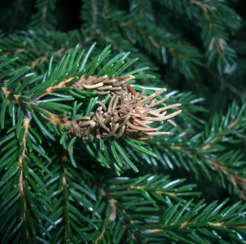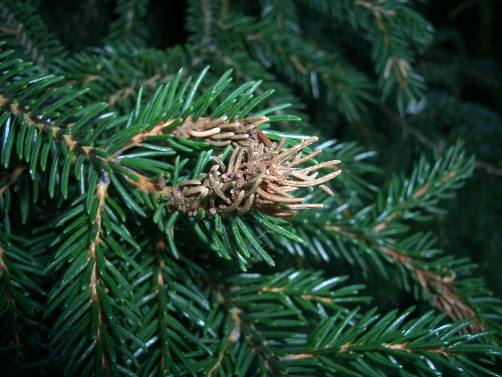 Na smrekoch sa tvoria hálky na koncových výhonkoch so zväčšenými ihlicami. Na boroviciach sú napadnuté staršie ihlice s deformáciami a zmenami farby.