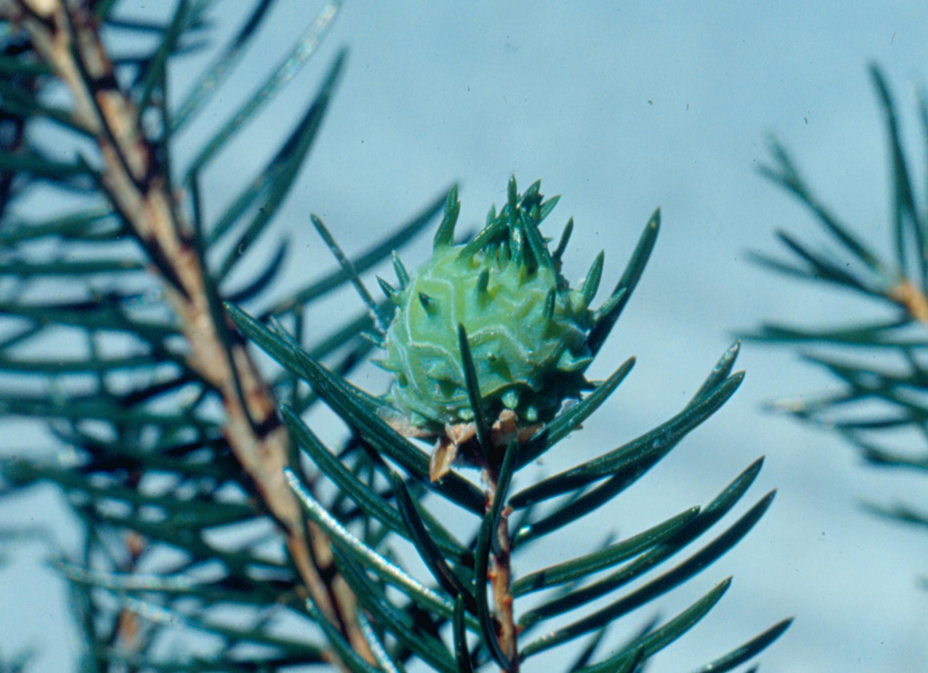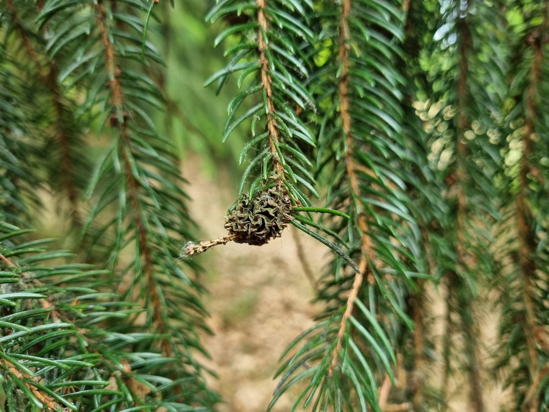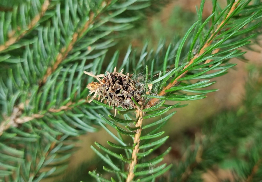 Asi 1 cm veľká hálka na konci vetvičky.