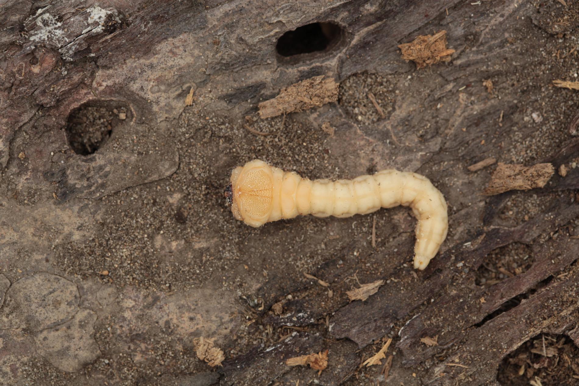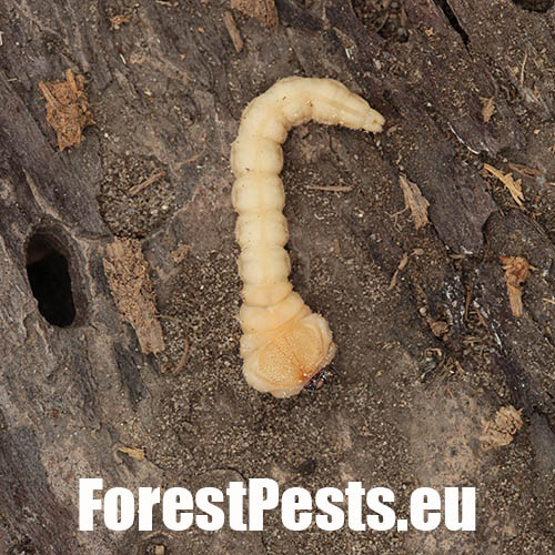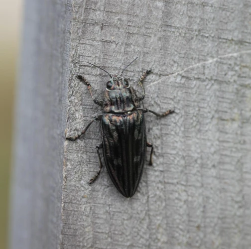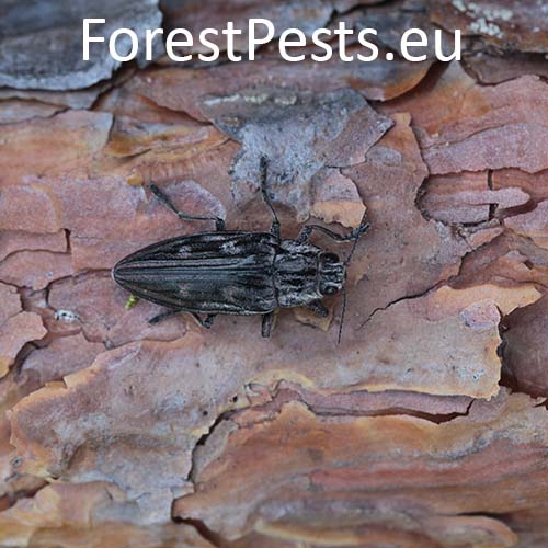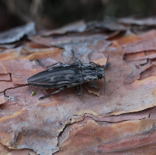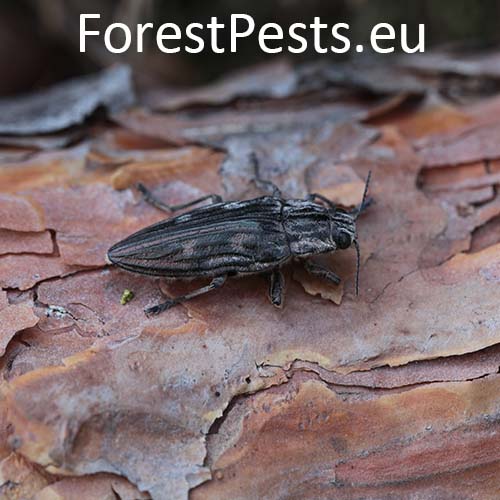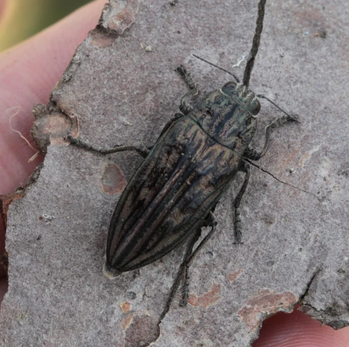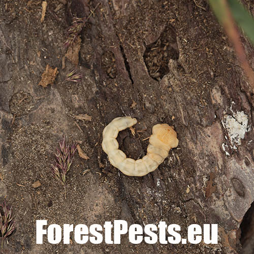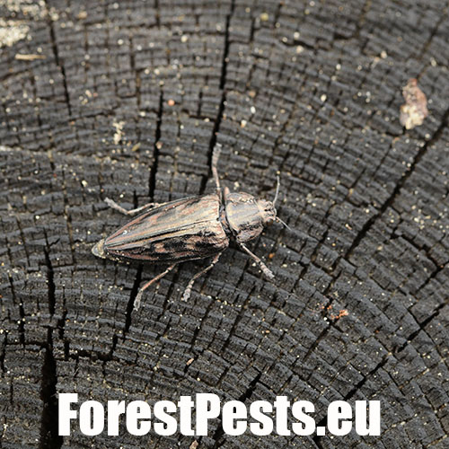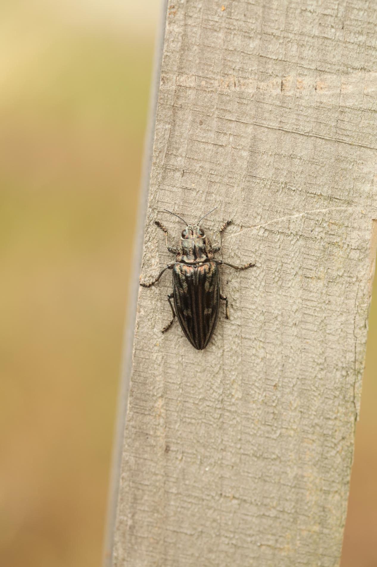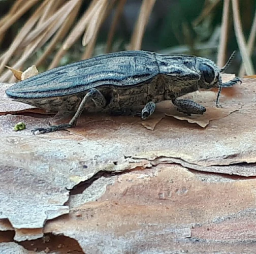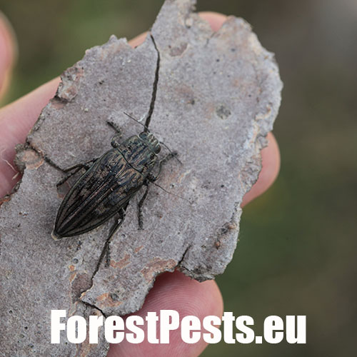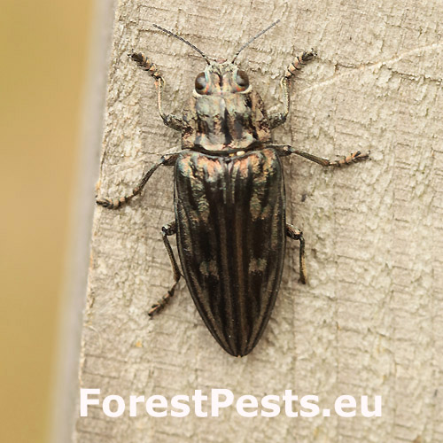 Veľký kovovolesklý chrobák. Veľké požerky a výletové otvorory na kmeňoch.