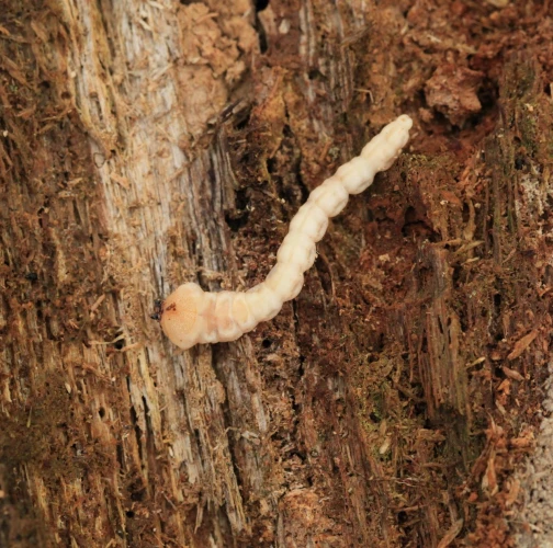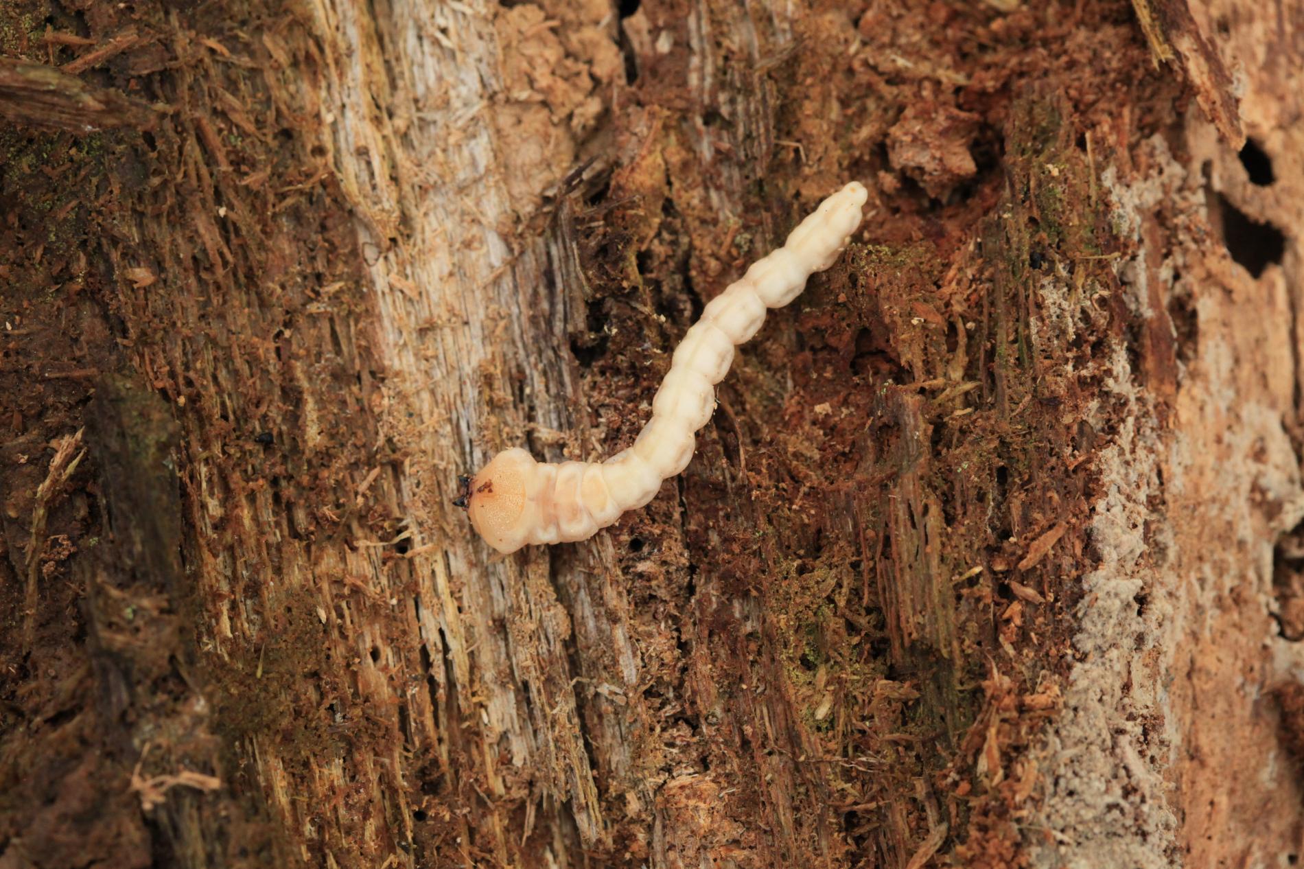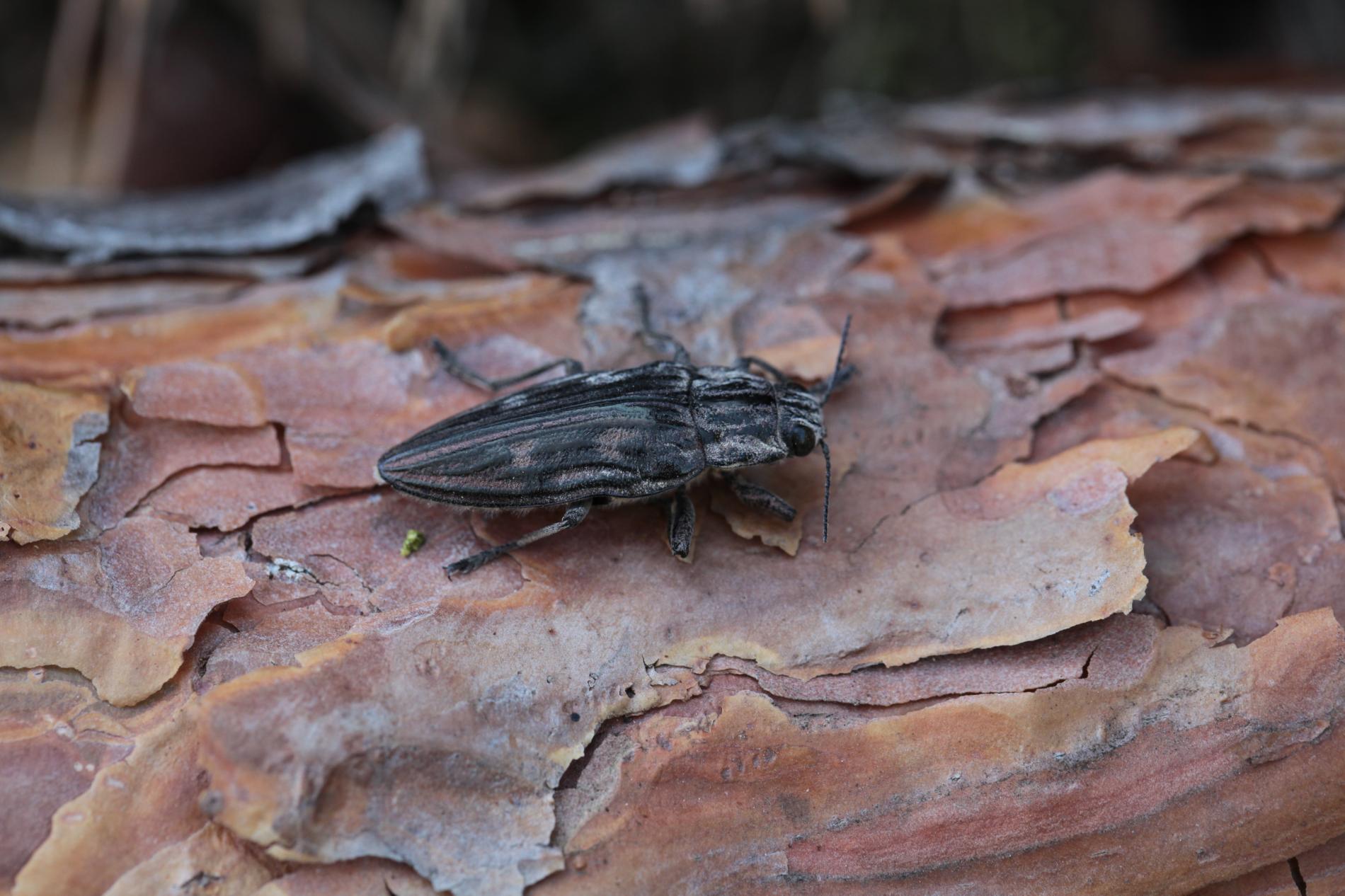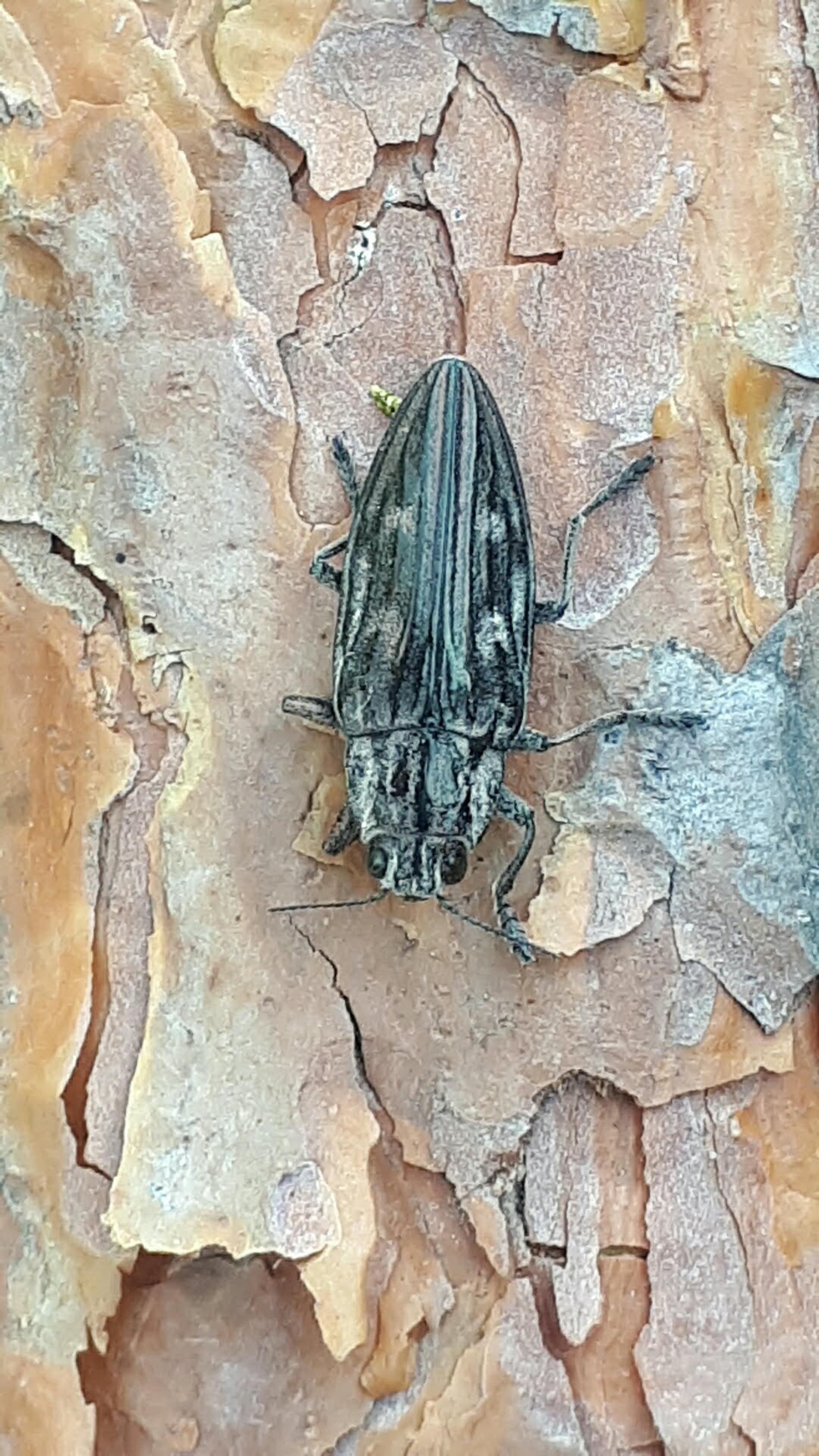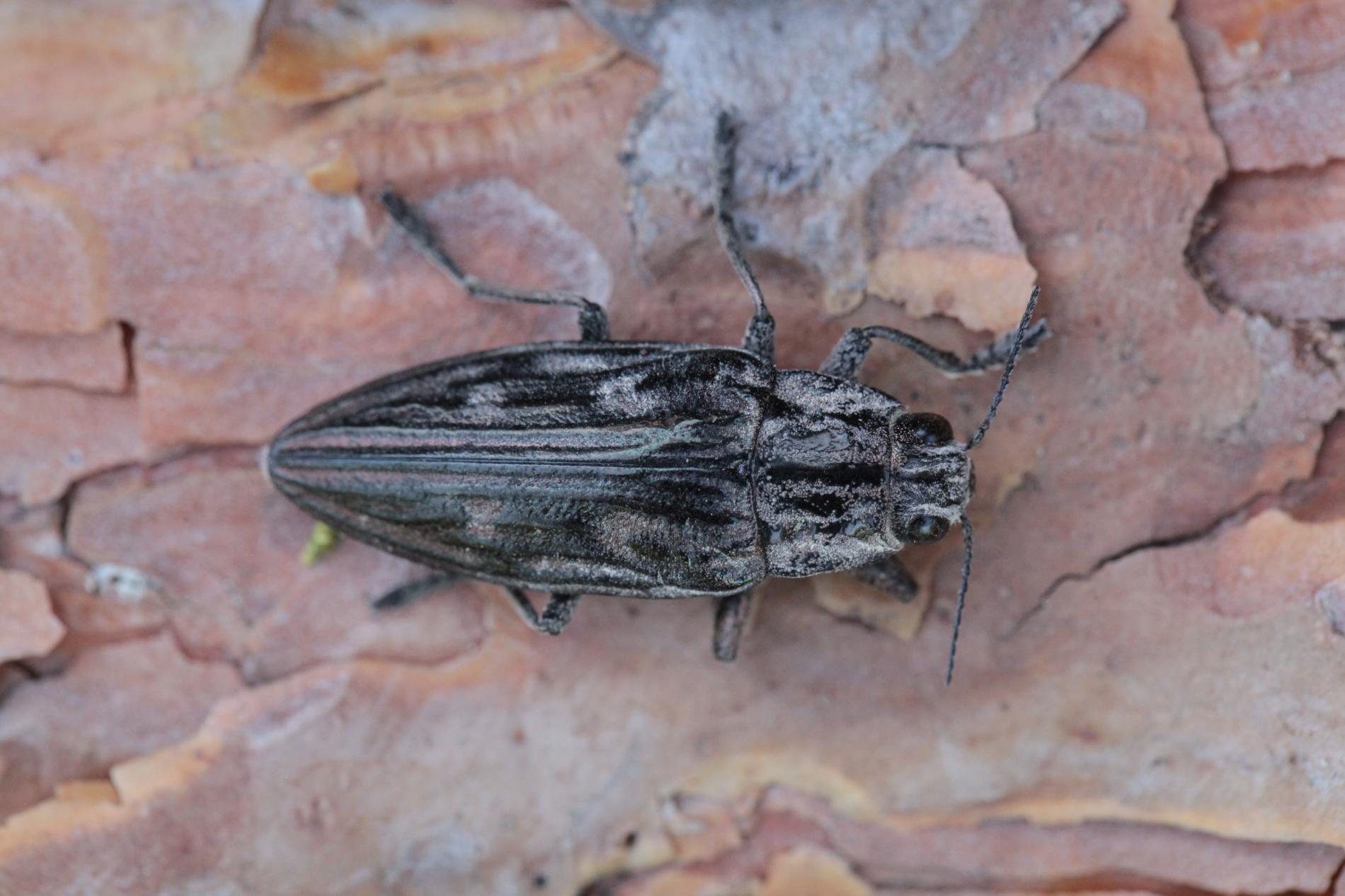 Veľký kovovolesklý chrobák. Veľké požerky a výletové otvorory na kmeňoch.