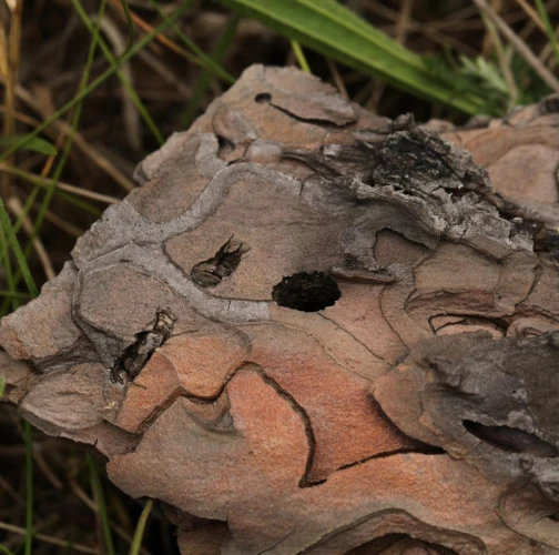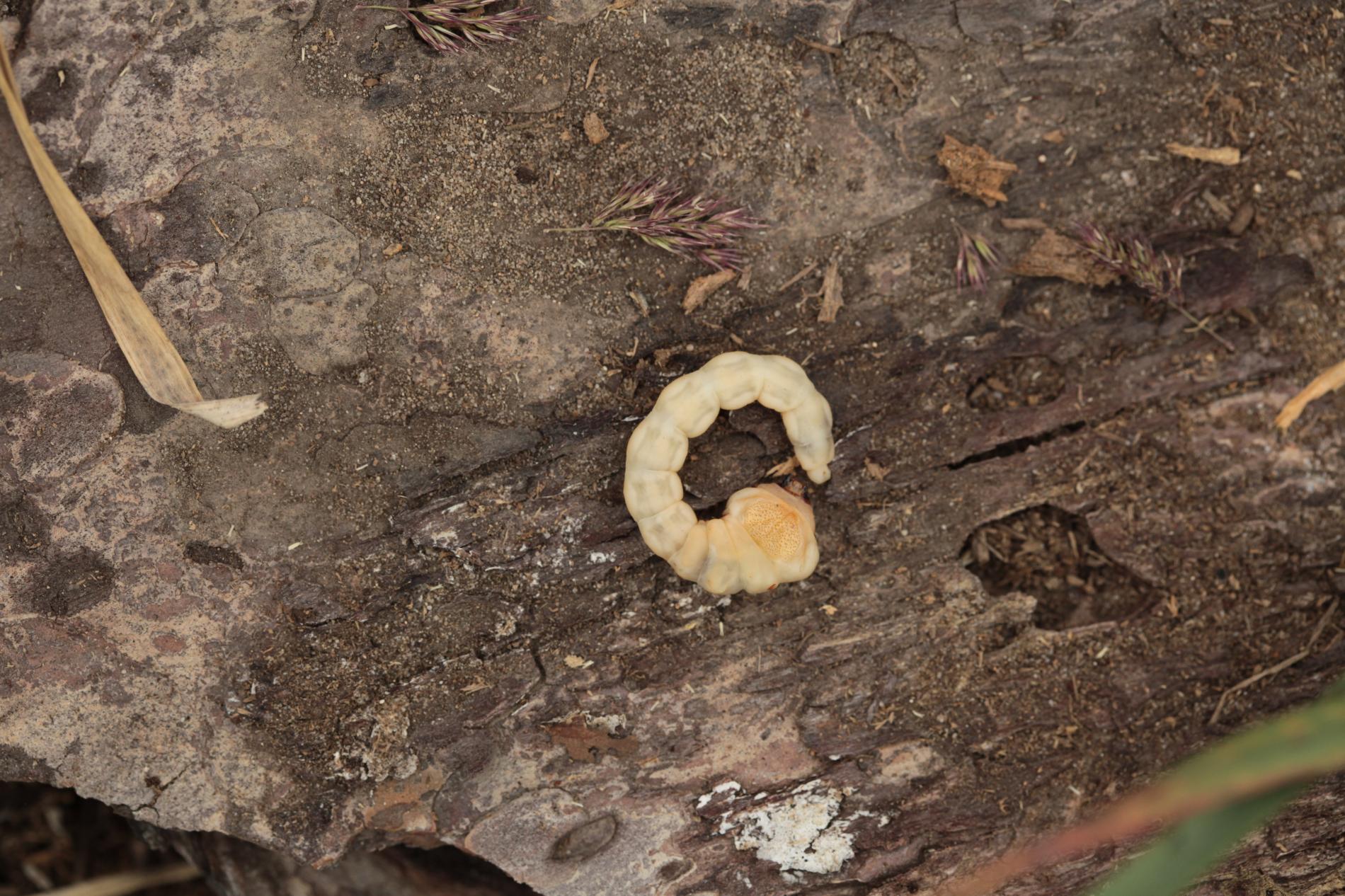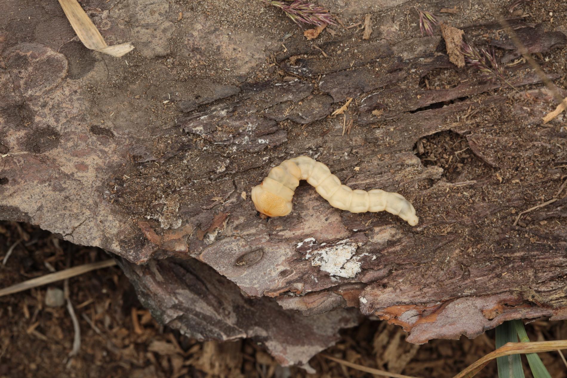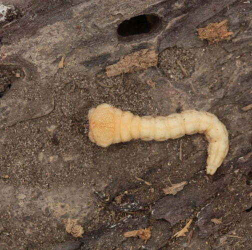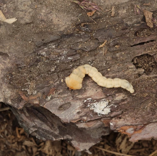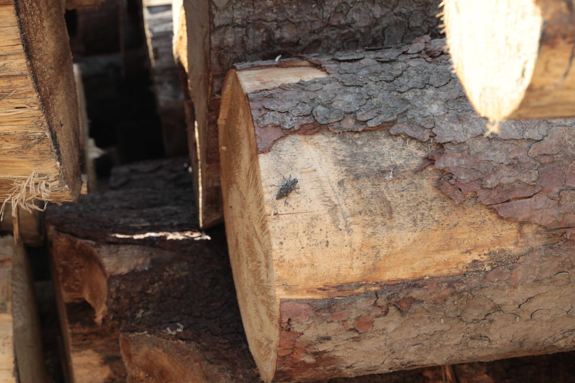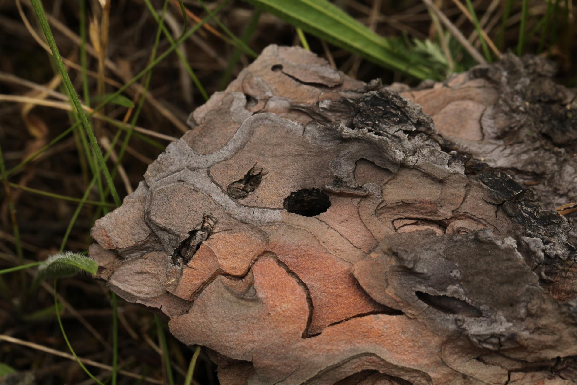Veľký kovovolesklý chrobák. Veľké požerky a výletové otvorory na kmeňoch.