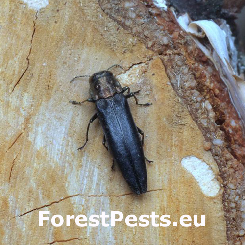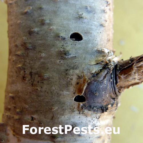 Pod kôrou sú kľukaté chodby. Na kmeni a konároch sú výletové otvory v tvare písmena D. Kôra praská a uvoľňuje sa, koruna redne.