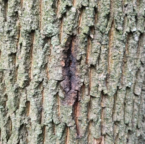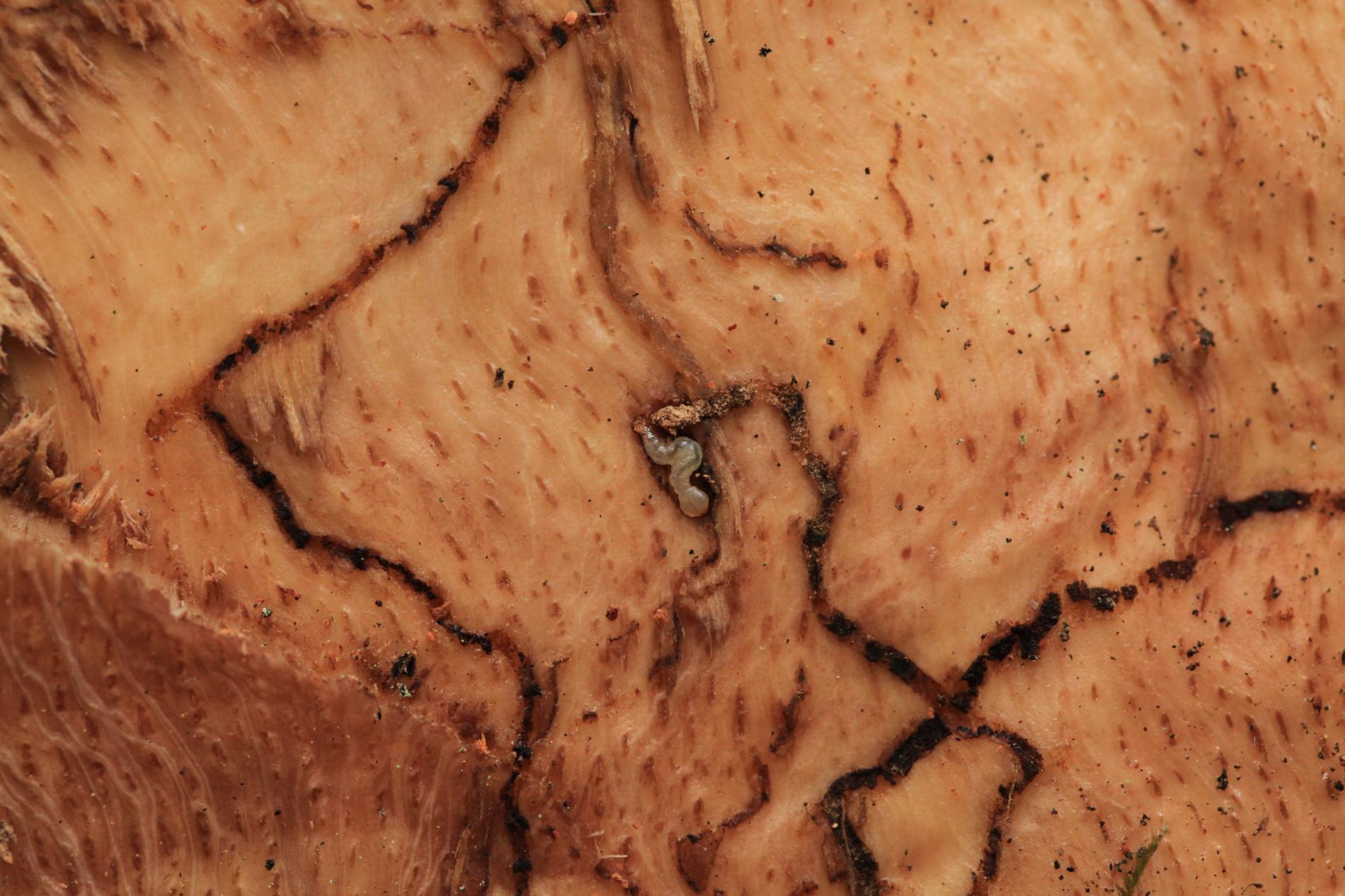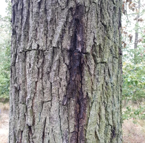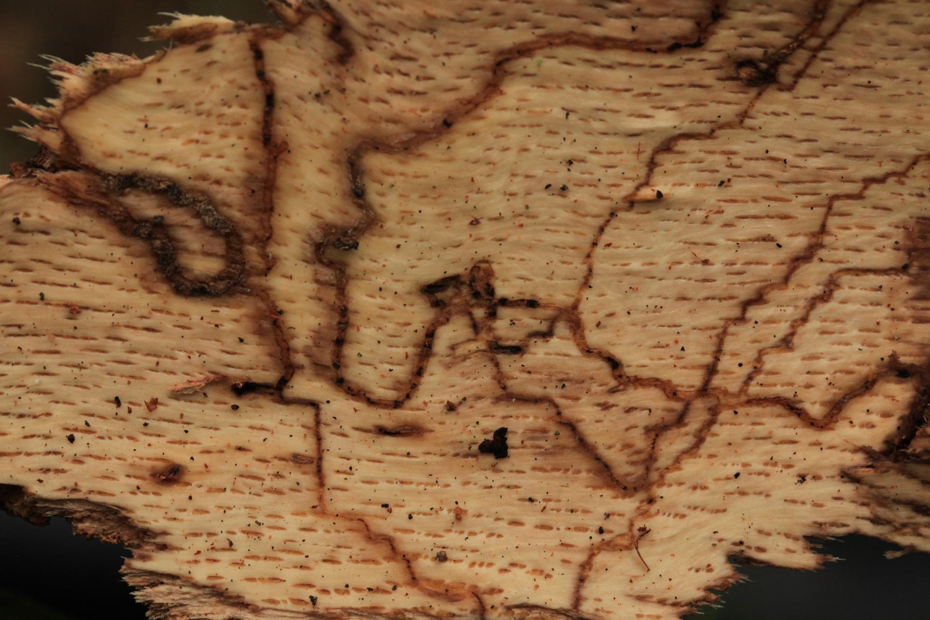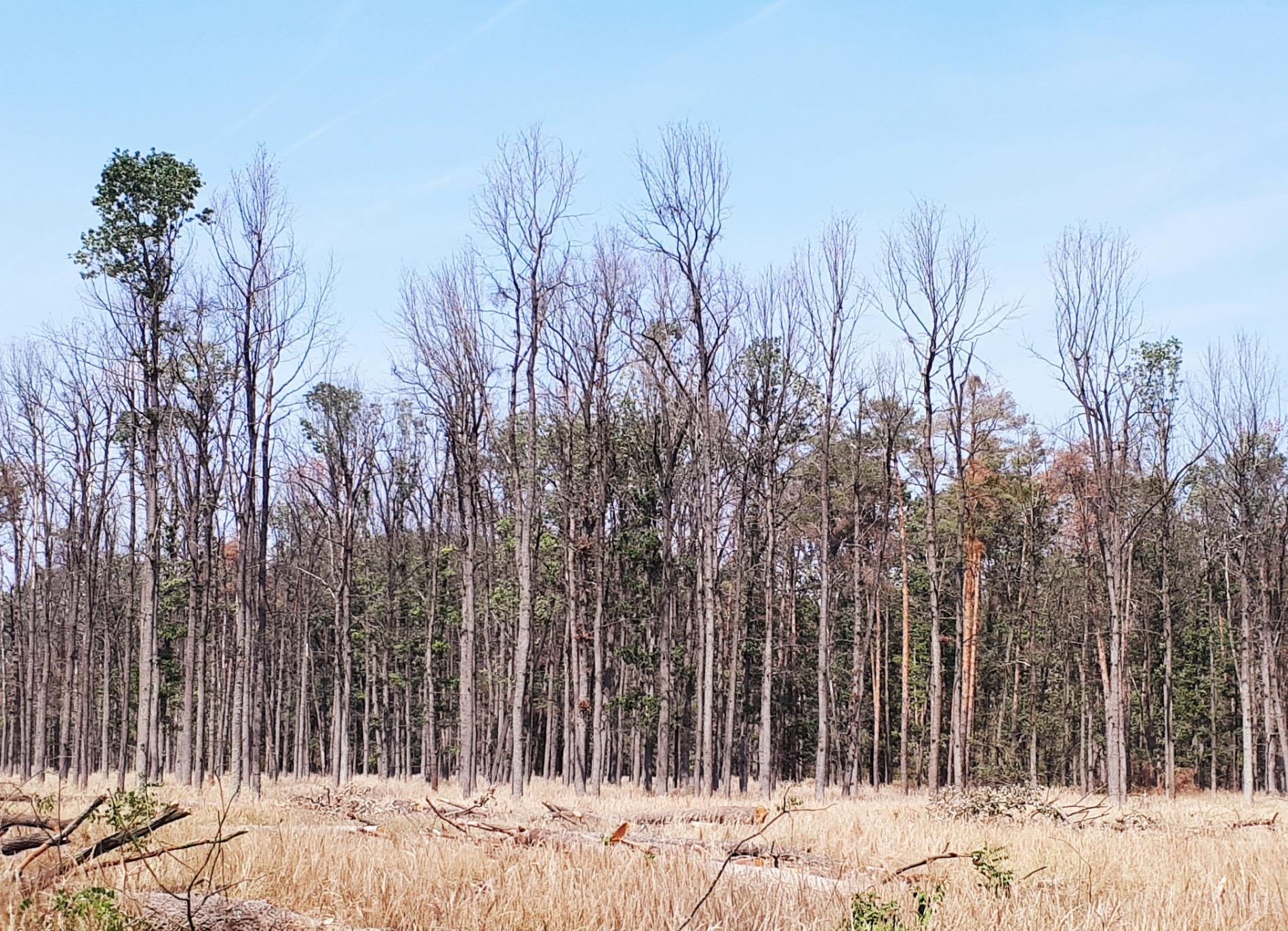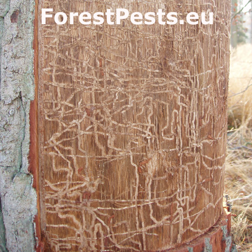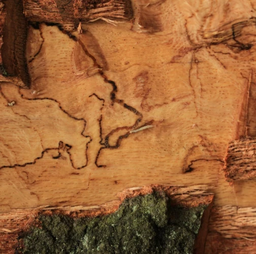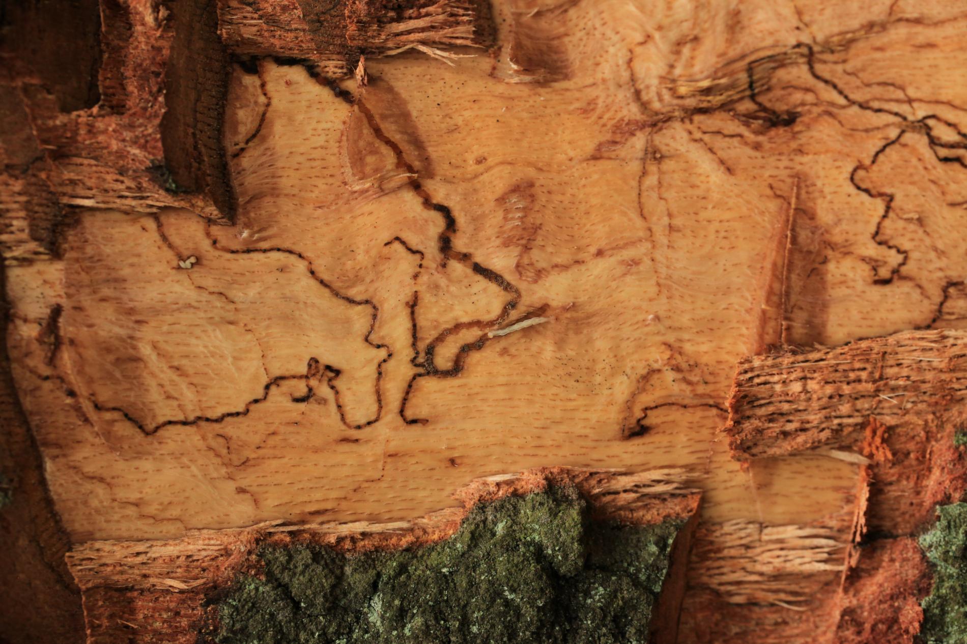 Úzke chodby pod kôrou. Odumreté časti korún, koruny alebo celé stromy.