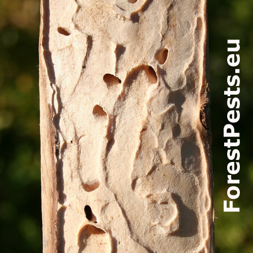 Elipsovité chodby na tenších ihličnatých kmeňoch.