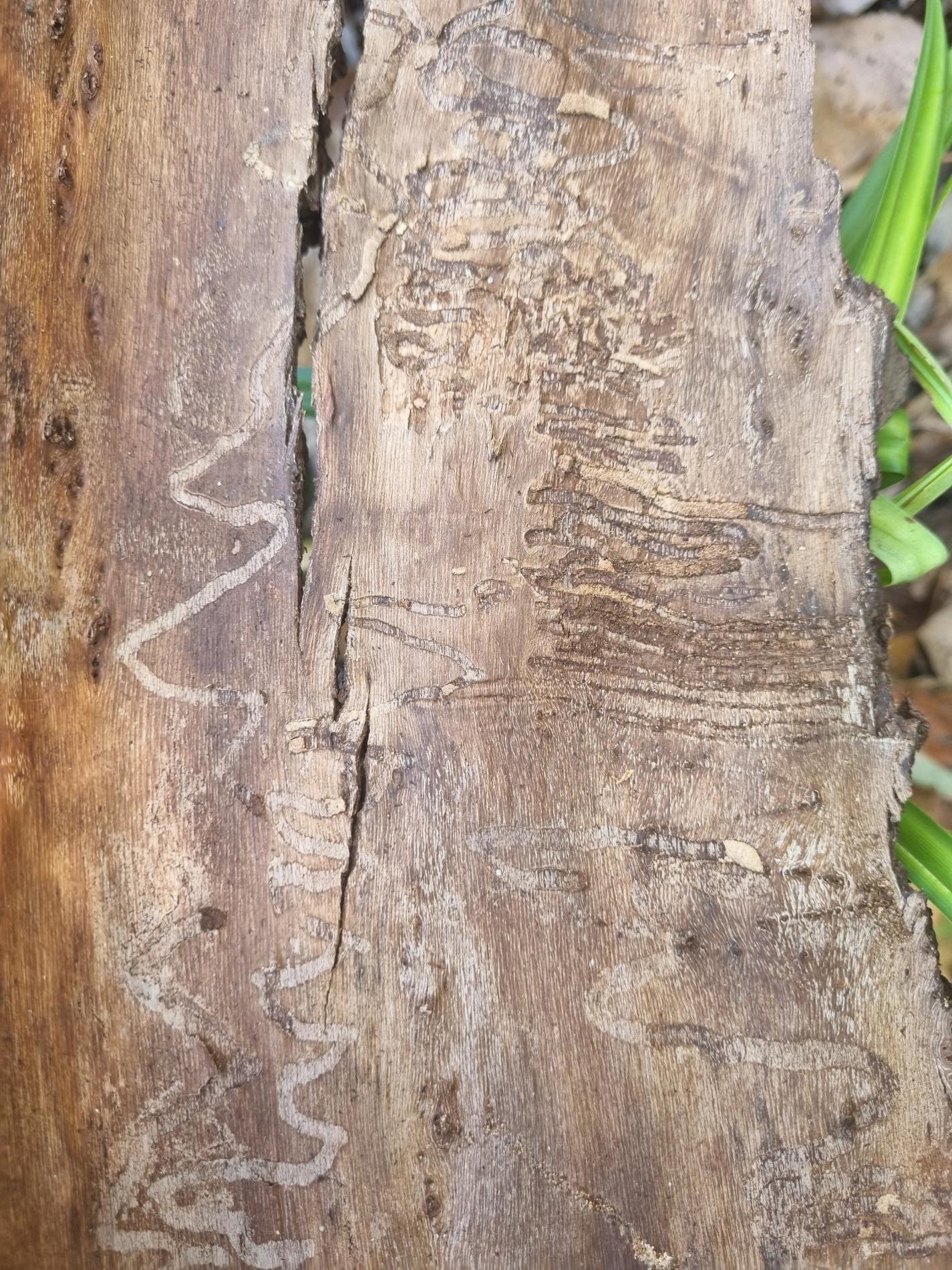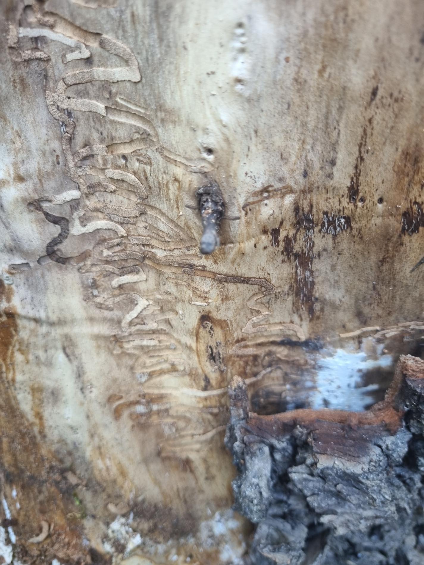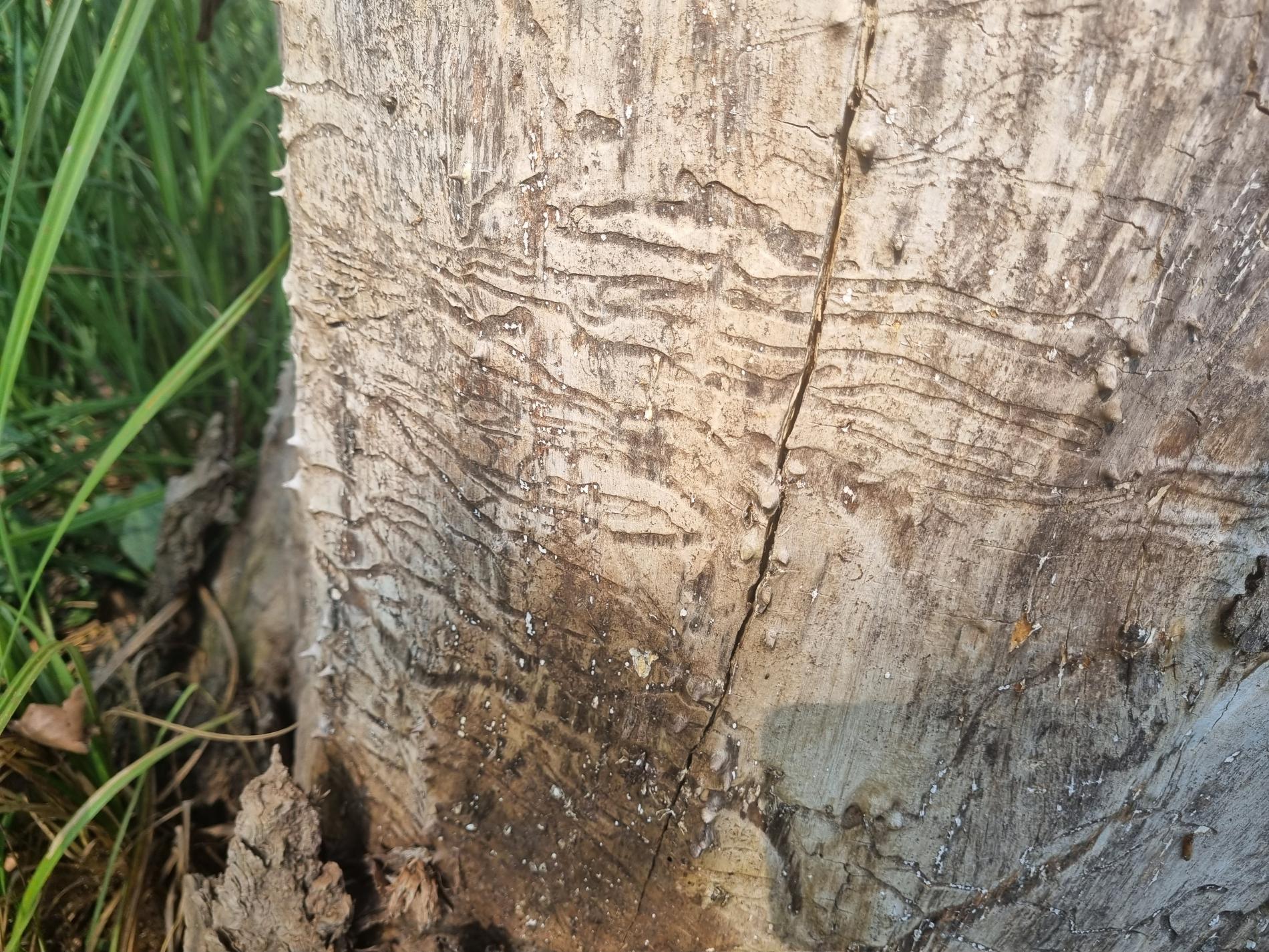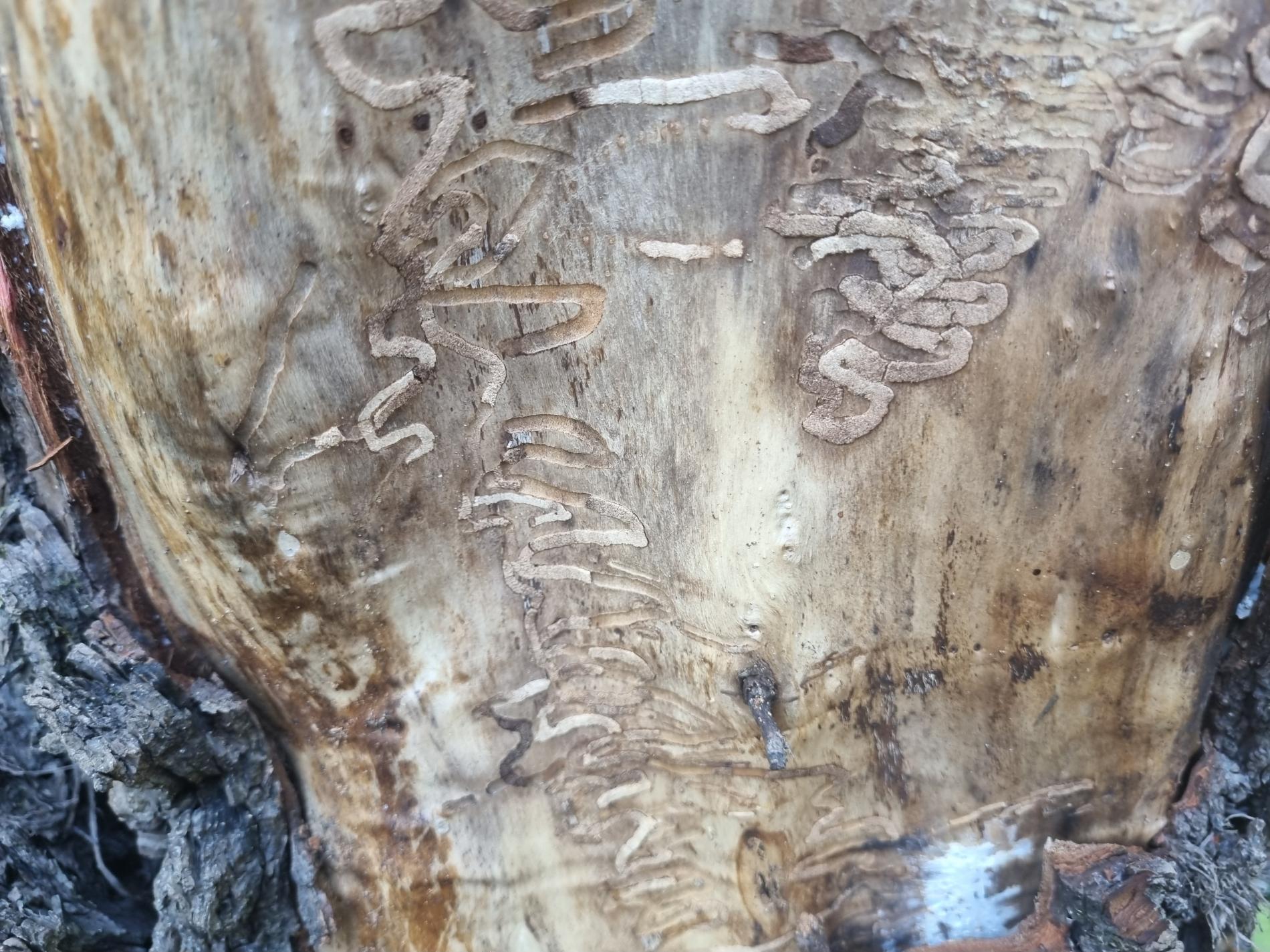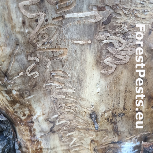 Medzi viditeľné známky napadnutia patria výletové otvory a veľké hadovité galériepožerky pod kôrou.